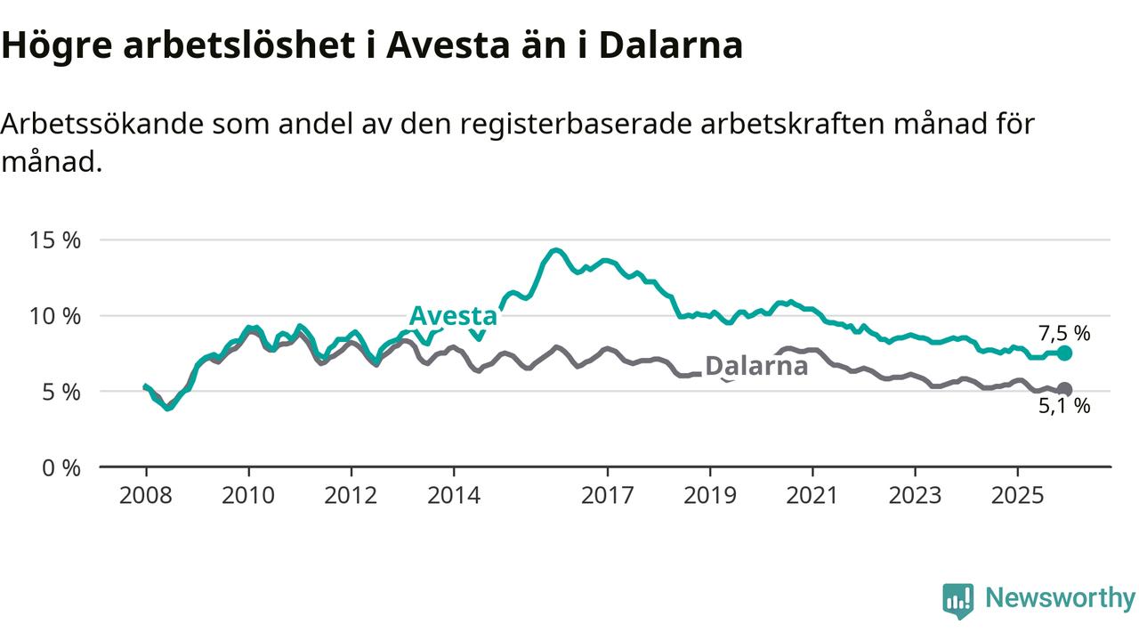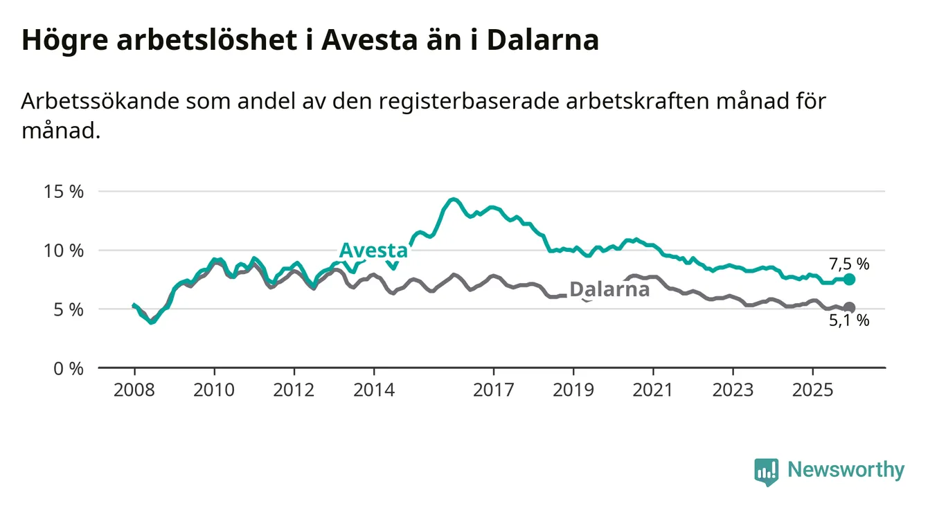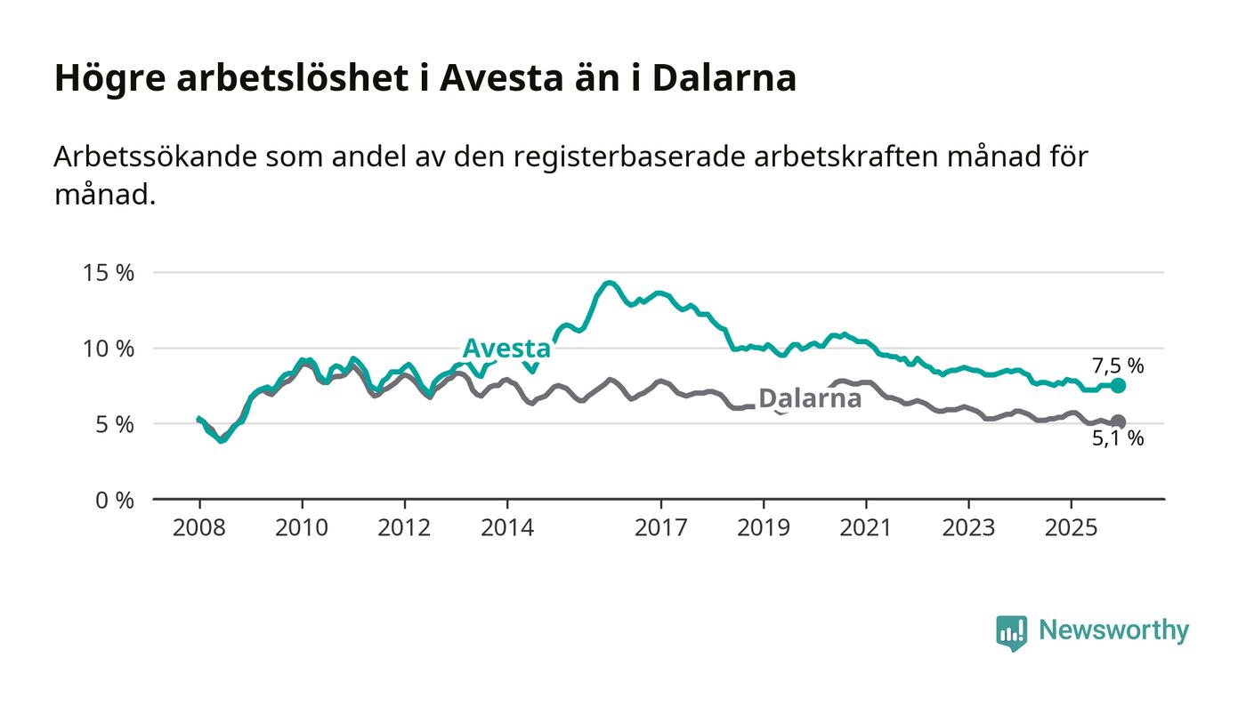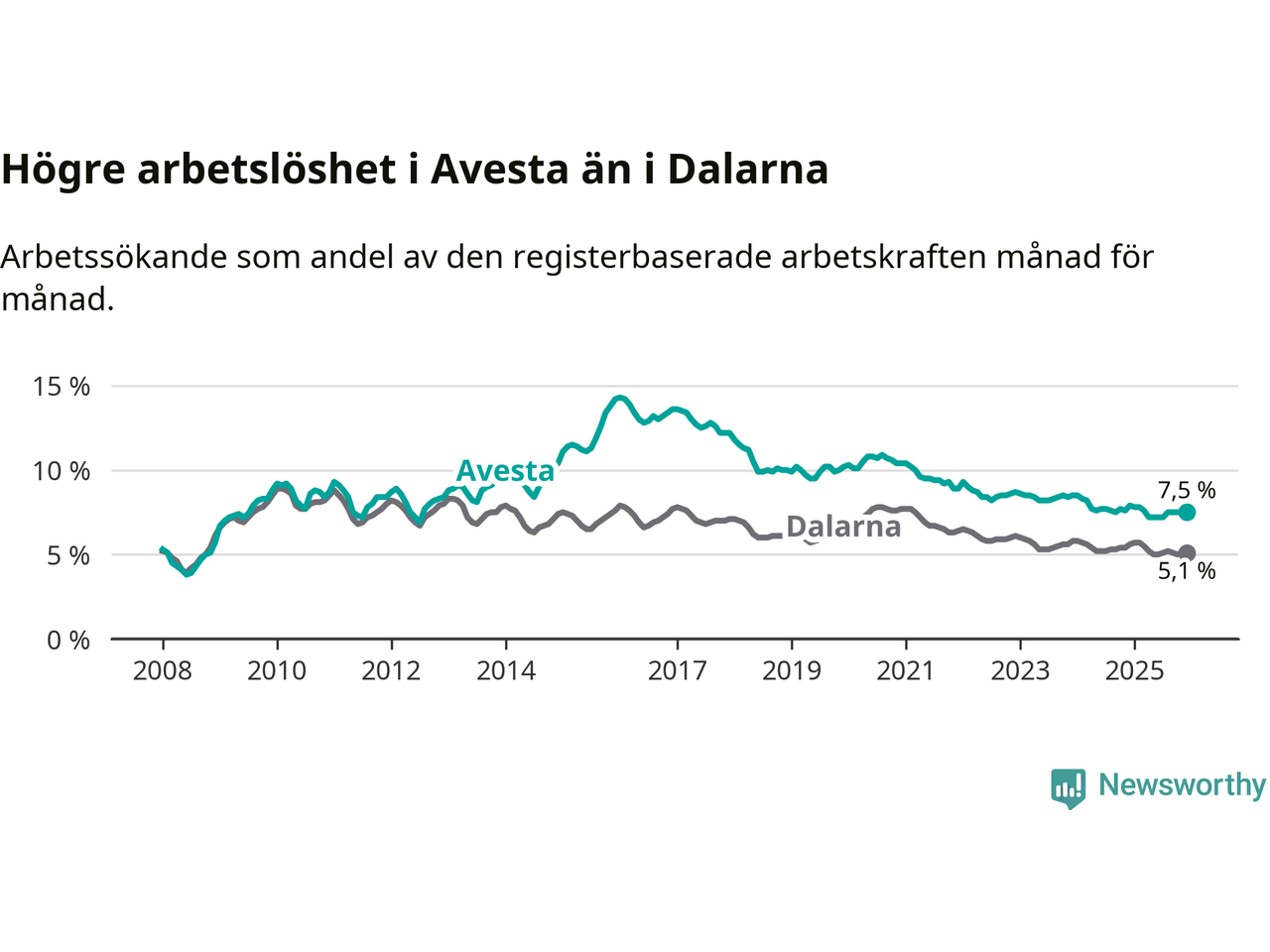 Under december månad rapporterade Avesta kommun en total arbetslöshet på 7,5 procent. Det är en minskning jämfört med samma tidpunkt i fjol (−0,4 procentenheter). Även i Dalarnas län sjunker arbetslösheten .