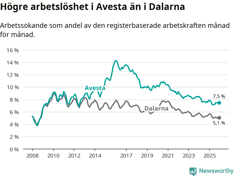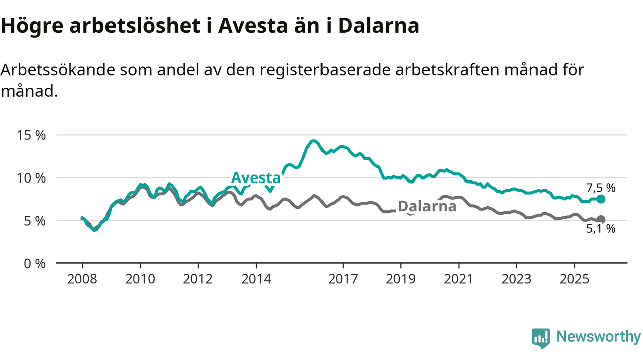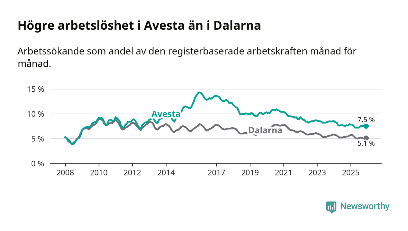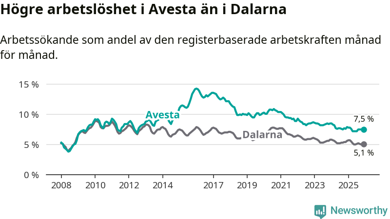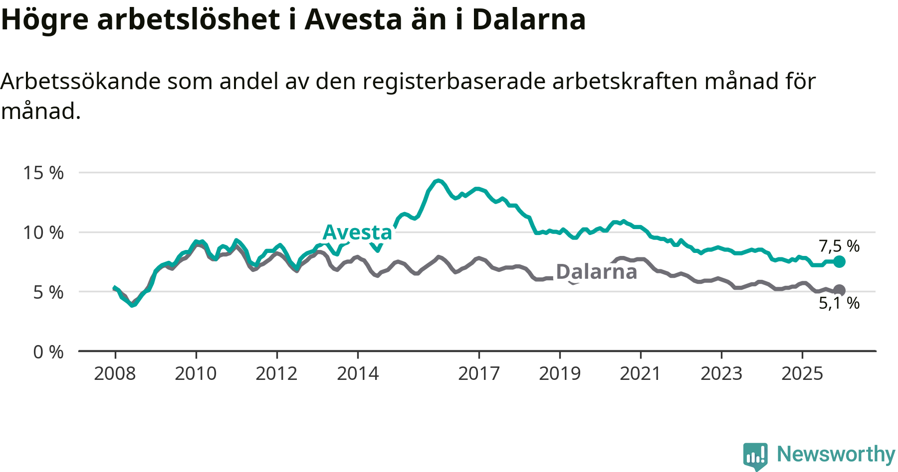 Under december månad rapporterade Avesta kommun en total arbetslöshet på 7,5 procent. Det är en minskning jämfört med samma tidpunkt i fjol (−0,4 procentenheter). Även i Dalarnas län sjunker arbetslösheten .
