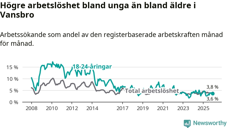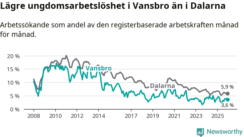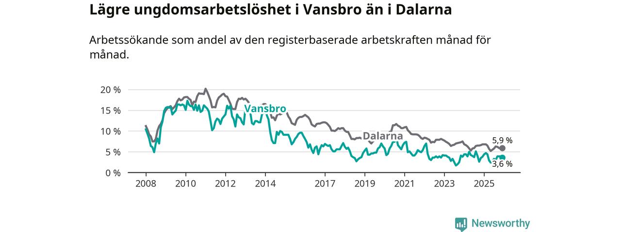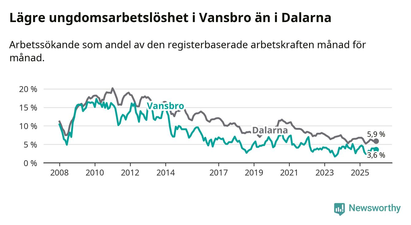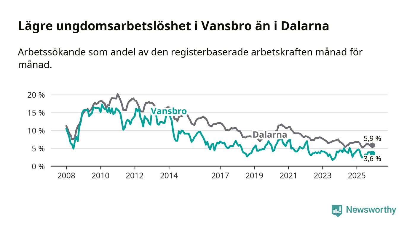 Precis som den totala arbetslösheten ligger ungdomsarbetslösheten i Vansbro lägre än i Dalarna som helhet. Skillnaden mellan kommunen och länet är 2,3 procentenheter.