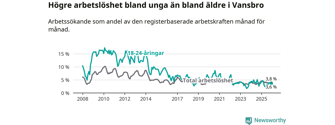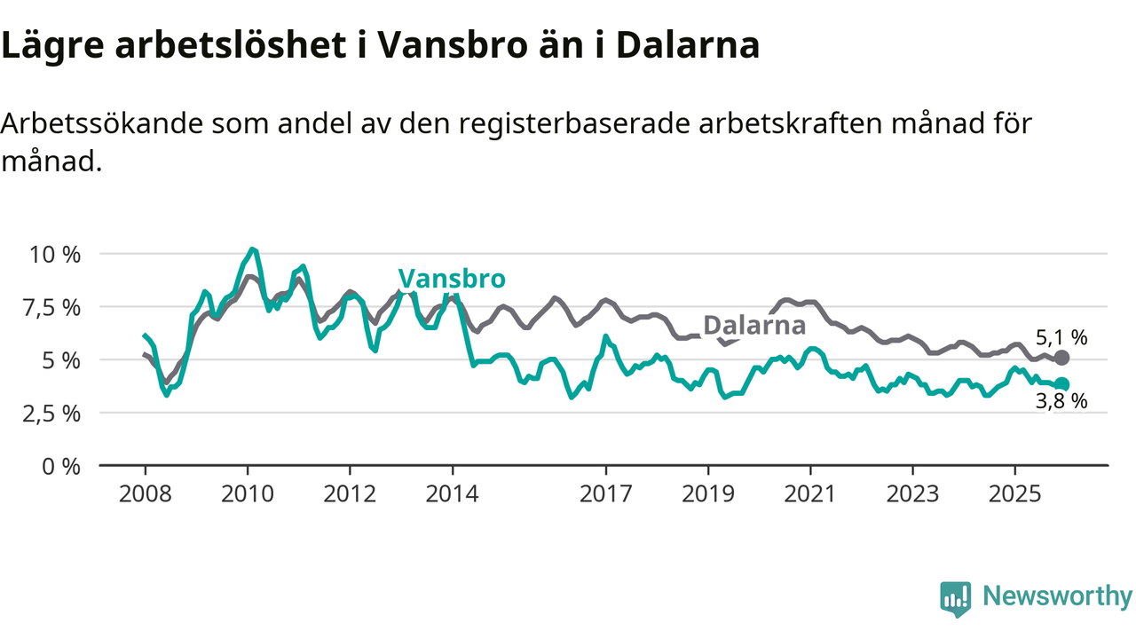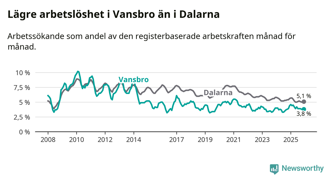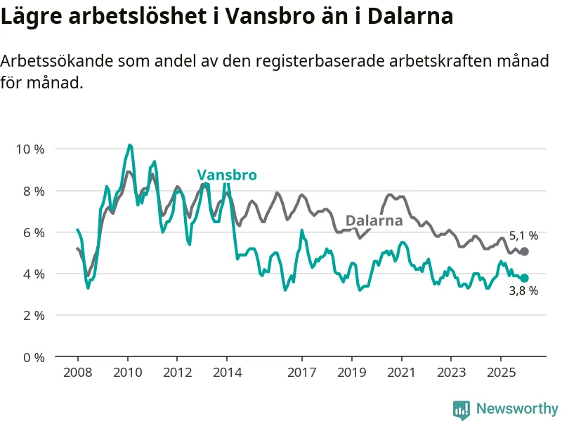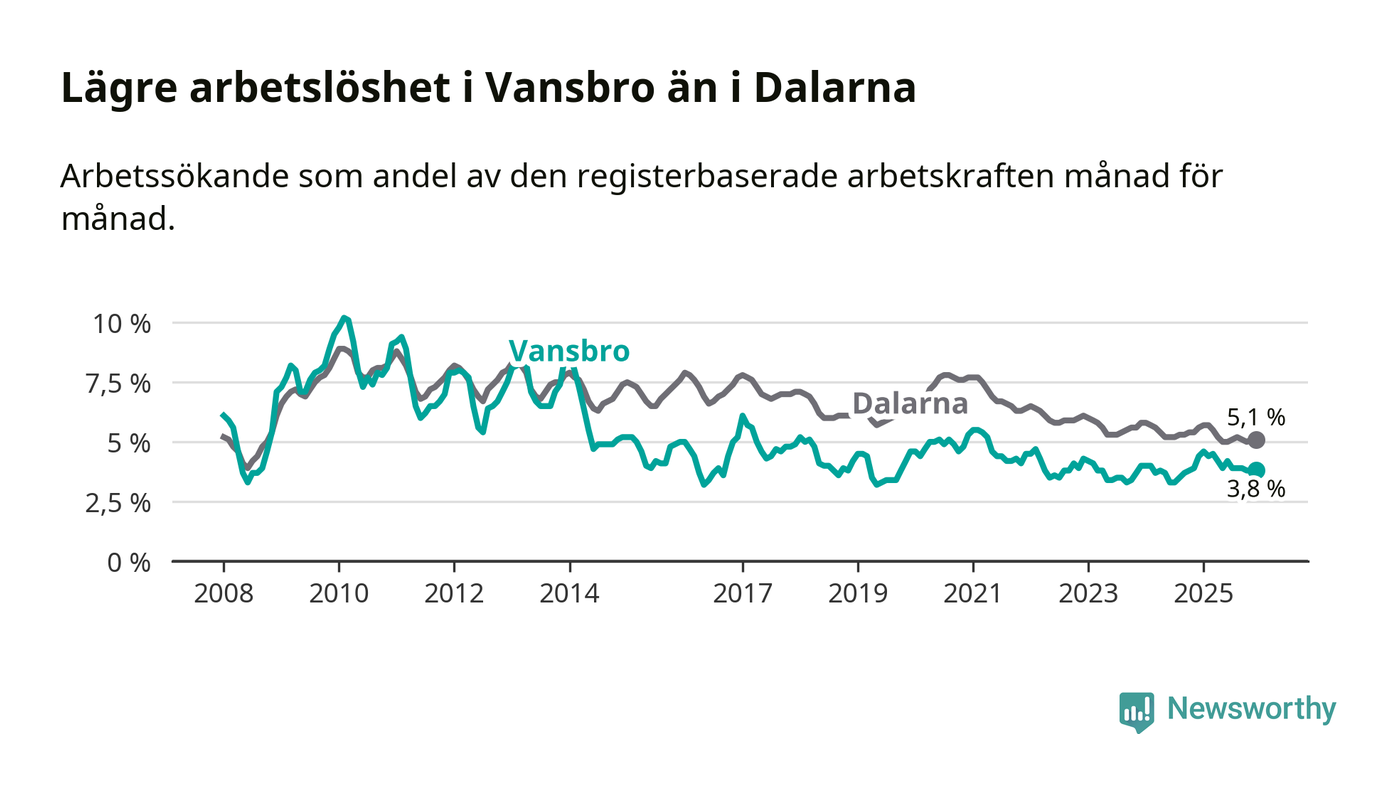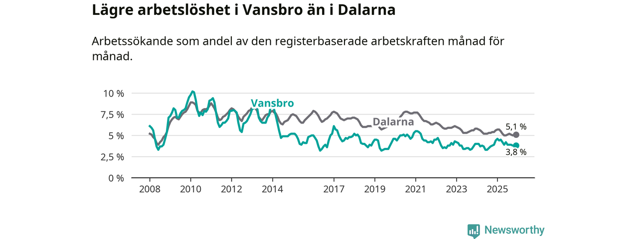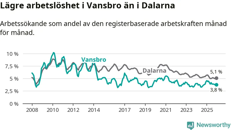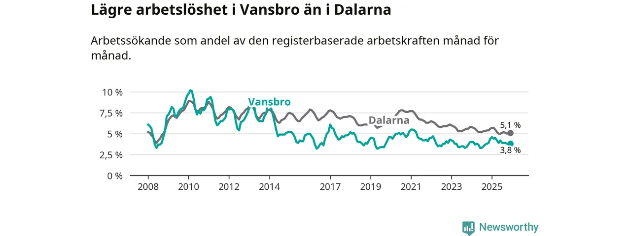 Under december månad rapporterade Vansbro kommun en total arbetslöshet på 3,8 procent. Det är en minskning jämfört med samma tidpunkt i fjol (−0,6 procentenheter). Även i Dalarnas län sjunker arbetslösheten .
