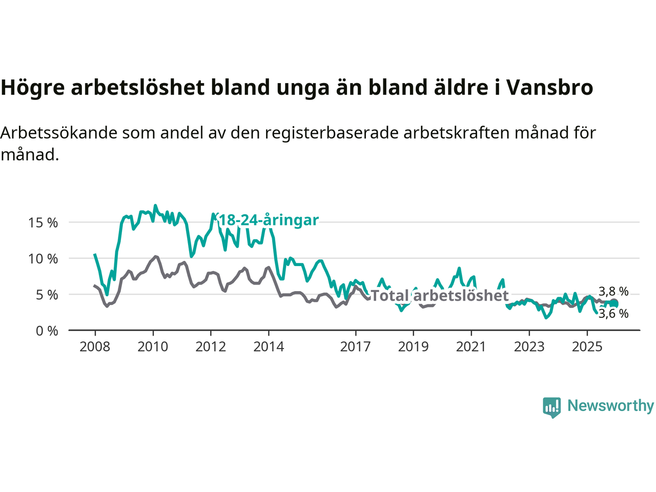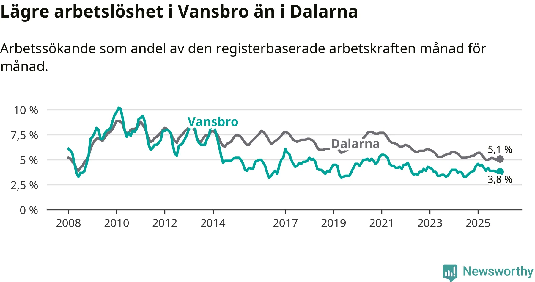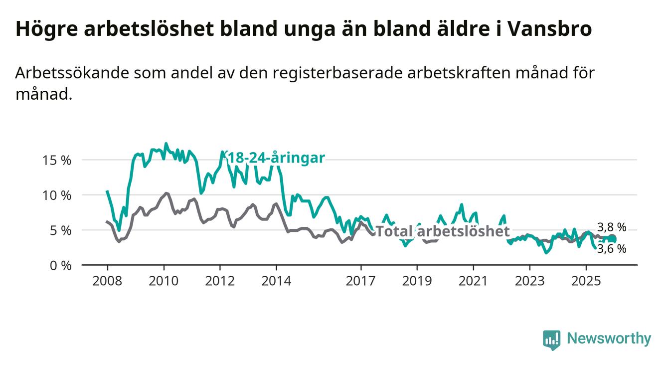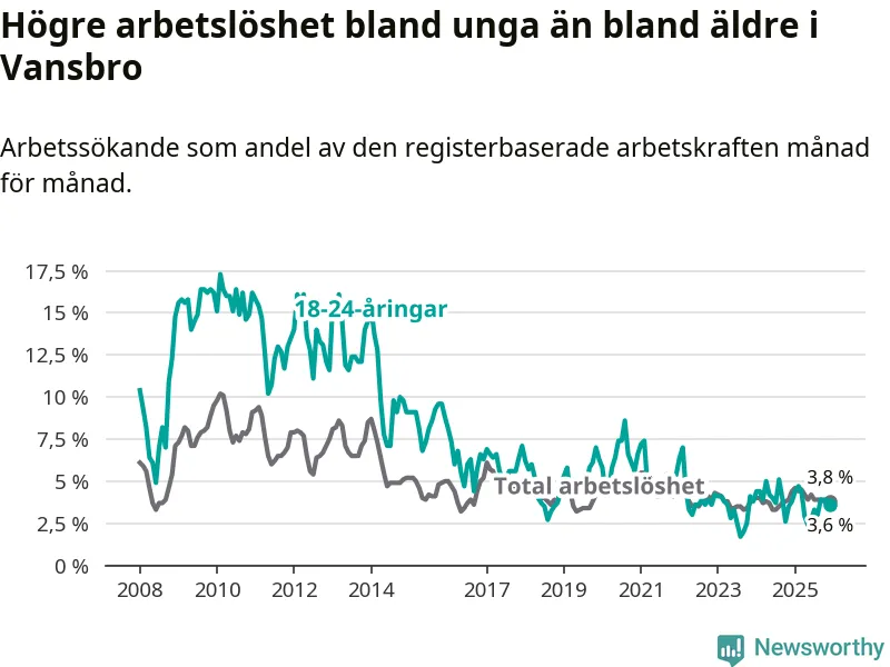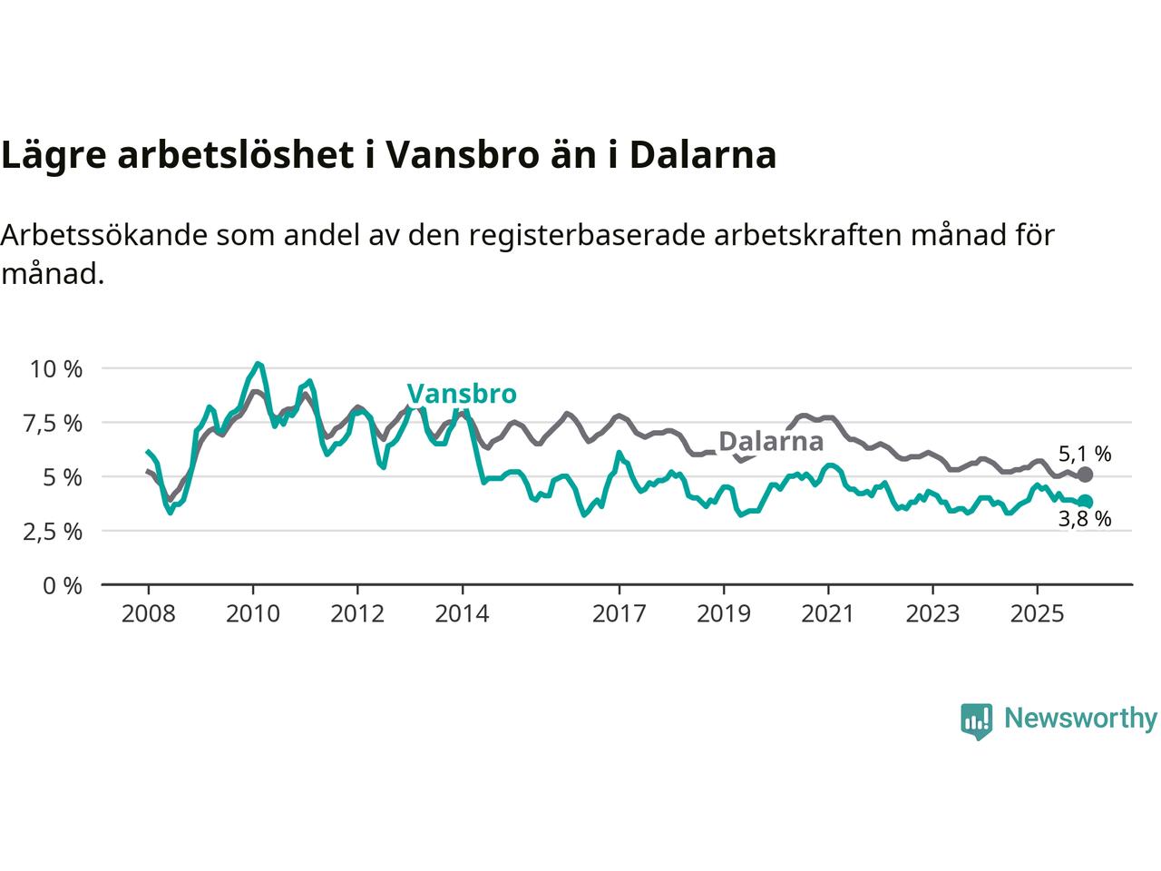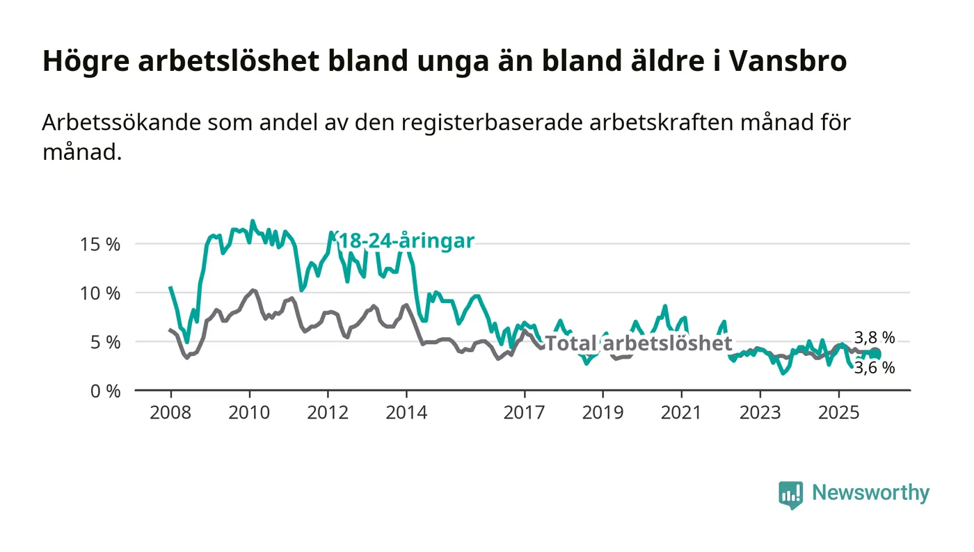Under december månad rapporterade Vansbro kommun en total arbetslöshet på 3,8 procent. Det är en minskning jämfört med samma tidpunkt i fjol (−0,6 procentenheter). Även i Dalarnas län sjunker arbetslösheten .