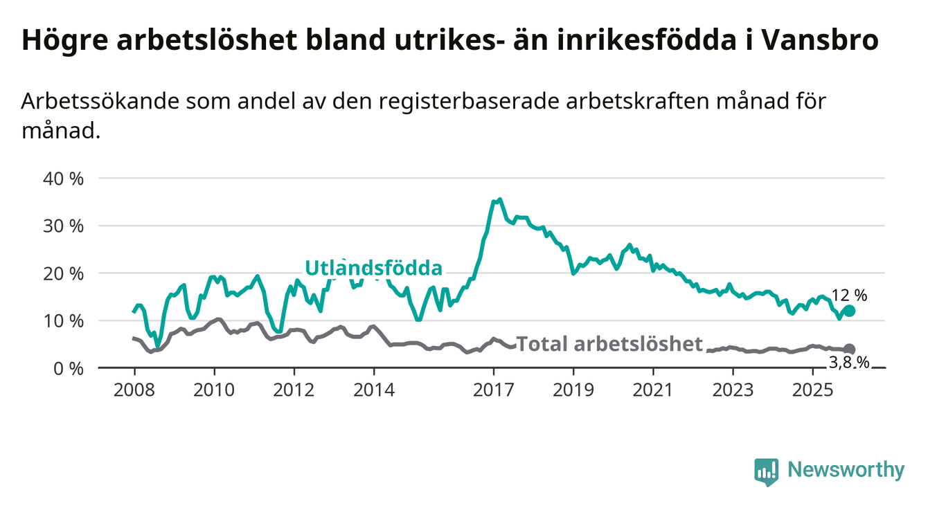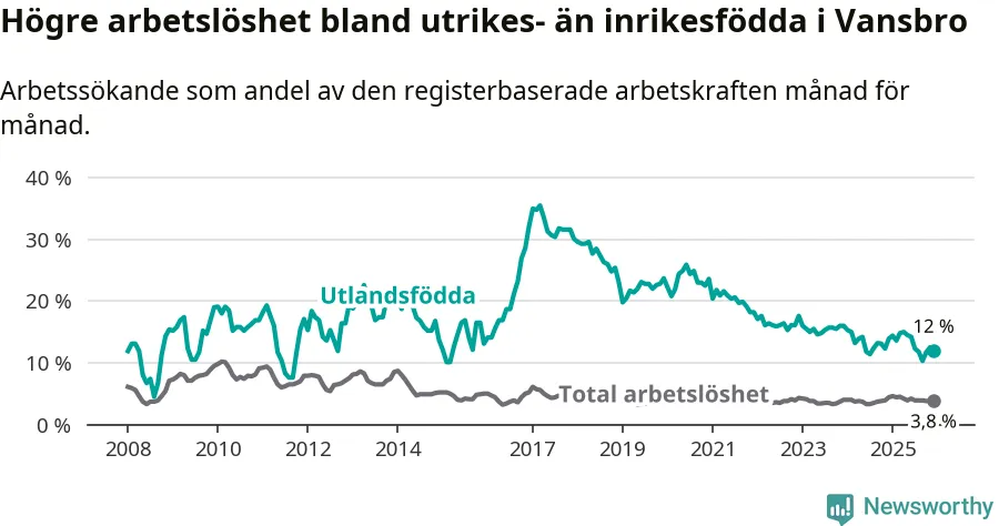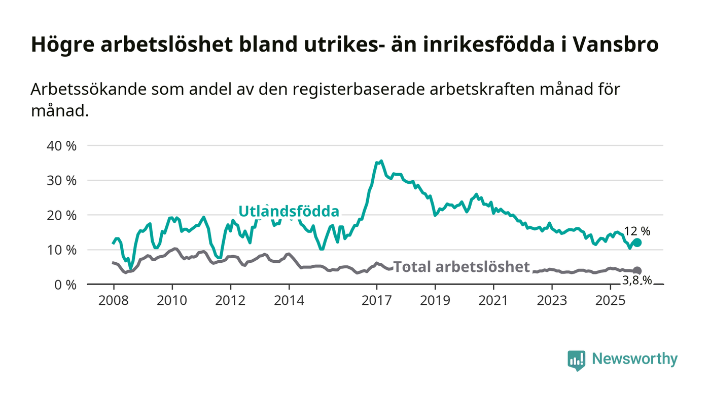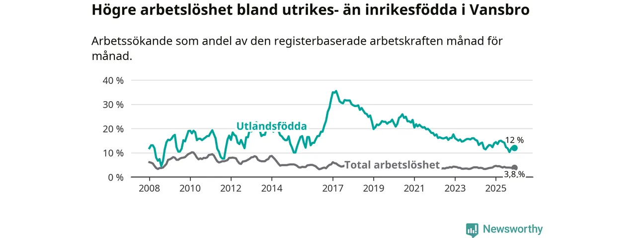 Arbetslösheten bland utlandsfödda var 12,0 procent i Vansbro under december månad, motsvarande 48 av 400 personer. Det är 1,9 procentenheter färre än vid samma tidpunkt i fjol (−6 om man räknar personer). Den senaste månadens nedgång innebär ett trendbrott. Under de ett föregående månaderna hade arbetslösheten bland utlandsfödda varit högre än motsvarande tidpunkt året innan.