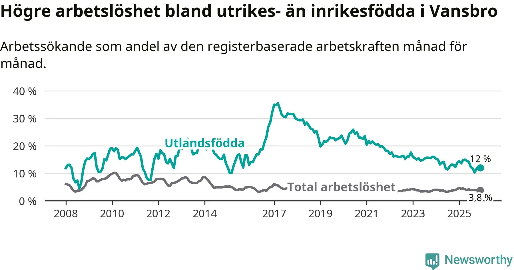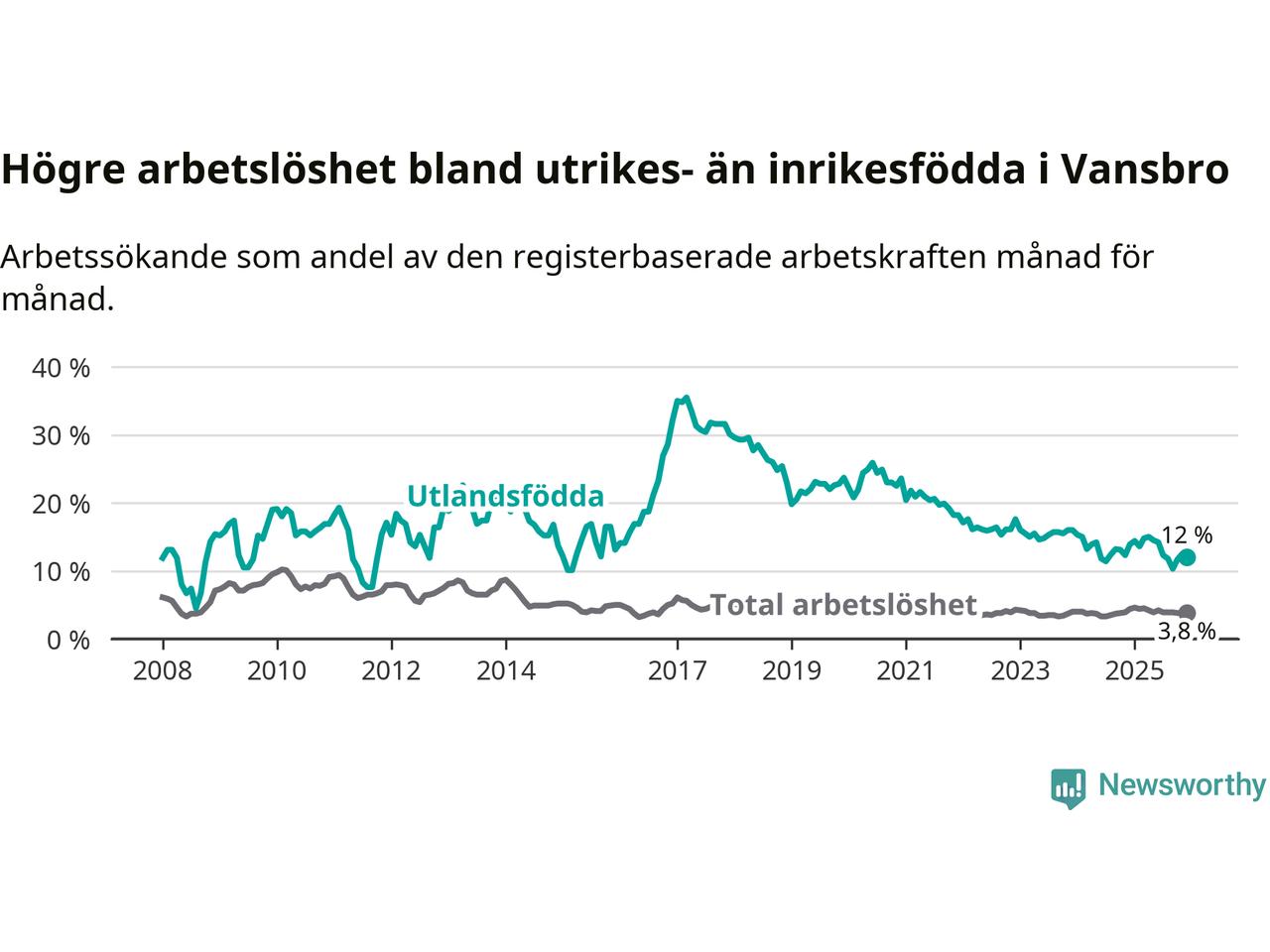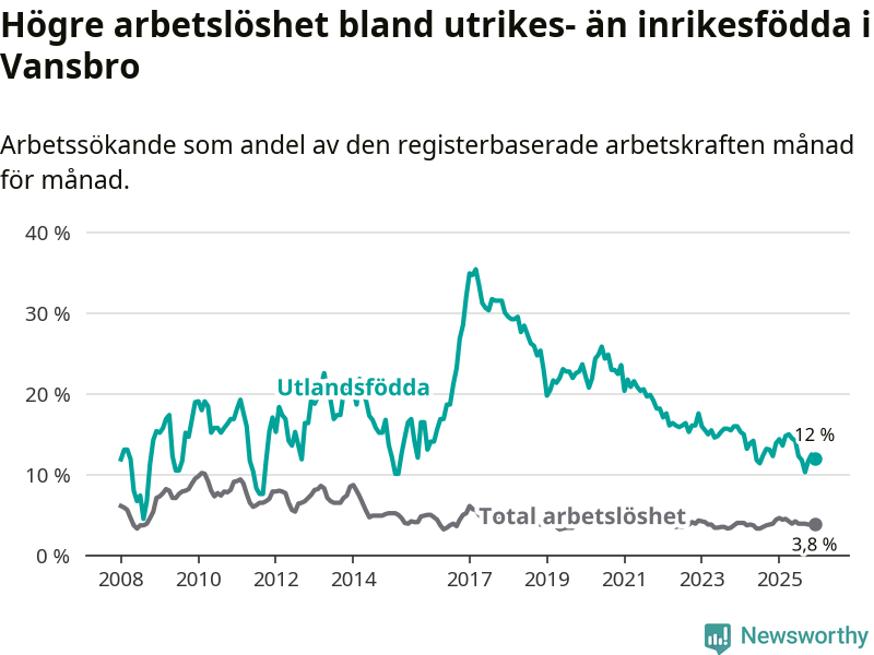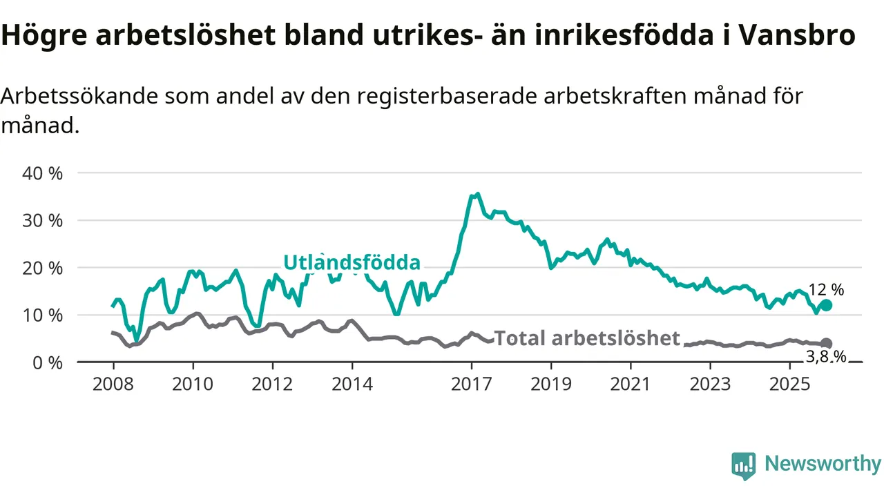 Arbetslösheten bland utlandsfödda var 12,0 procent i Vansbro under december månad, motsvarande 48 av 400 personer. Det är 1,9 procentenheter färre än vid samma tidpunkt i fjol (−6 om man räknar personer). Den senaste månadens nedgång innebär ett trendbrott. Under de ett föregående månaderna hade arbetslösheten bland utlandsfödda varit högre än motsvarande tidpunkt året innan.