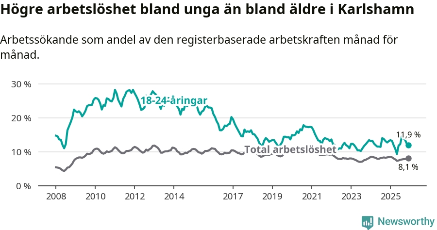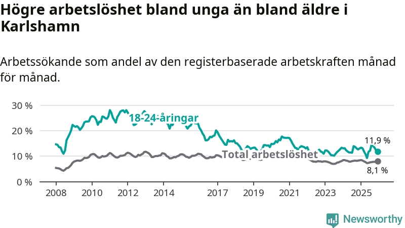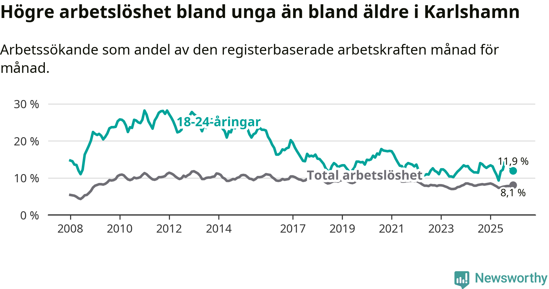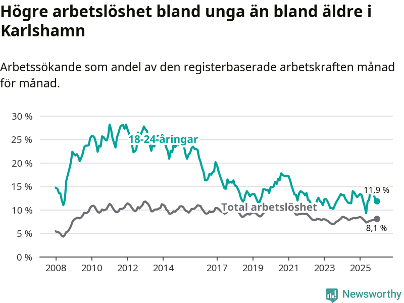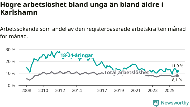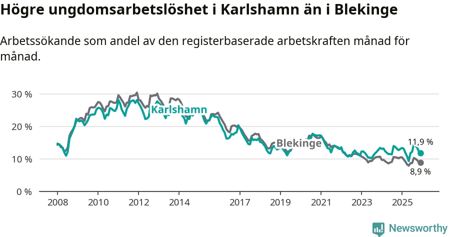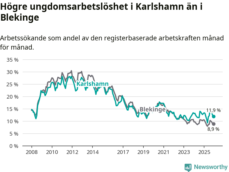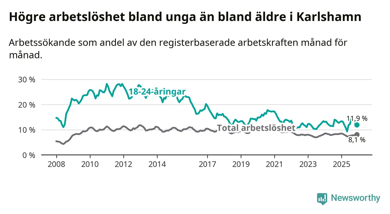 Precis som den totala arbetslösheten ligger ungdomsarbetslösheten i Karlshamn högre än i Blekinge som helhet. Skillnaden mellan kommunen och länet är 3,0 procentenheter.