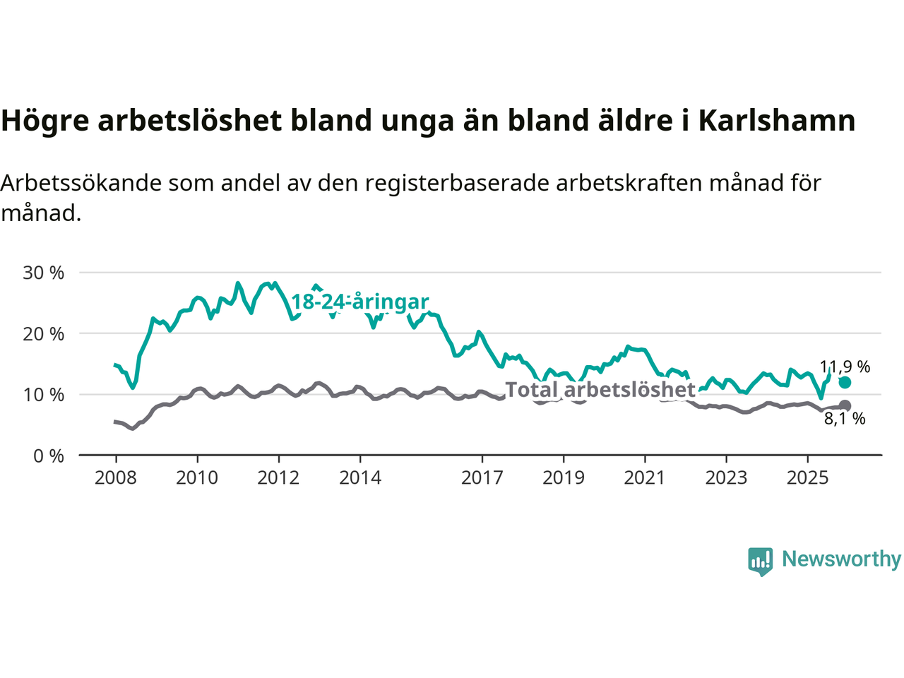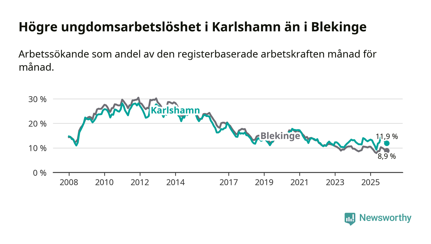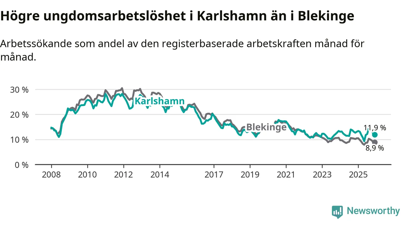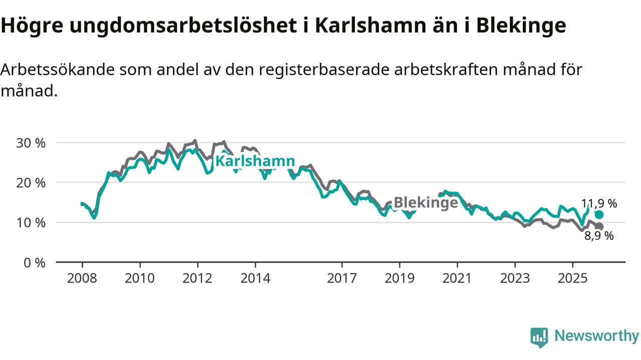Graf: Arbetslöshet bland unga i Karlshamns kommun och Blekinge län