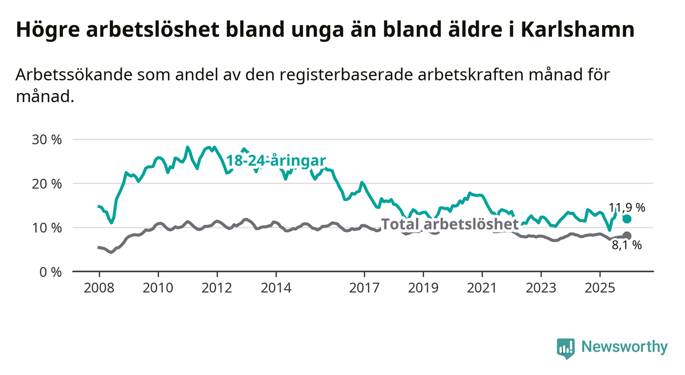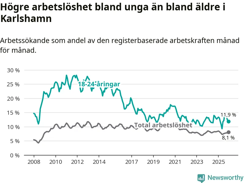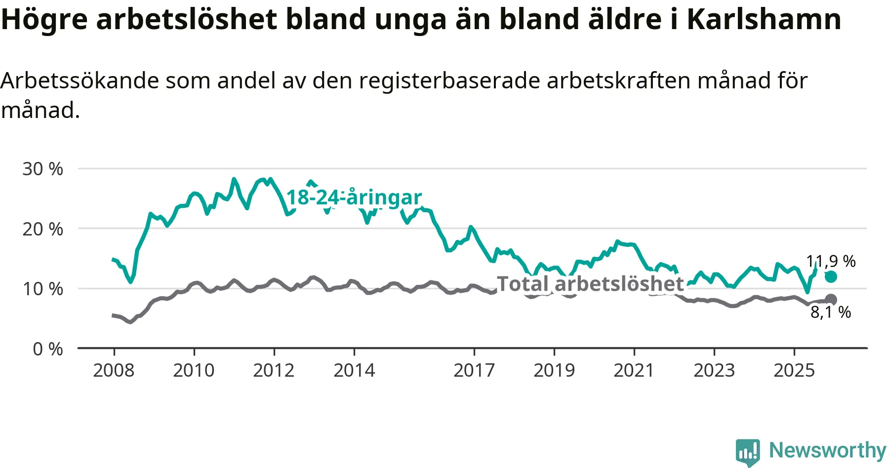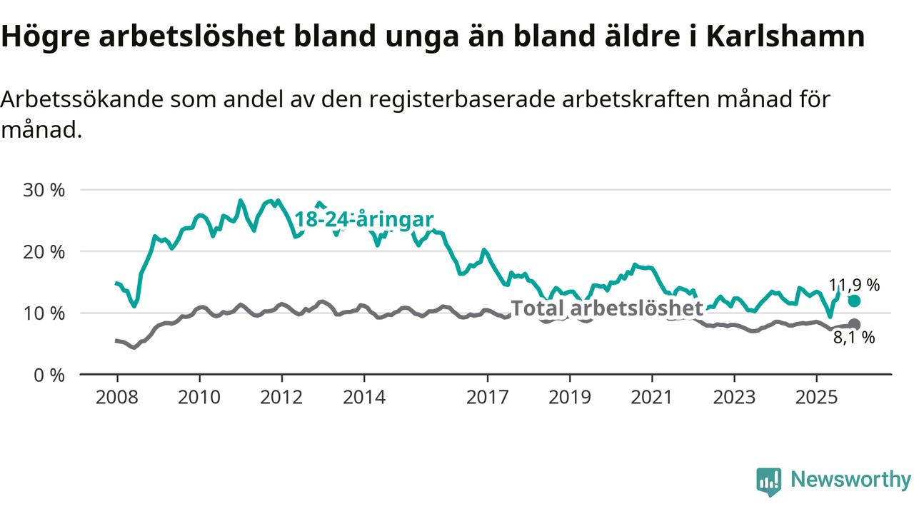 Graf: Arbetslöshet bland unga i Karlshamns kommun och Blekinge län