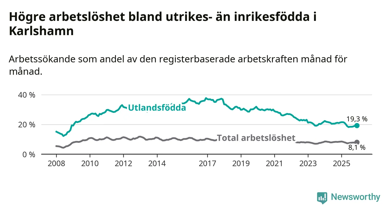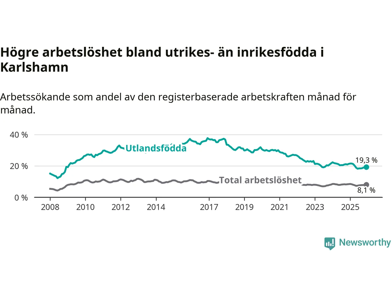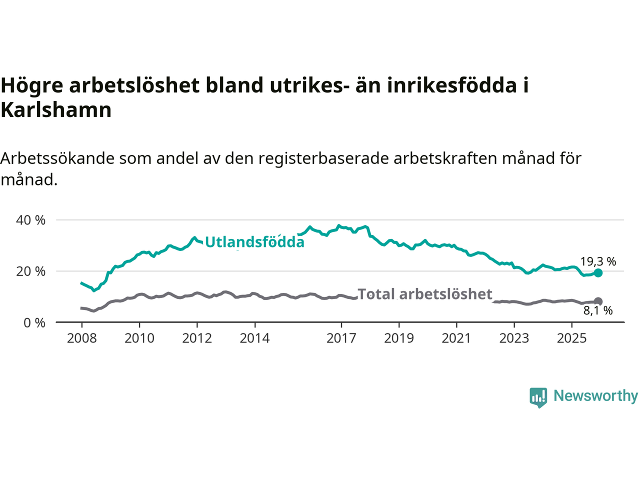 Arbetslösheten bland utlandsfödda var 19,3 procent i Karlshamn under december månad, motsvarande 509 av 2 637 personer. Det är 2,0 procentenheter färre än vid samma tidpunkt i fjol (−50 om man räknar personer). Därmed är de utlandsföddas arbetslöshet lägre än vid samma tidpunkt i fjol för 13:e månaden i följd. Sedan november 2024 har arbetslösheten bland utlandsfödda minskat från 20,9 till 19,3 procent.