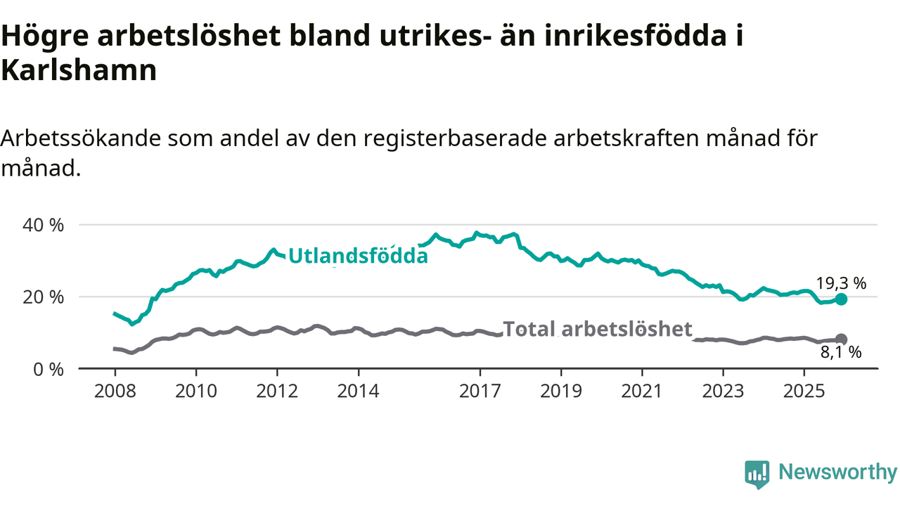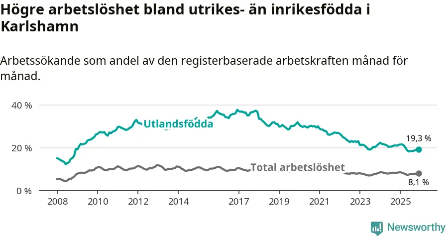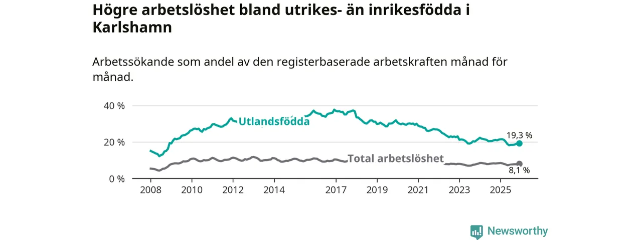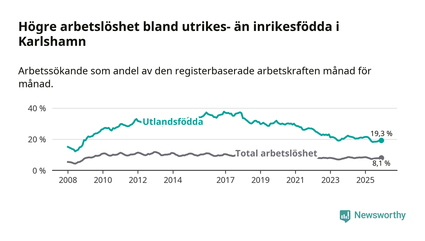 Arbetslösheten bland utlandsfödda var 19,3 procent i Karlshamn under december månad, motsvarande 509 av 2 637 personer. Det är 2,0 procentenheter färre än vid samma tidpunkt i fjol (−50 om man räknar personer). Därmed är de utlandsföddas arbetslöshet lägre än vid samma tidpunkt i fjol för 13:e månaden i följd. Sedan november 2024 har arbetslösheten bland utlandsfödda minskat från 20,9 till 19,3 procent.
