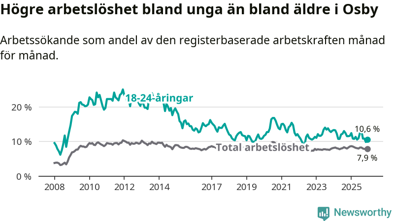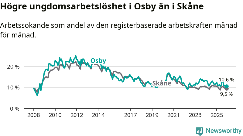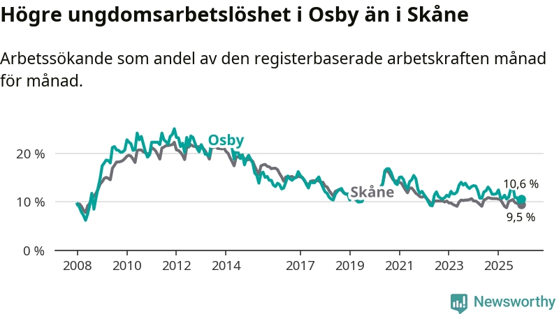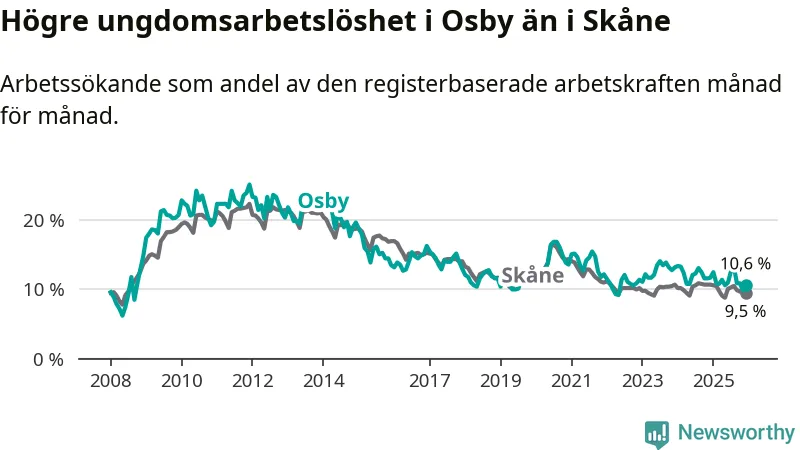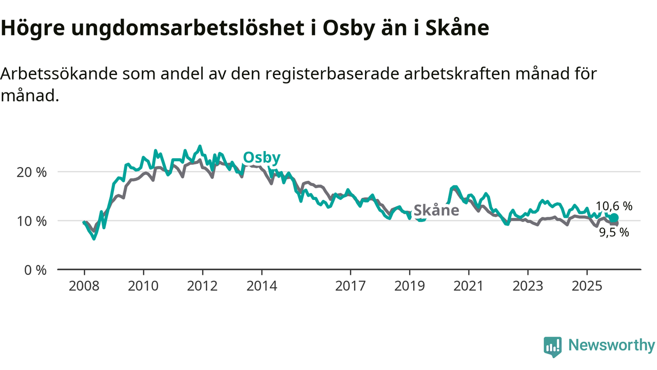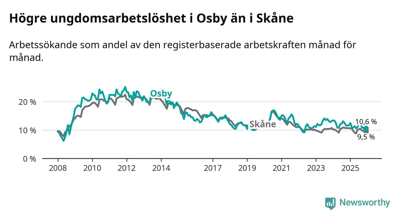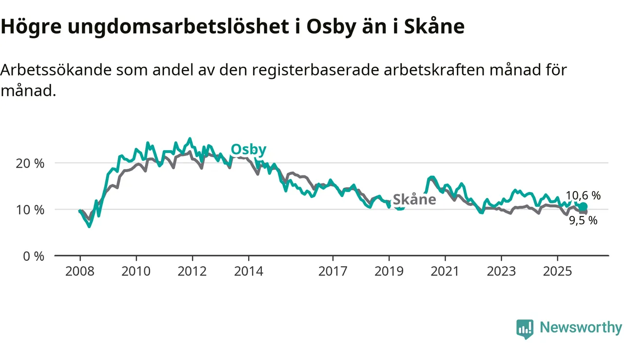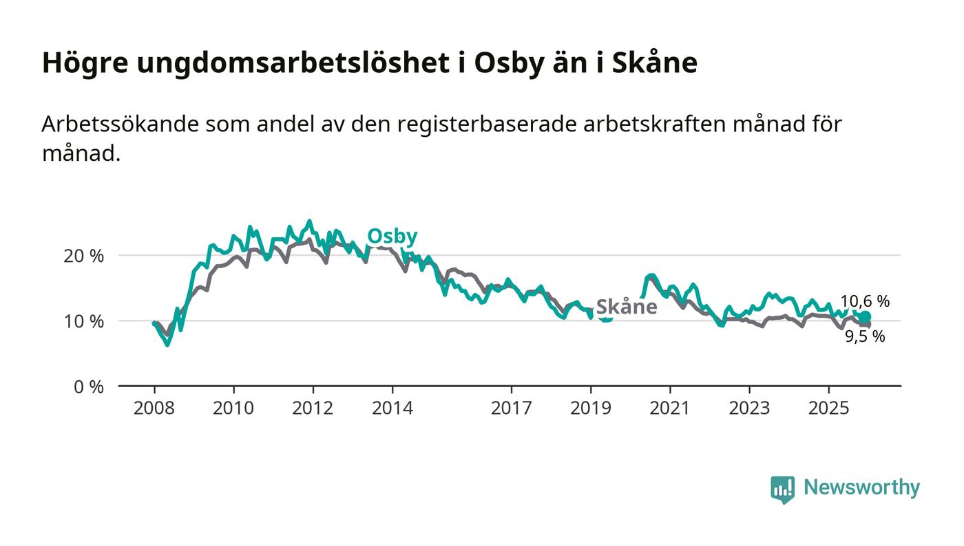 Medan Osby har lägre total arbetslöshet än Skåne, ligger ungdomsarbetslösheten 1,1 procentenheter högre i Osby.
