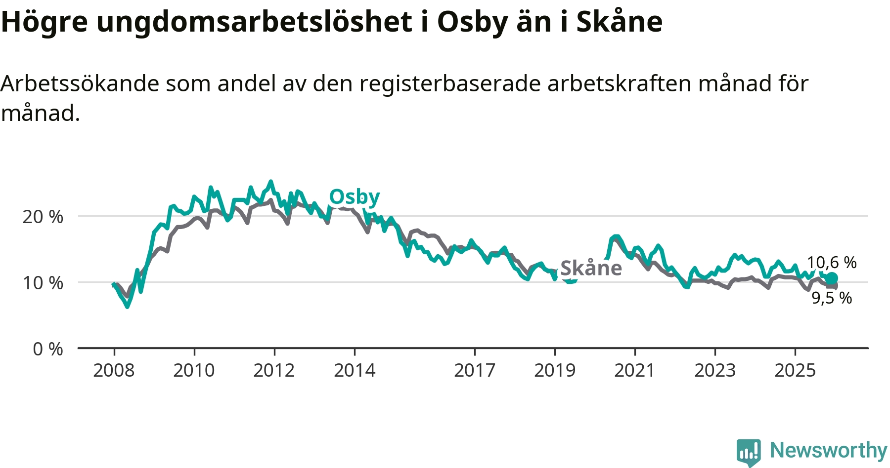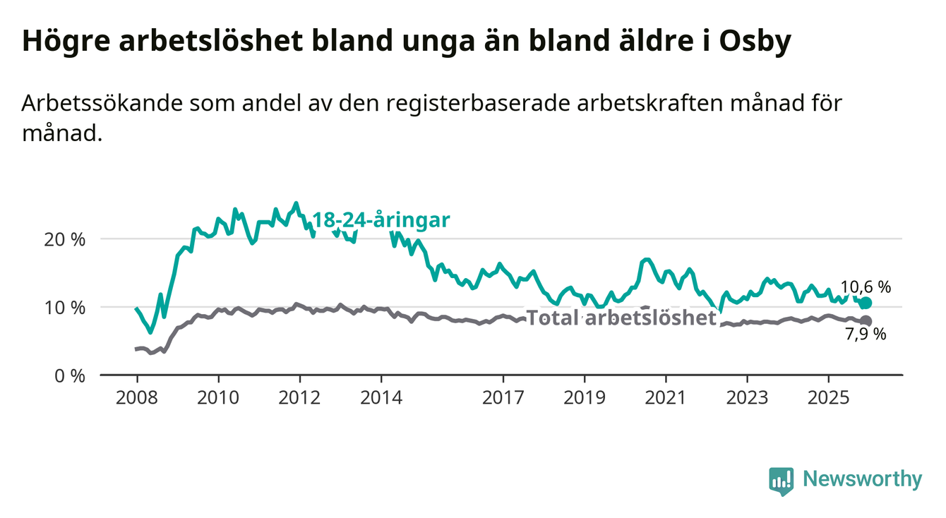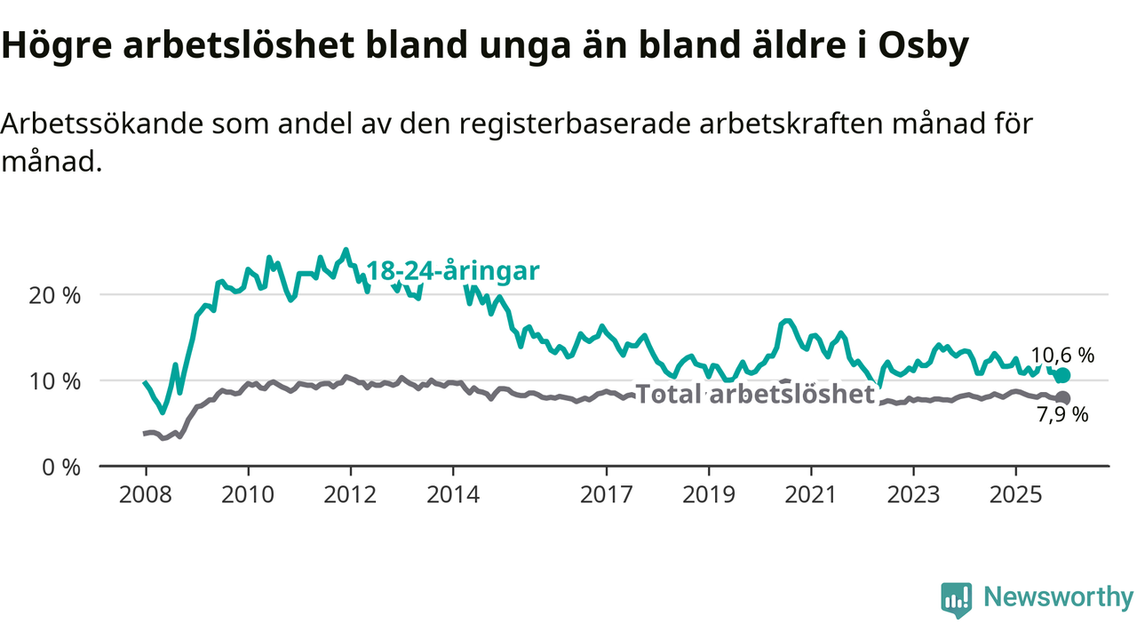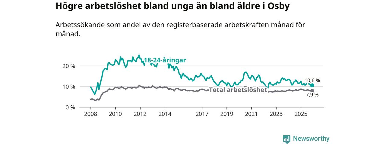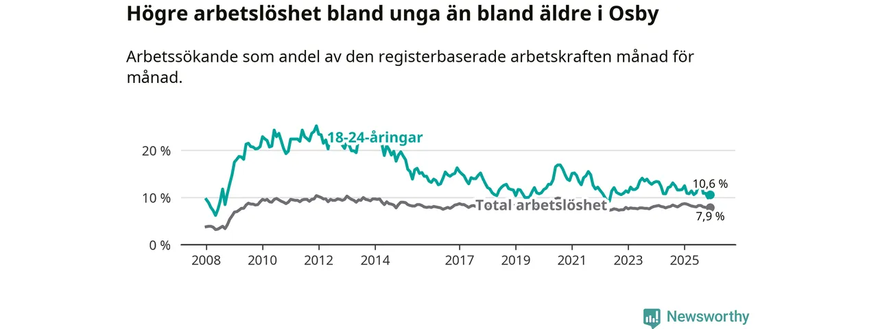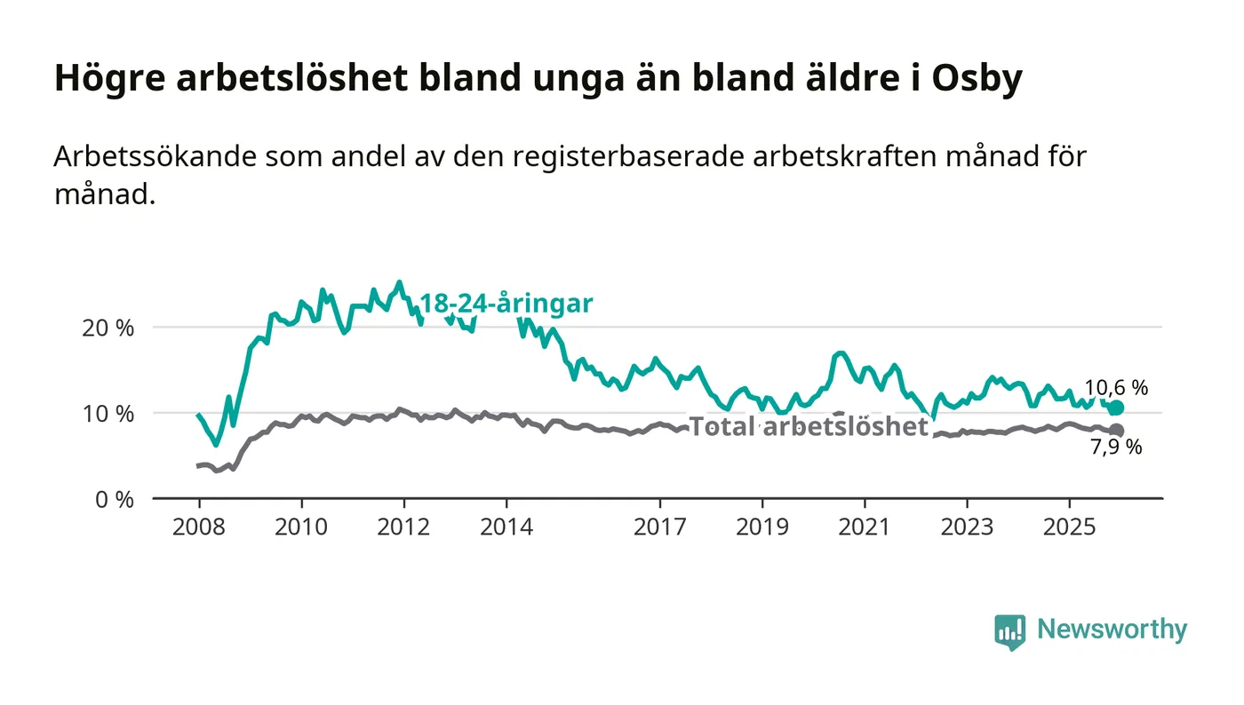 Medan Osby har lägre total arbetslöshet än Skåne, ligger ungdomsarbetslösheten 1,1 procentenheter högre i Osby.