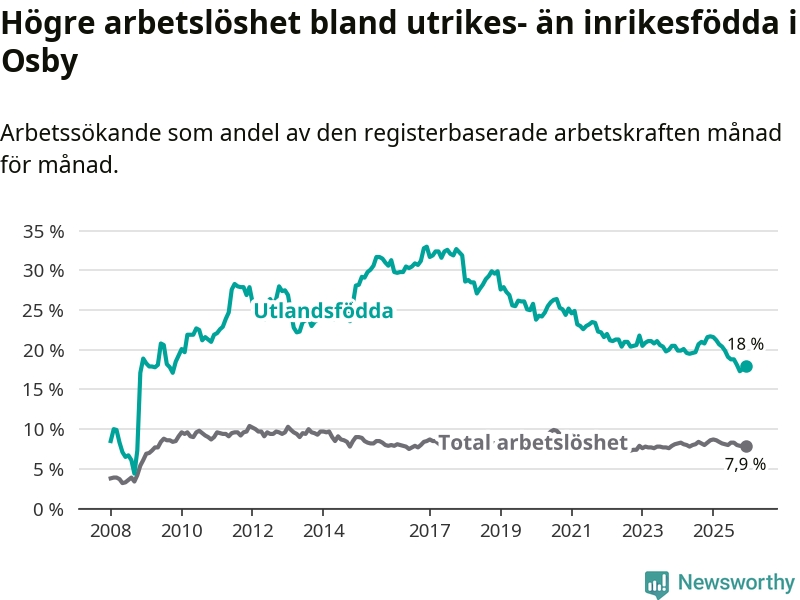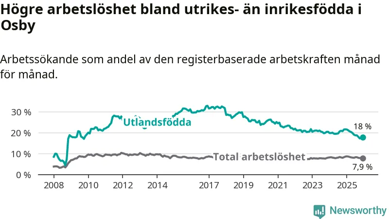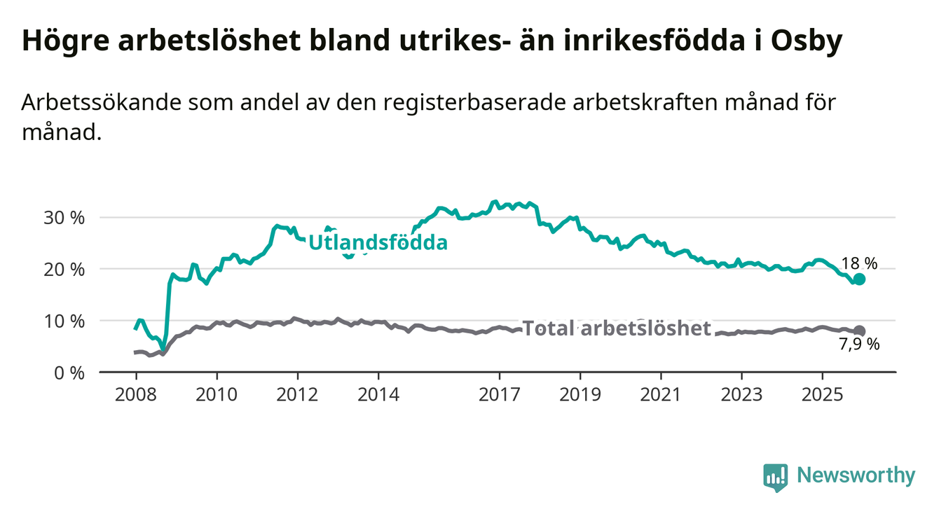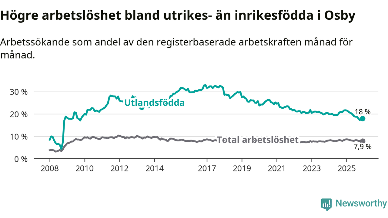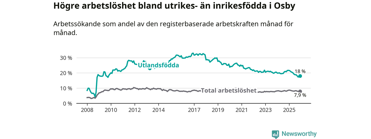 Arbetslösheten bland utlandsfödda var 18,0 procent i Osby under december månad, motsvarande 231 av 1 283 personer. Det är 3,7 procentenheter färre än vid samma tidpunkt i fjol (−47 om man räknar personer). Därmed är de utlandsföddas arbetslöshet lägre än vid samma tidpunkt i fjol för sjunde månaden i följd. Sedan maj 2025 har arbetslösheten bland utlandsfödda minskat från 19,9 till 18,0 procent.