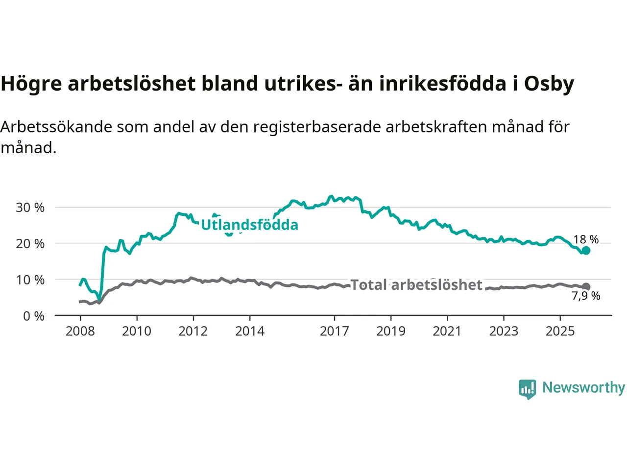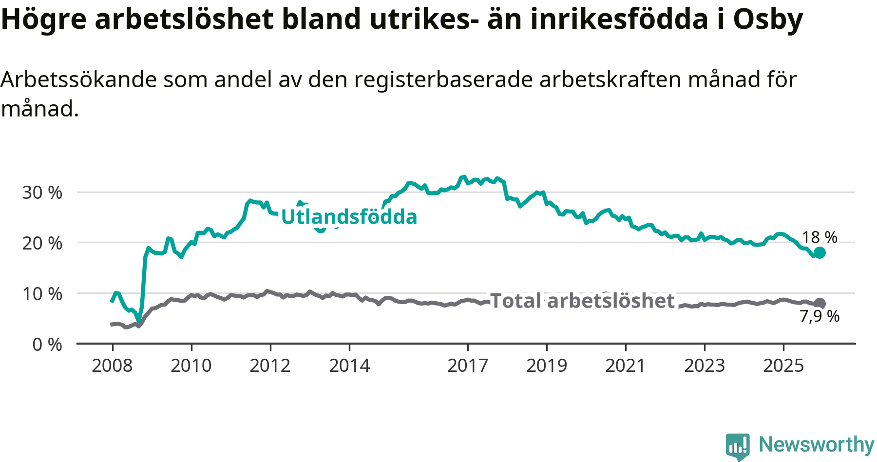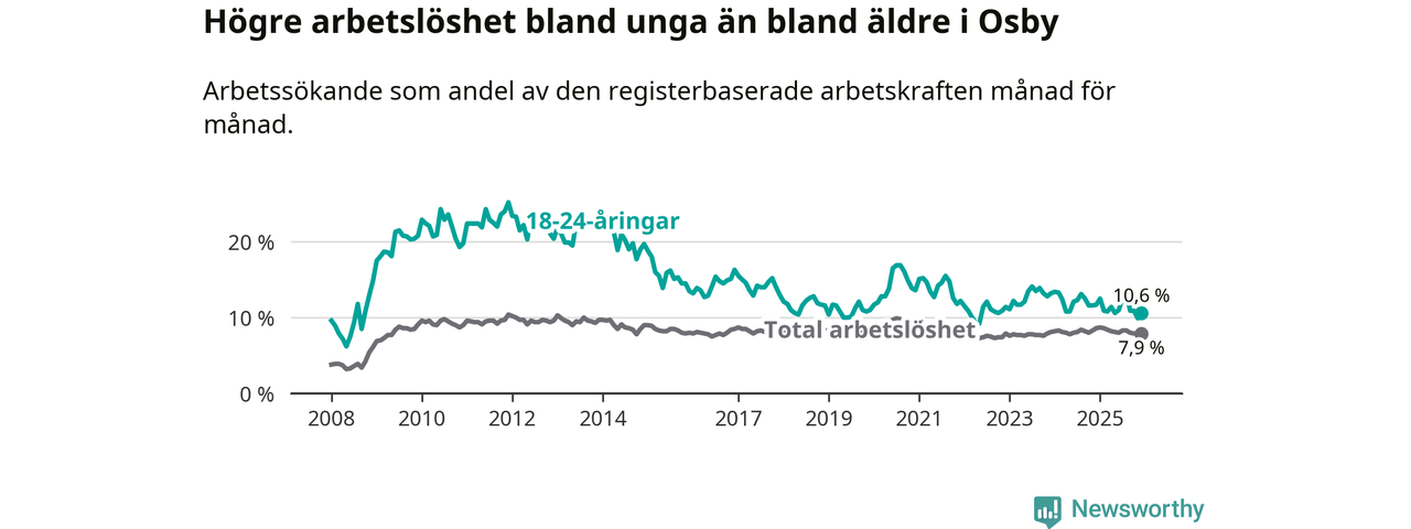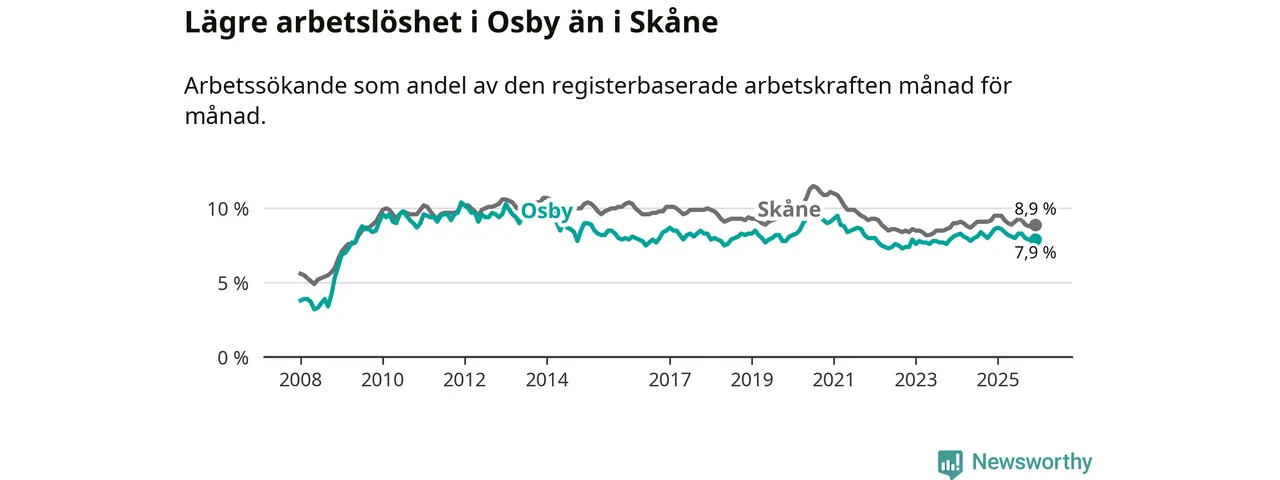 Arbetslösheten bland utlandsfödda var 18,0 procent i Osby under december månad, motsvarande 231 av 1 283 personer. Det är 3,7 procentenheter färre än vid samma tidpunkt i fjol (−47 om man räknar personer). Därmed är de utlandsföddas arbetslöshet lägre än vid samma tidpunkt i fjol för sjunde månaden i följd. Sedan maj 2025 har arbetslösheten bland utlandsfödda minskat från 19,9 till 18,0 procent.