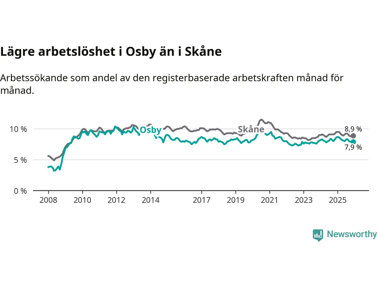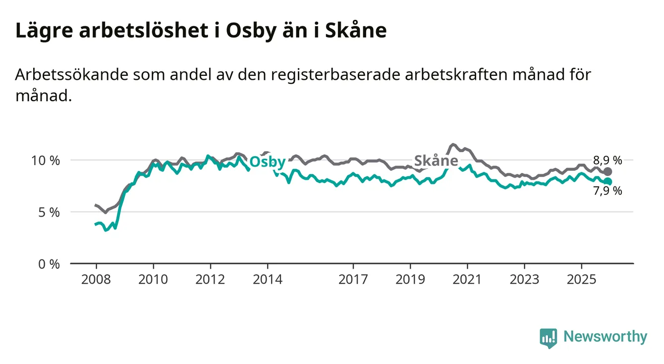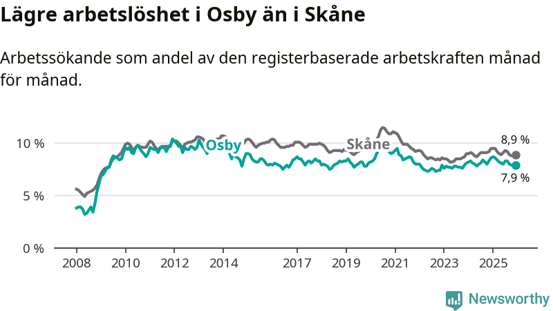 Osby hade redan tidigare lägre arbetslöshet än snittet i hela Skåne län och nu växer klyftan (7,9 procent i kommunen, jämfört med 8,9 procent i hela länet). Lomma har den lägsta arbetslösheten i länet (4,0 procent), medan Perstorp har den högsta (13,3 procent). För att Osby skulle komma ner i samma arbetslöshetsnivå som Lomma skulle 231 personer behöva sysselsättas.