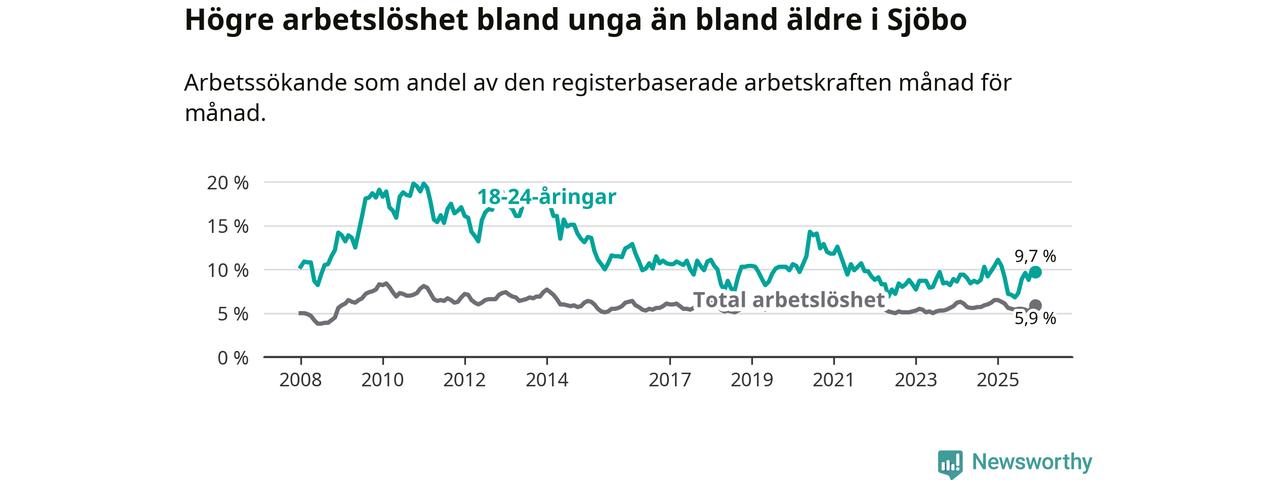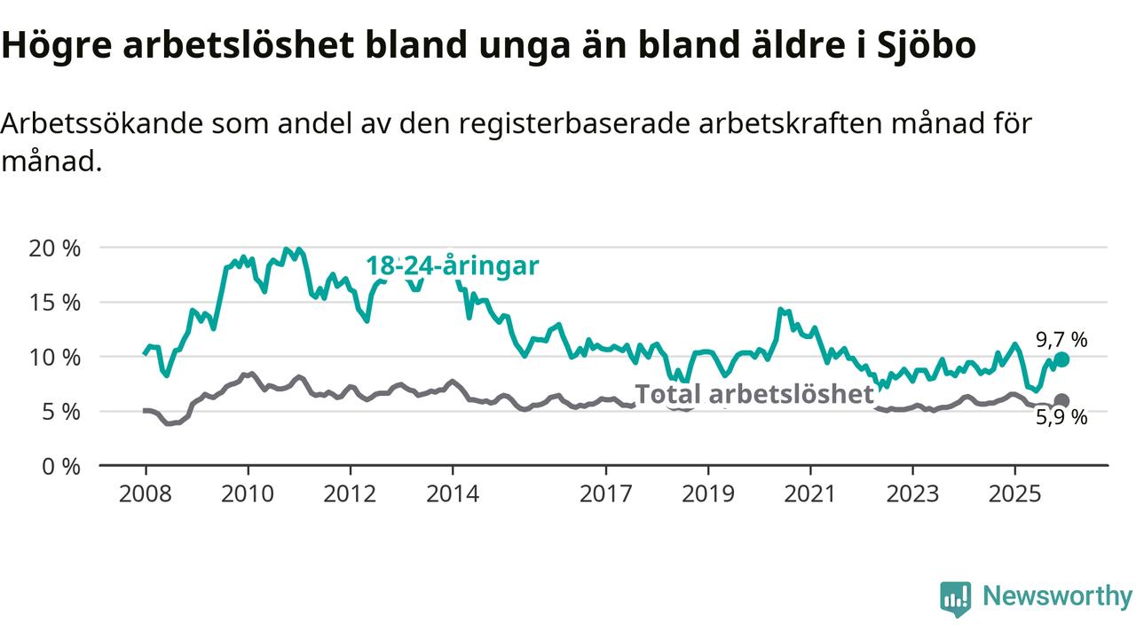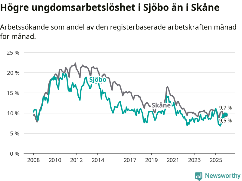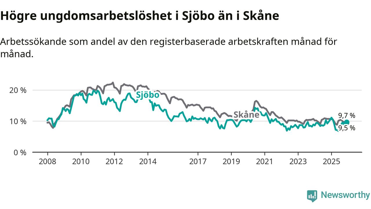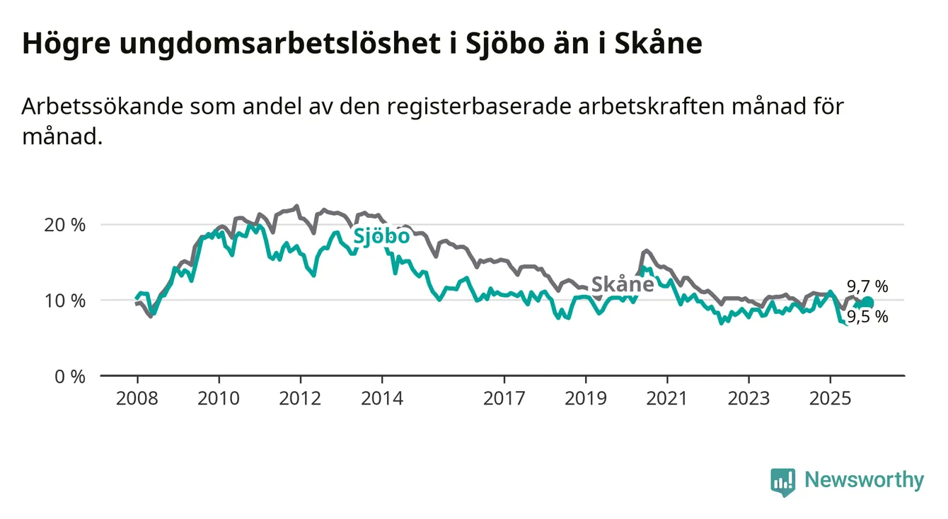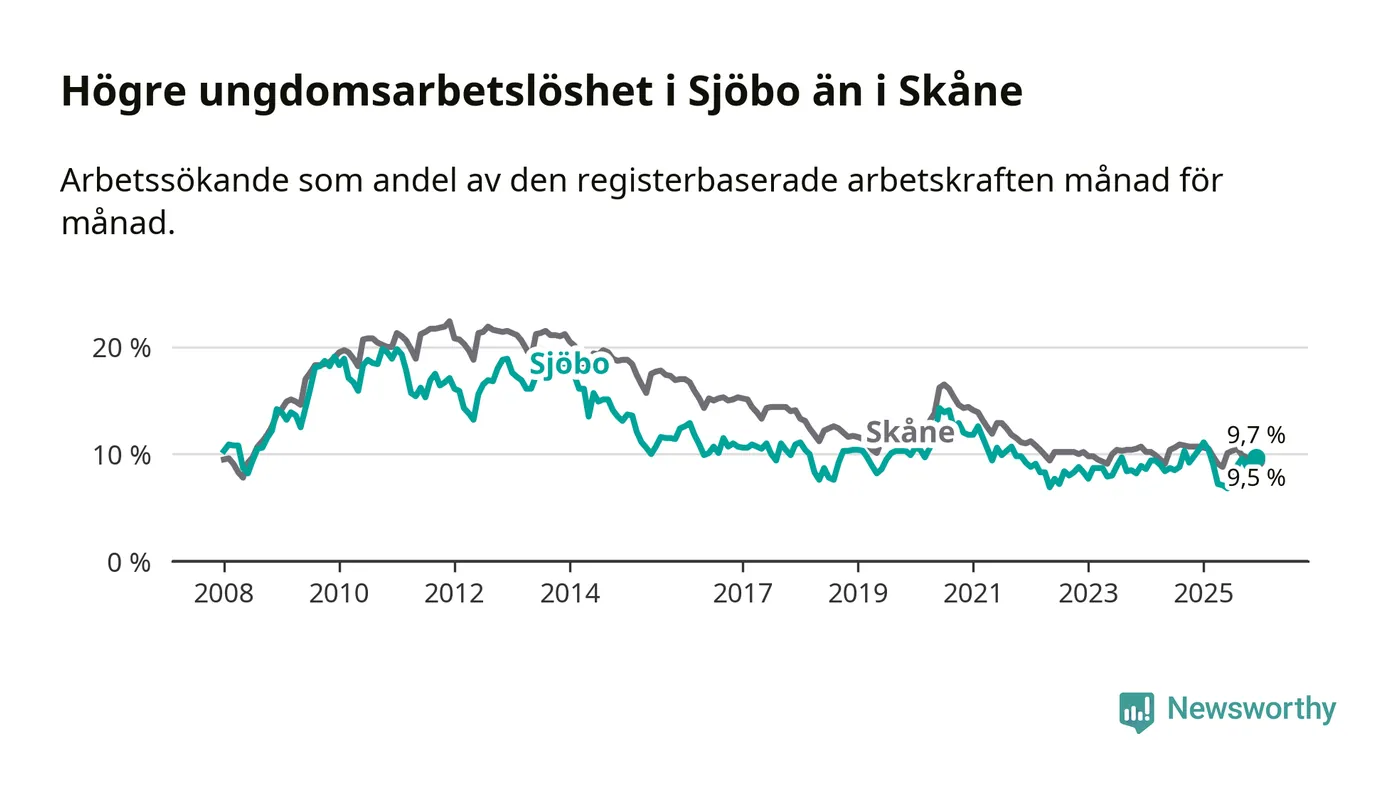 Medan Sjöbo har lägre total arbetslöshet än Skåne, ligger ungdomsarbetslösheten 0,2 procentenheter högre i Sjöbo.