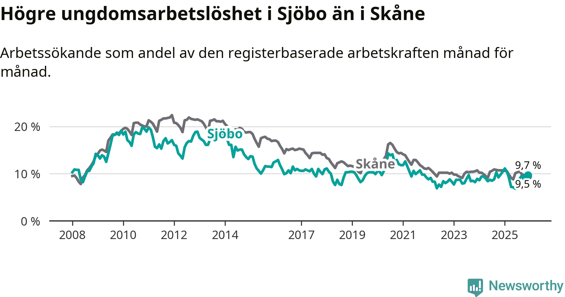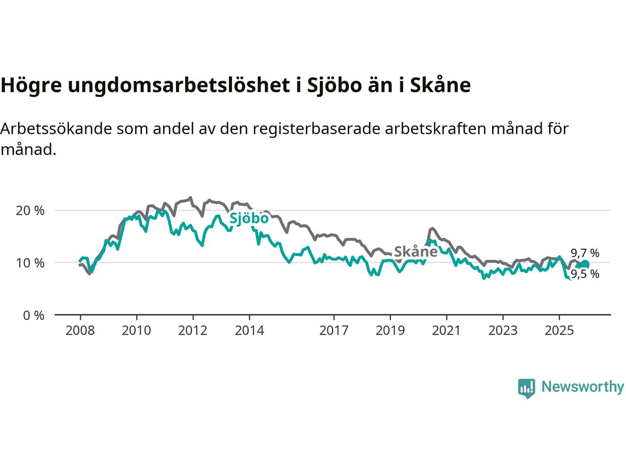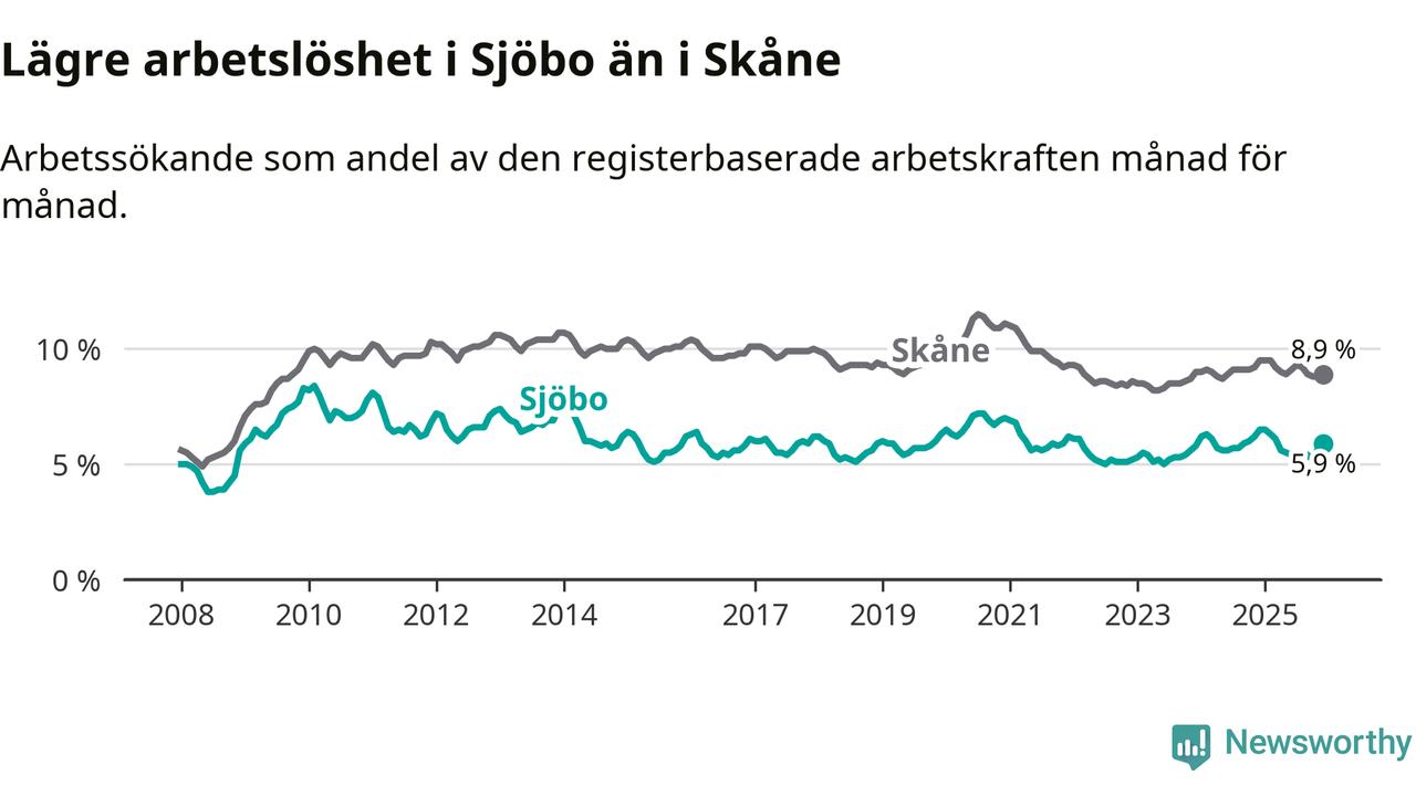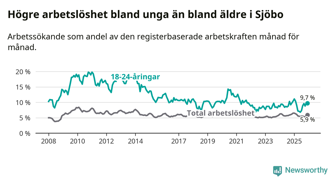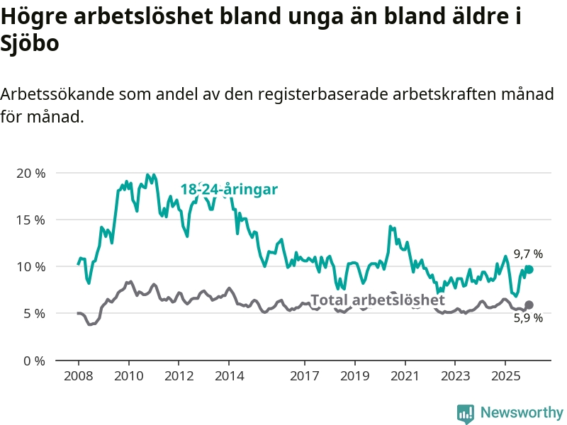 Medan Sjöbo har lägre total arbetslöshet än Skåne, ligger ungdomsarbetslösheten 0,2 procentenheter högre i Sjöbo.
