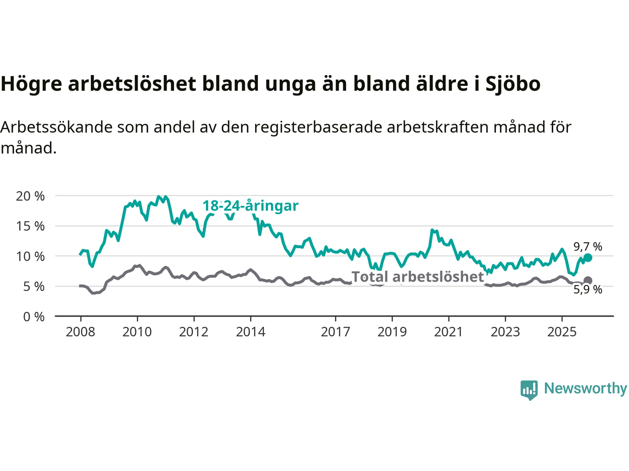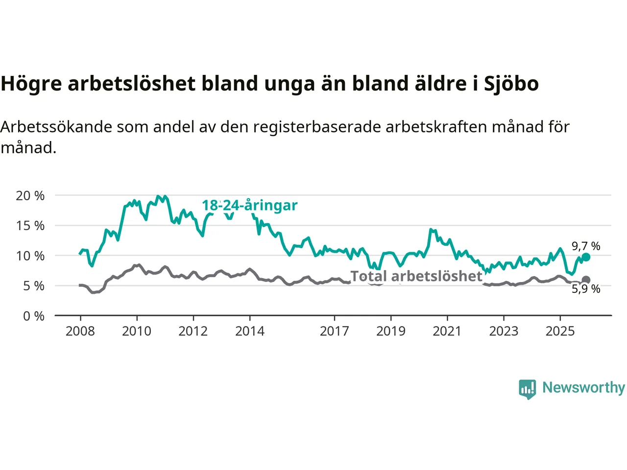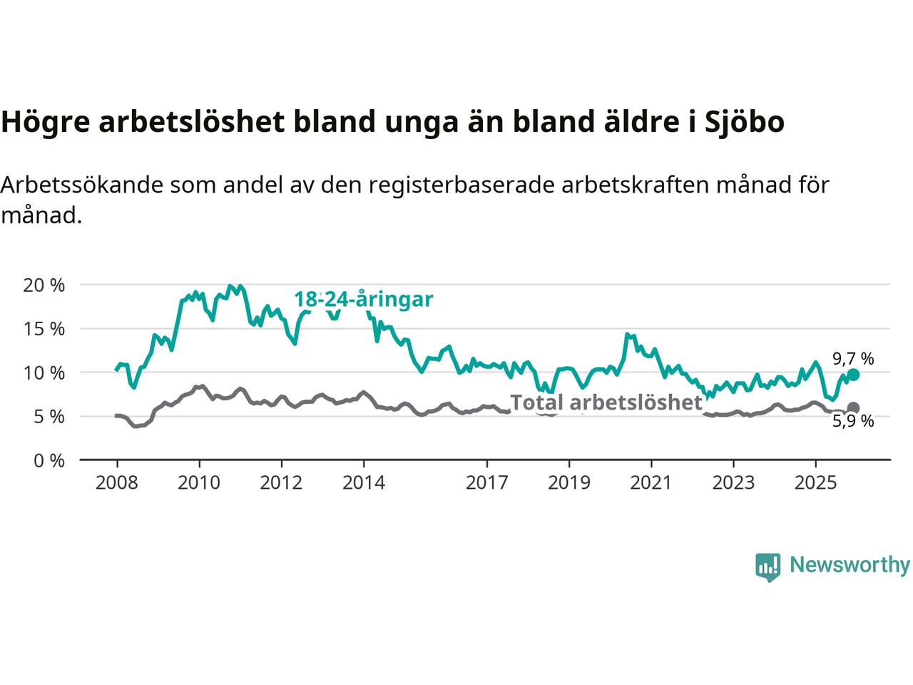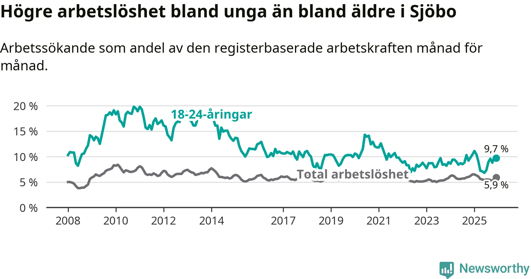 Medan Sjöbo har lägre total arbetslöshet än Skåne, ligger ungdomsarbetslösheten 0,2 procentenheter högre i Sjöbo.