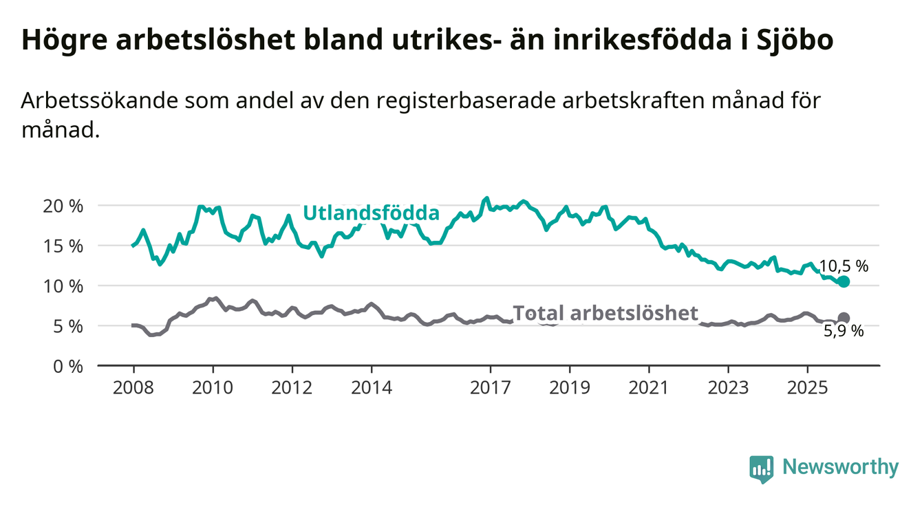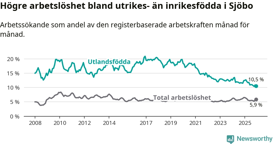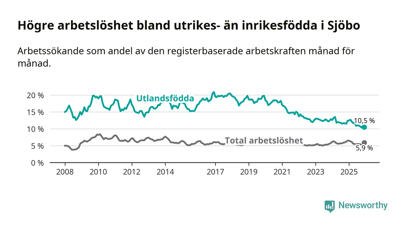 Arbetslösheten bland utlandsfödda var 10,5 procent i Sjöbo under december månad, motsvarande 132 av 1 257 personer. Det är 1,9 procentenheter färre än vid samma tidpunkt i fjol (−24 om man räknar personer). Därmed är de utlandsföddas arbetslöshet lägre än vid samma tidpunkt i fjol för 21:a månaden i följd. Sedan mars 2024 har arbetslösheten bland utlandsfödda minskat från 13,5 till 10,5 procent.