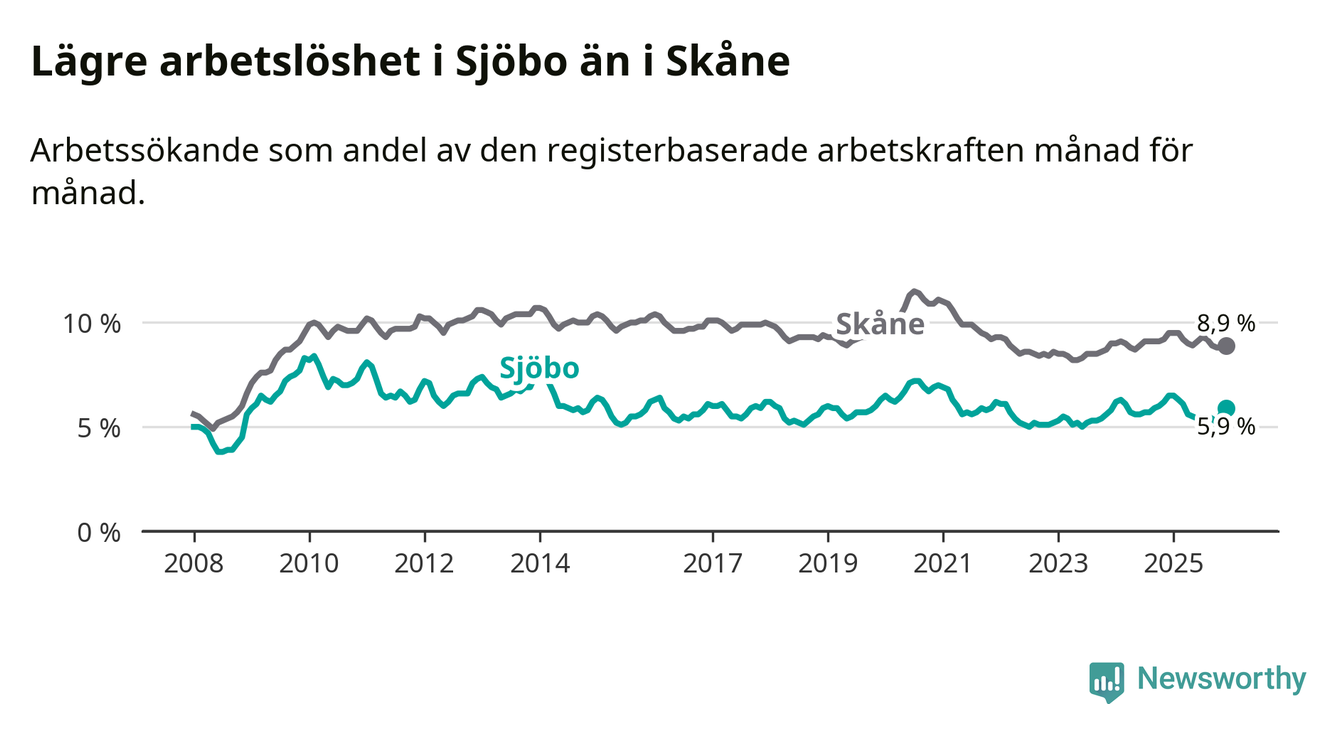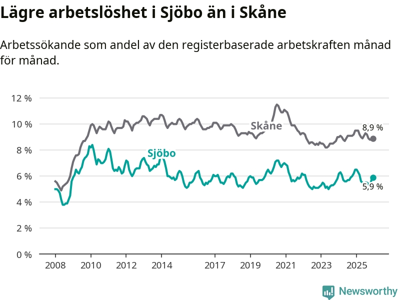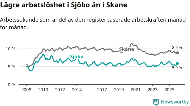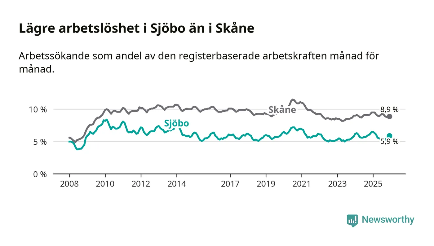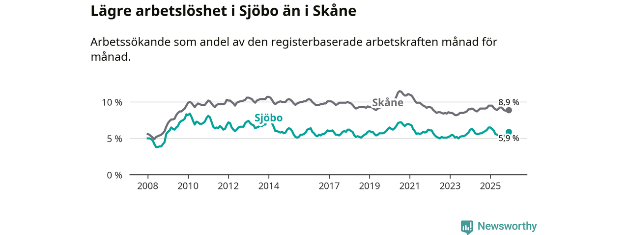 Under december månad rapporterade Sjöbo kommun en total arbetslöshet på 5,9 procent. Det är en minskning jämfört med samma tidpunkt i fjol (−0,6 procentenheter). Även i Skåne län sjunker arbetslösheten .