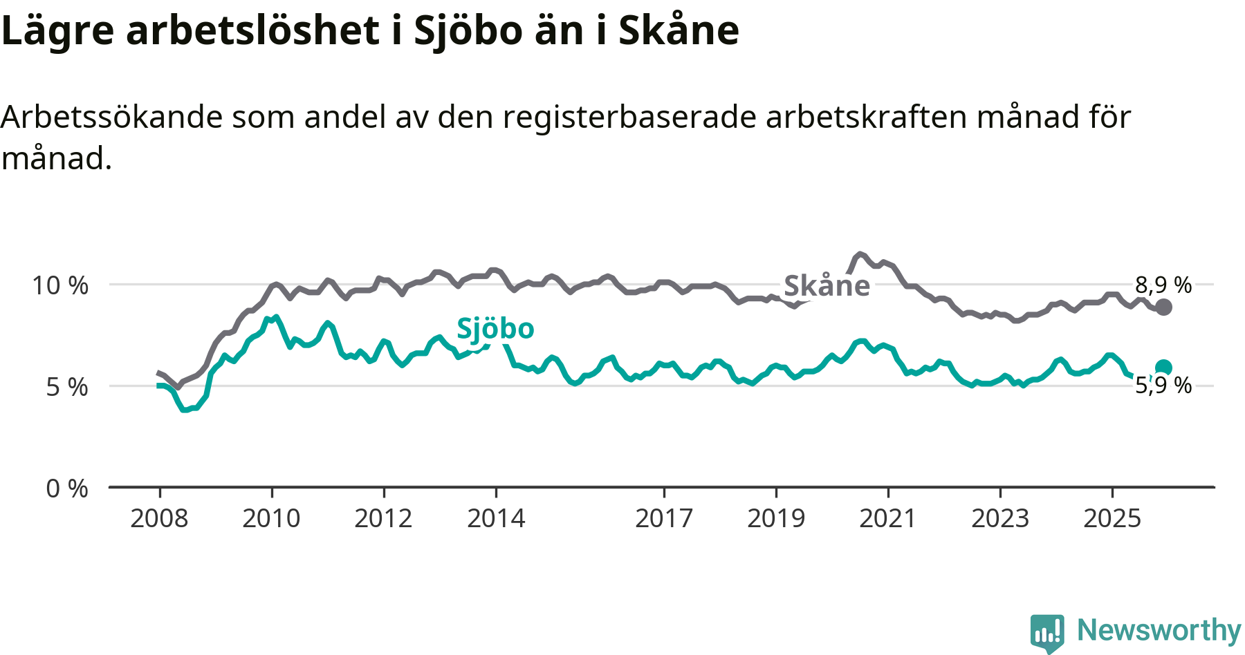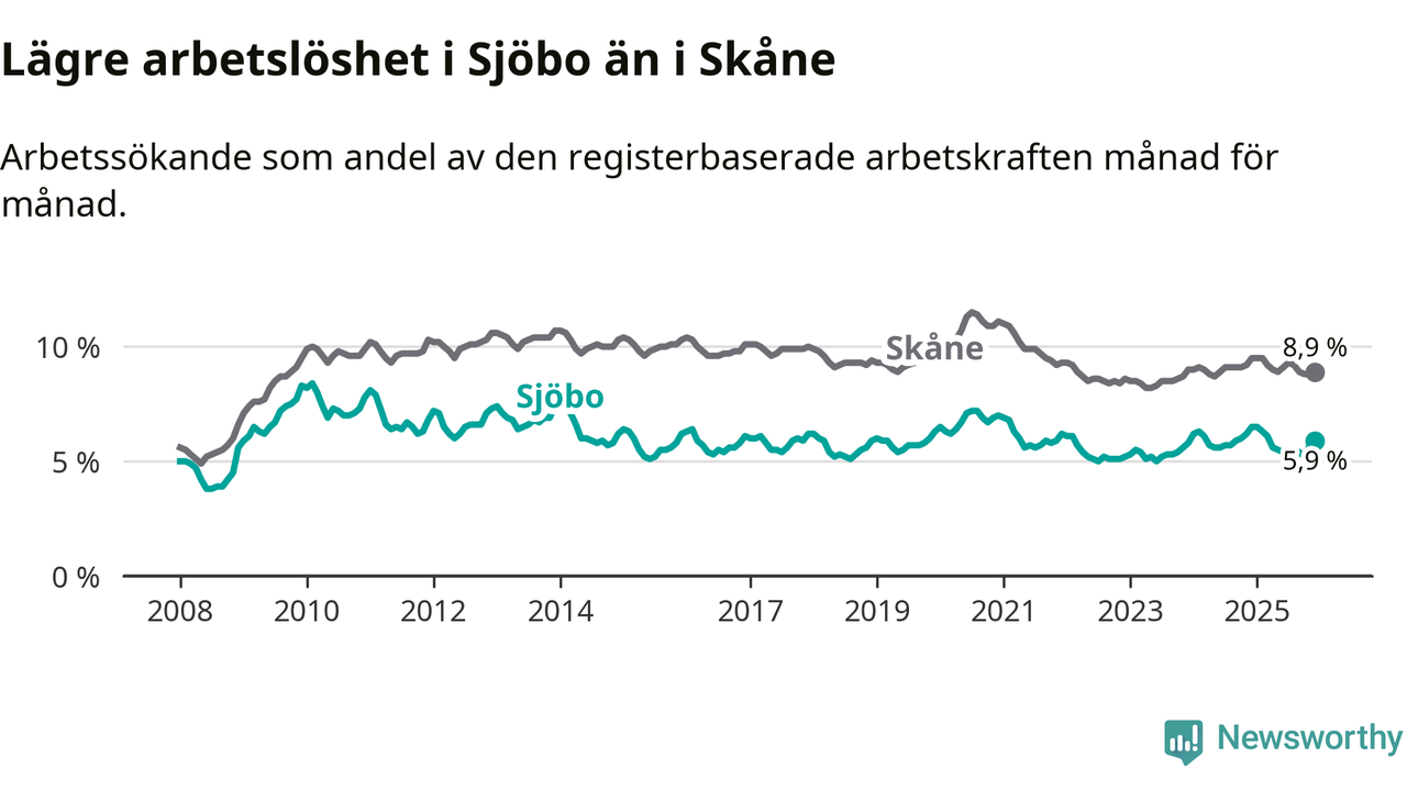 Graf: Arbetslöshet i Sjöbo kommun och Skåne län