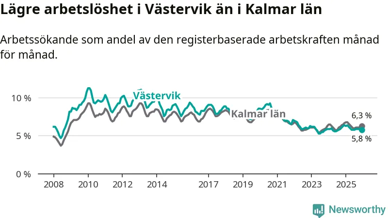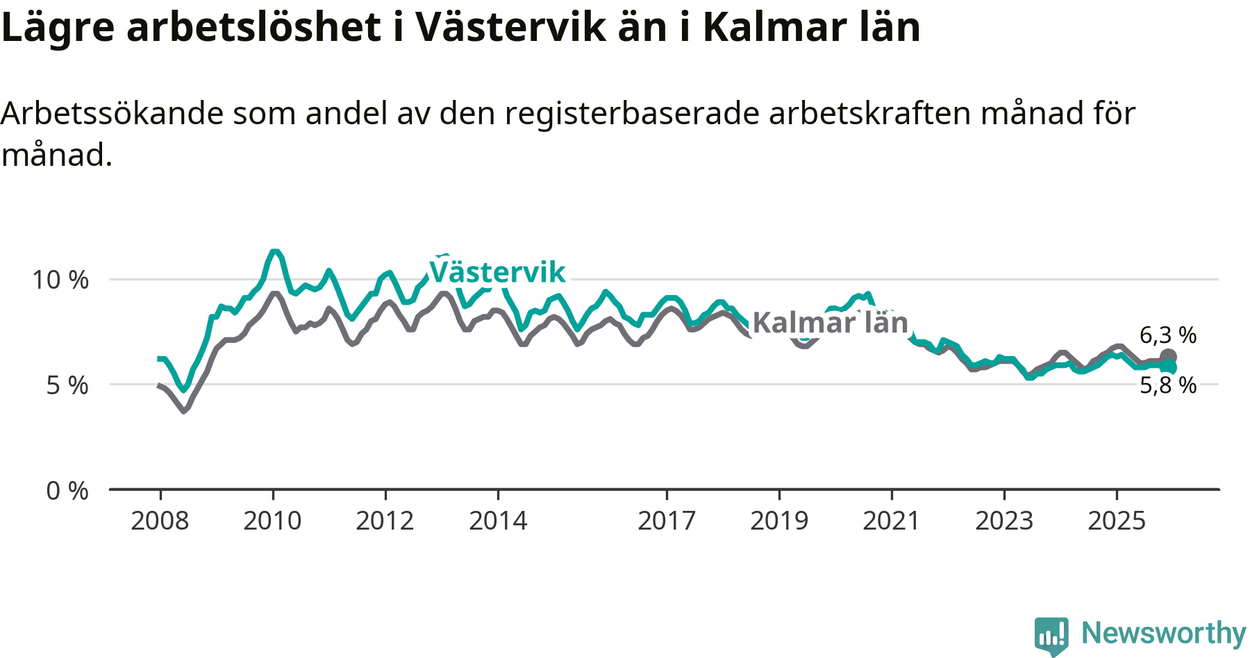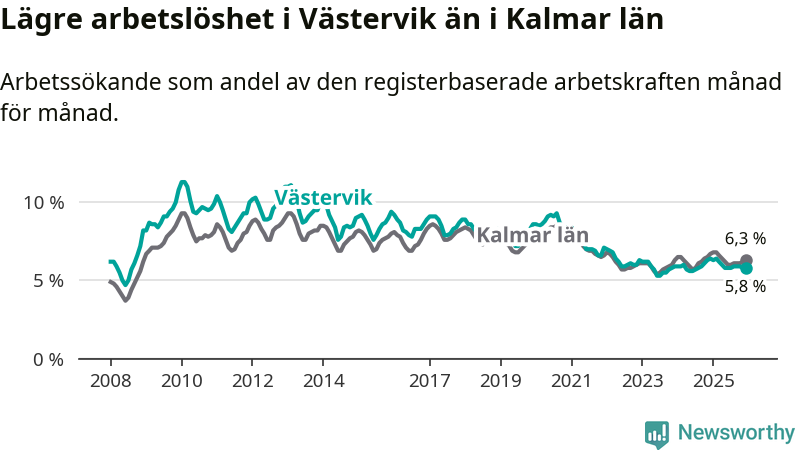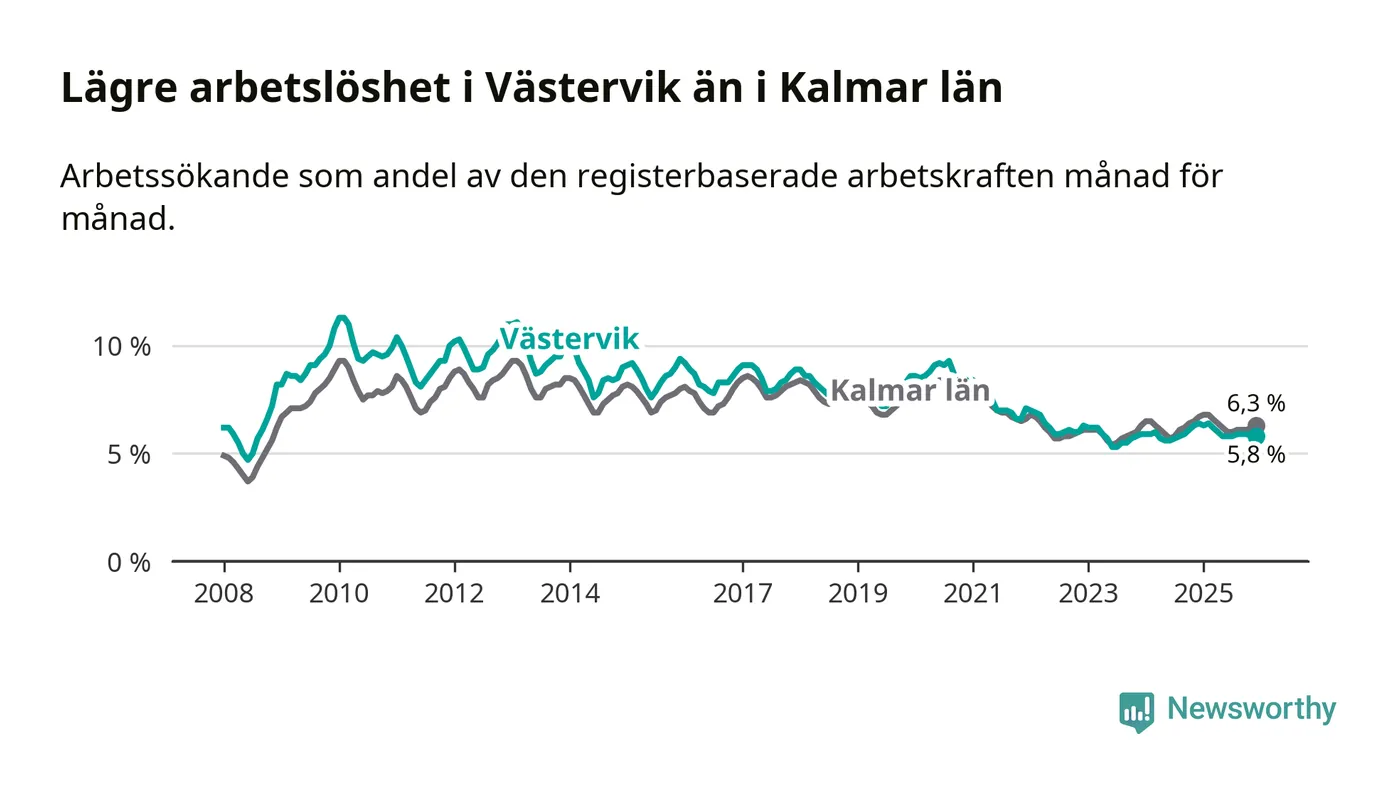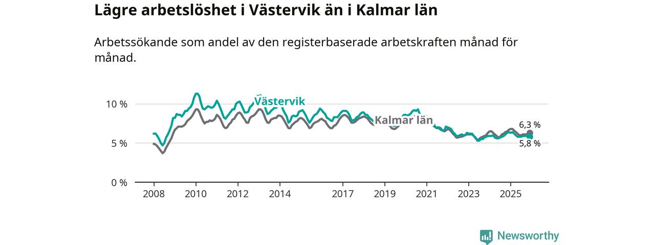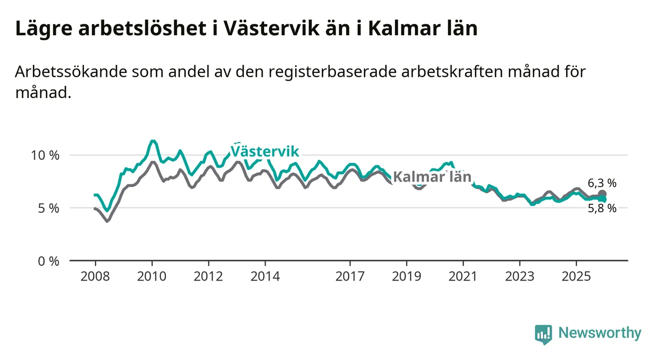 Västervik hade redan tidigare lägre arbetslöshet än snittet i hela Kalmar län och nu växer klyftan (5,8 procent i kommunen, jämfört med 6,3 procent i hela länet). Mörbylånga har den lägsta arbetslösheten i länet (3,8 procent), medan Högsby har den högsta (8,5 procent). För att Västervik skulle komma ner i samma arbetslöshetsnivå som Mörbylånga skulle 327 personer behöva sysselsättas.