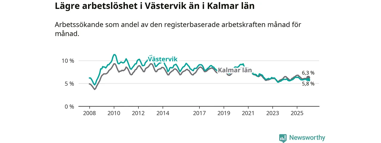 Under december månad rapporterade Västerviks kommun en total arbetslöshet på 5,8 procent. Det är en minskning jämfört med samma tidpunkt i fjol (−0,6 procentenheter). Även i Kalmar län sjunker arbetslösheten .