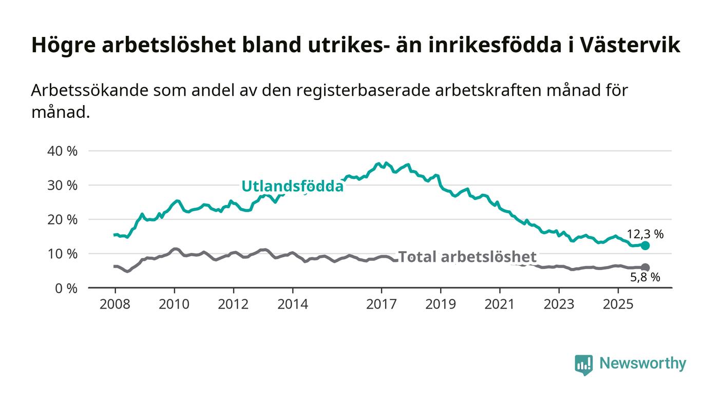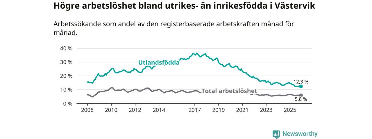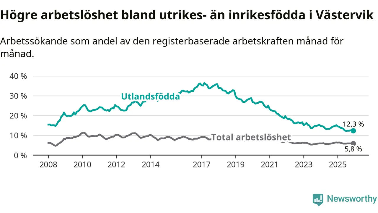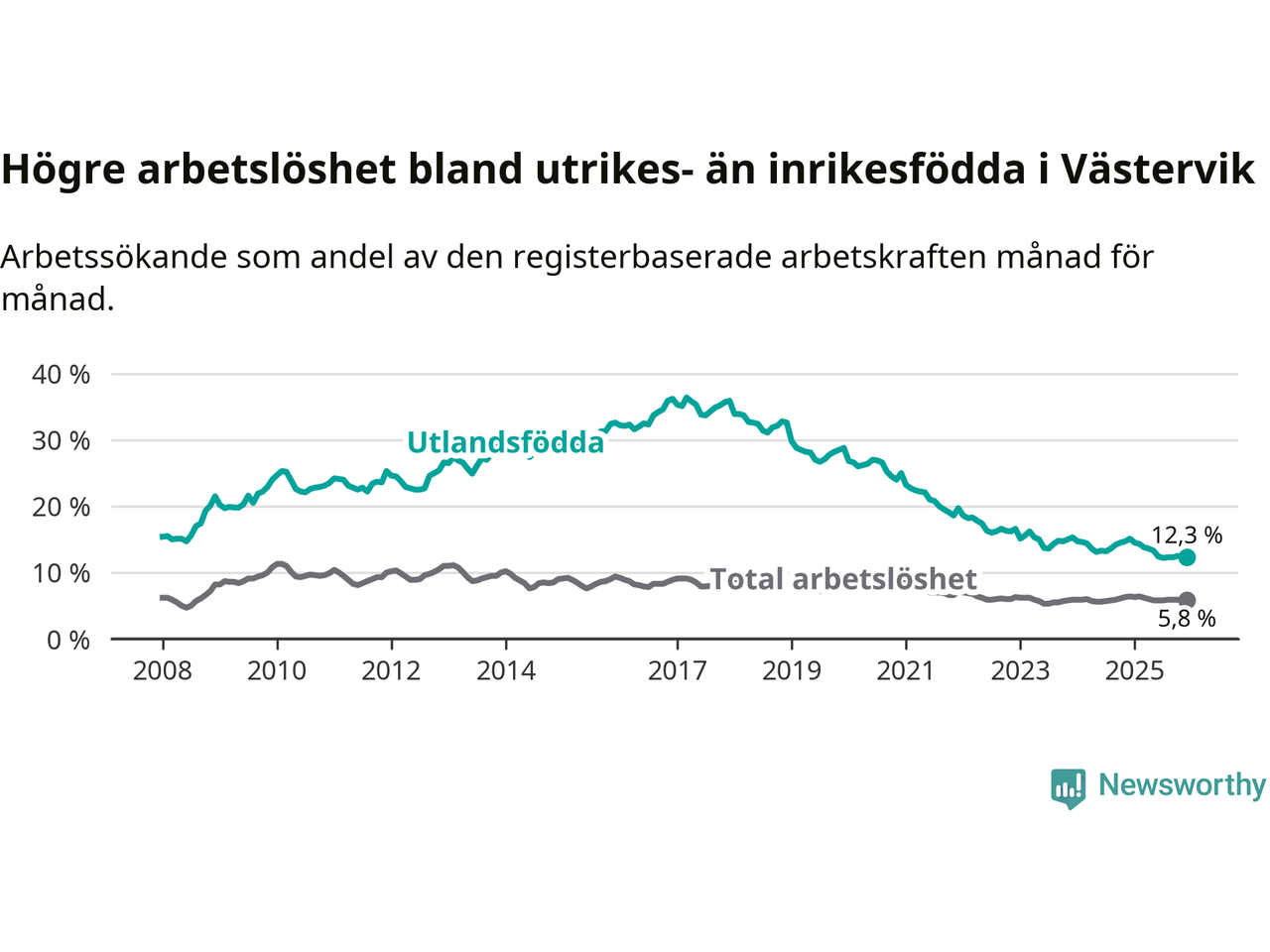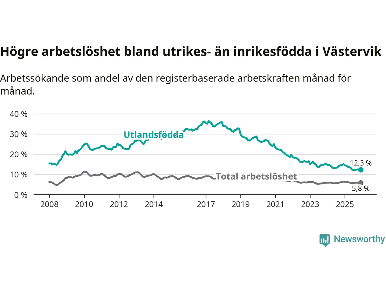 Arbetslösheten bland utlandsfödda var 12,3 procent i Västervik under december månad, motsvarande 308 av 2 504 personer. Det är 2,8 procentenheter färre än vid samma tidpunkt i fjol (−61 om man räknar personer). Därmed är de utlandsföddas arbetslöshet lägre än vid samma tidpunkt i fjol för sjunde månaden i följd. Sedan maj 2025 har arbetslösheten bland utlandsfödda minskat från 13,3 till 12,3 procent.