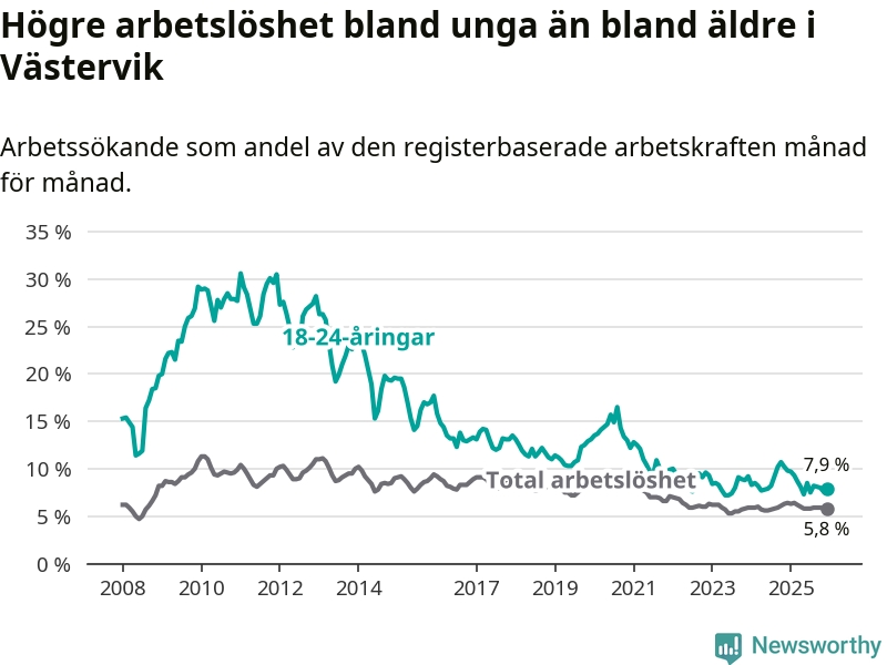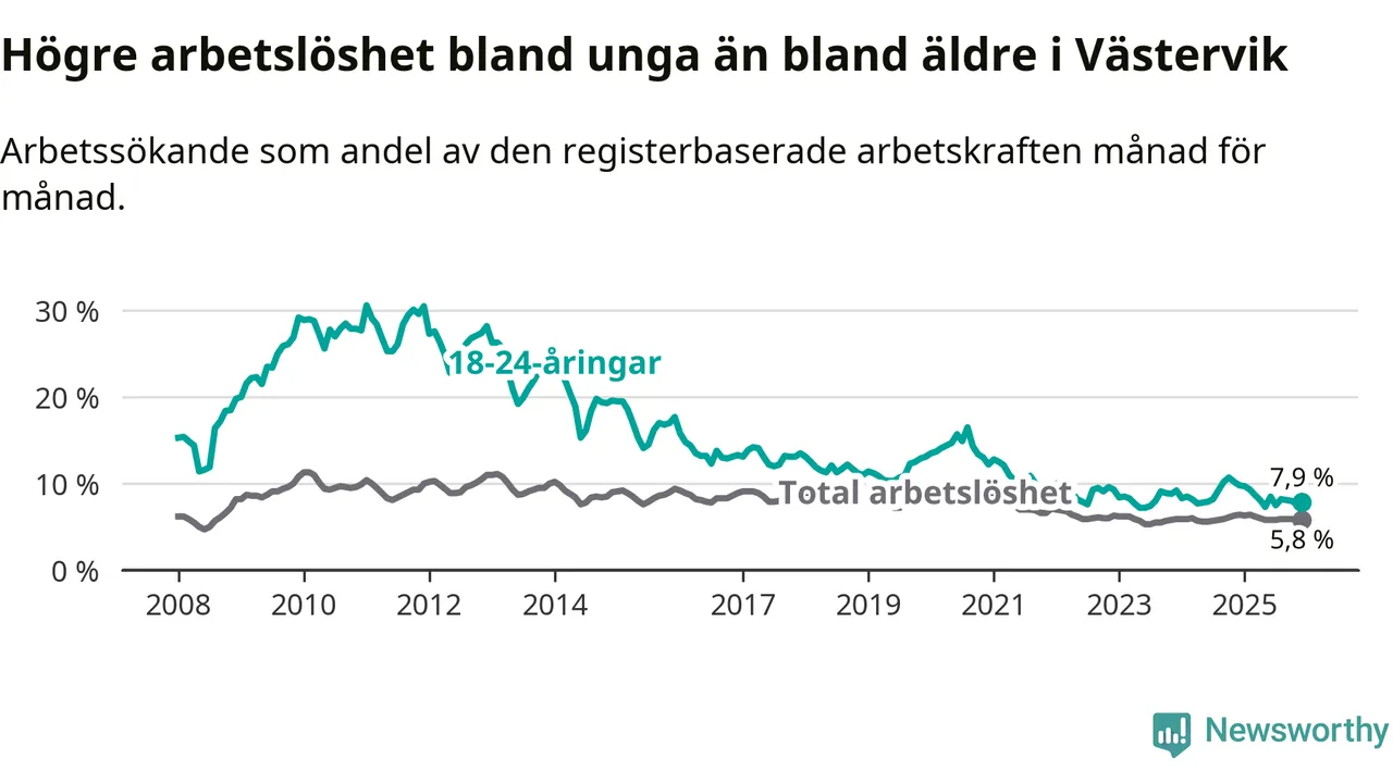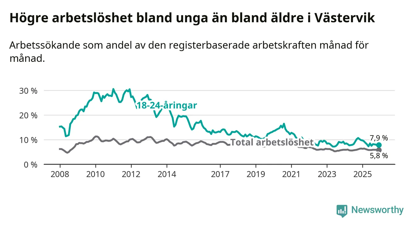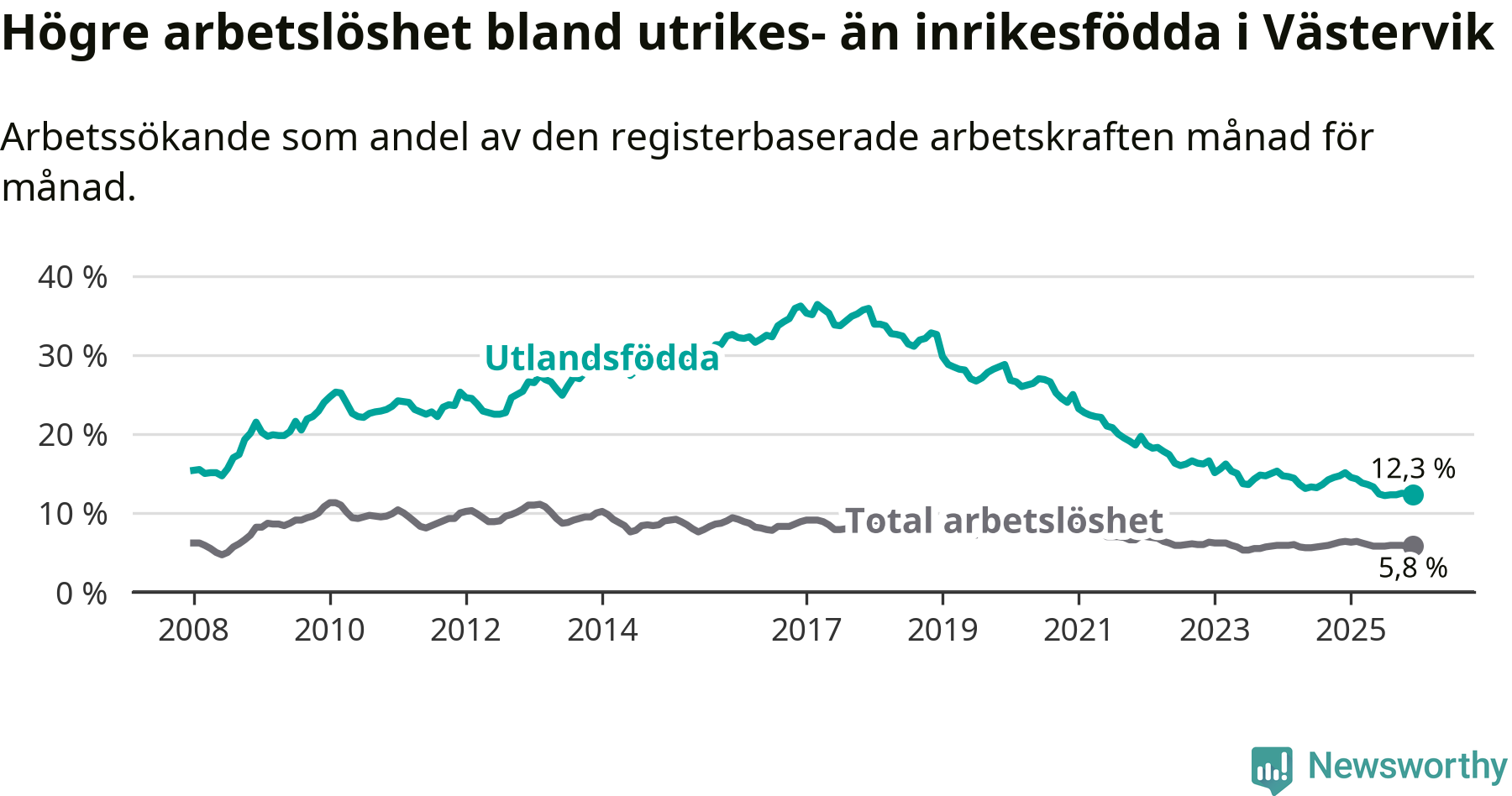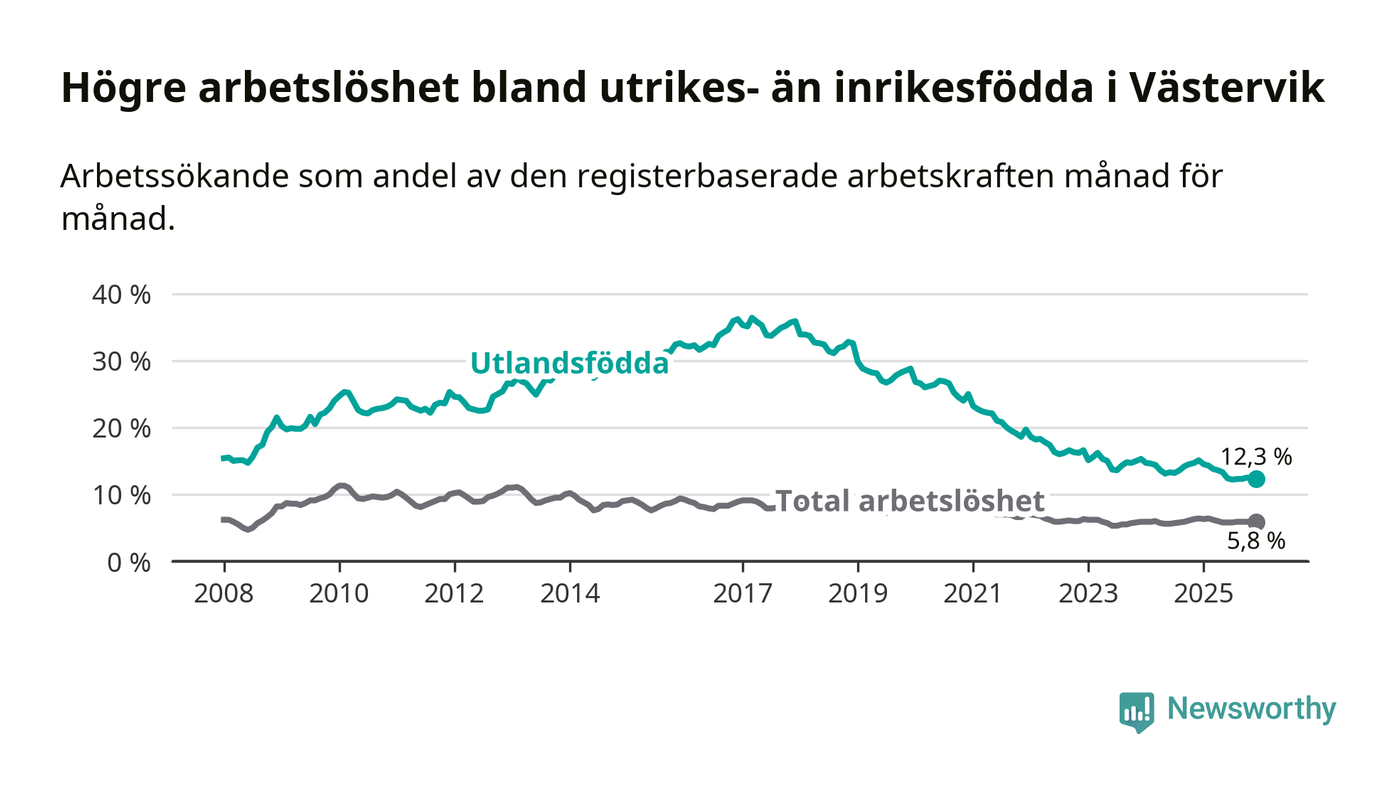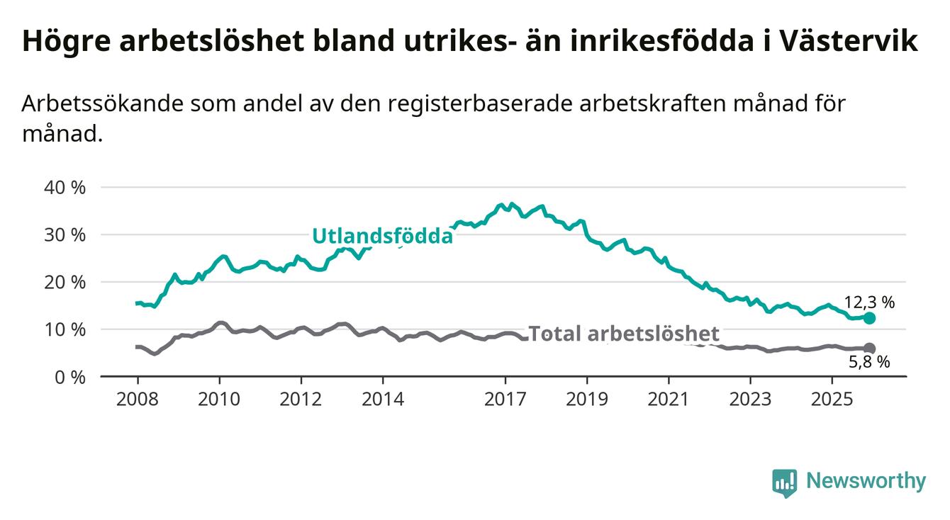 Arbetslösheten bland utlandsfödda var 12,3 procent i Västervik under december månad, motsvarande 308 av 2 504 personer. Det är 2,8 procentenheter färre än vid samma tidpunkt i fjol (−61 om man räknar personer). Därmed är de utlandsföddas arbetslöshet lägre än vid samma tidpunkt i fjol för sjunde månaden i följd. Sedan maj 2025 har arbetslösheten bland utlandsfödda minskat från 13,3 till 12,3 procent.