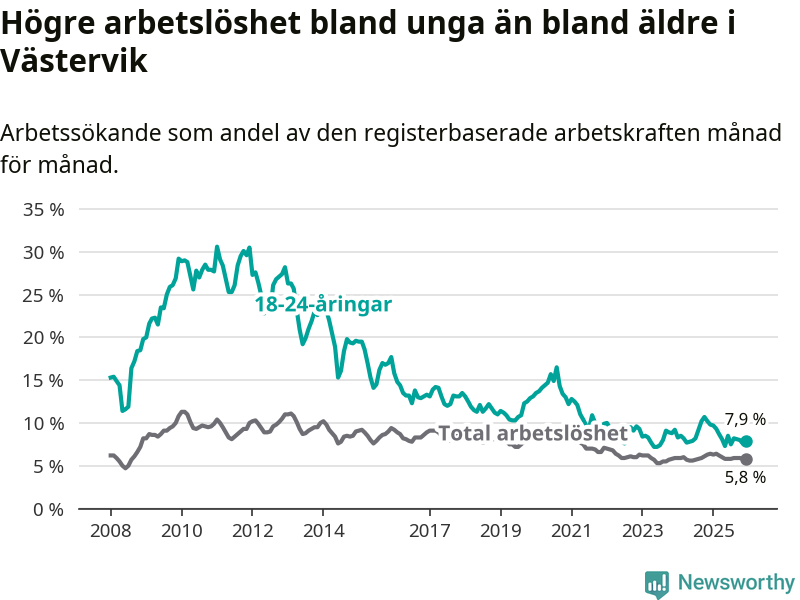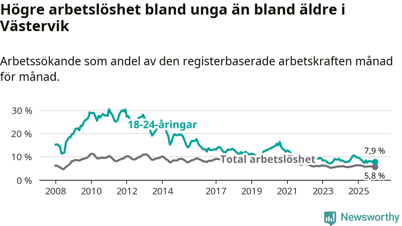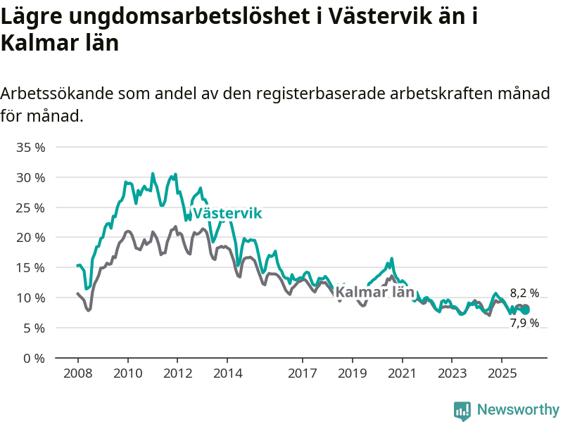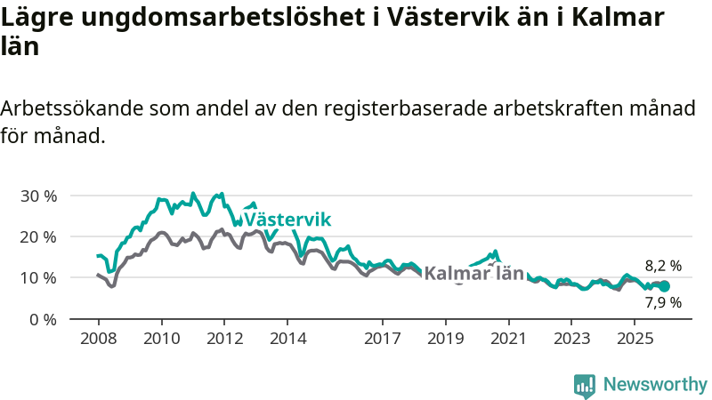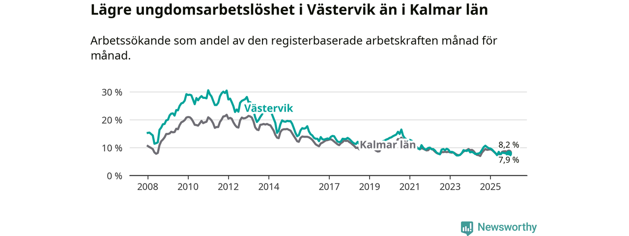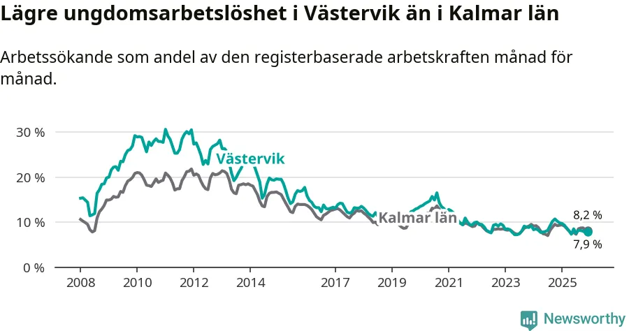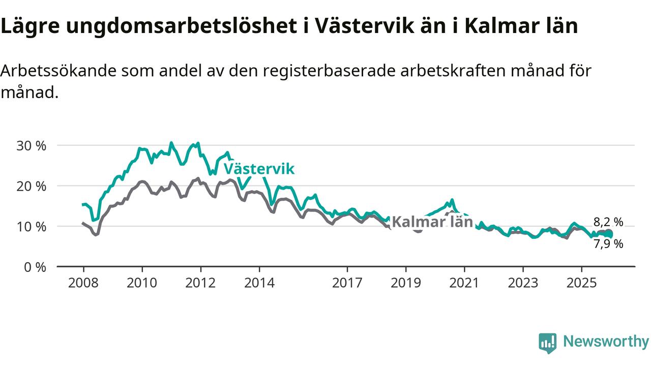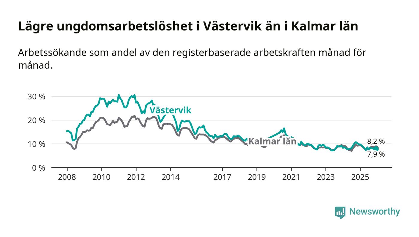 Precis som den totala arbetslösheten ligger ungdomsarbetslösheten i Västervik lägre än i Kalmar län som helhet. Skillnaden mellan kommunen och länet är 0,3 procentenheter.
