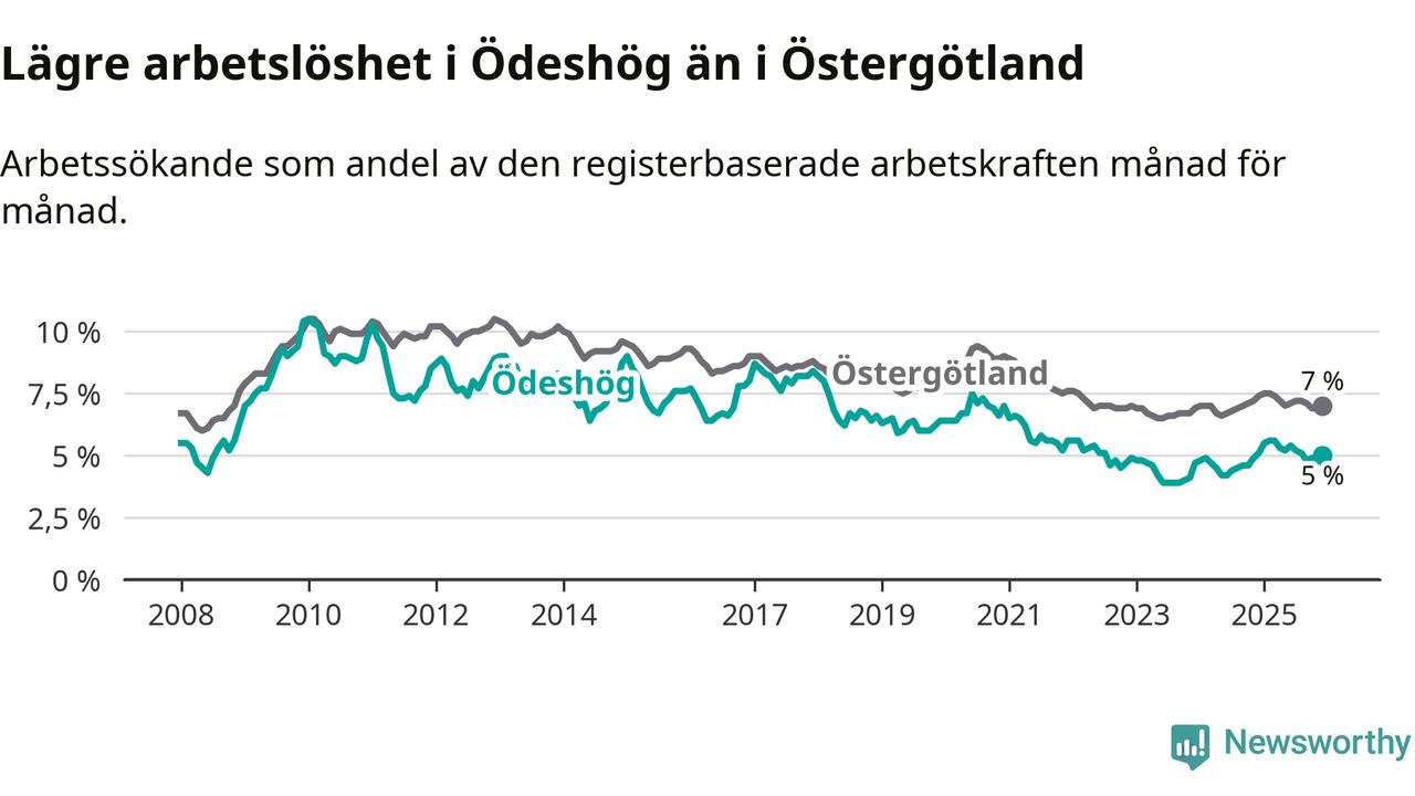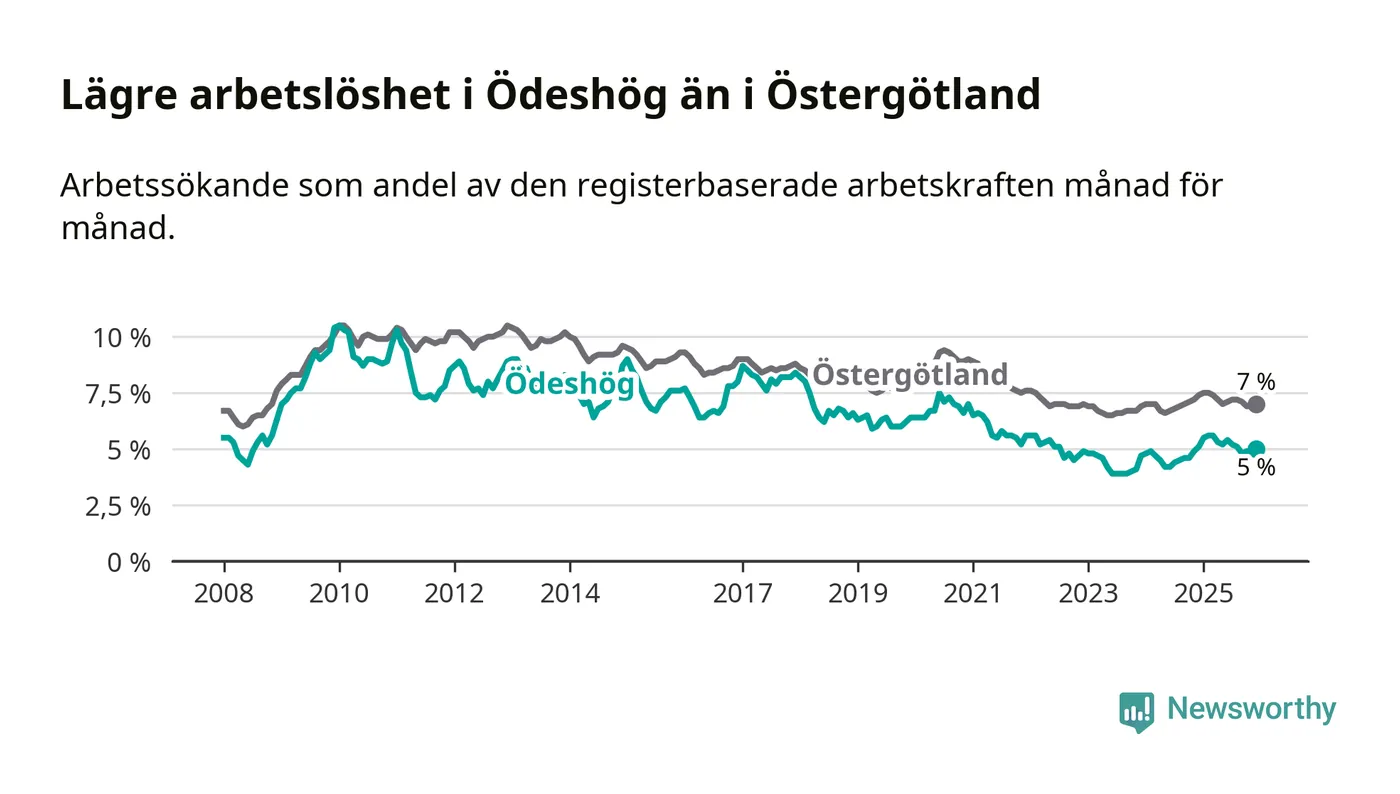 Ödeshög hade redan tidigare lägre arbetslöshet än snittet i hela Östergötlands län och nu växer klyftan (5,0 procent i kommunen, jämfört med 7,0 procent i hela länet). Ydre har den lägsta arbetslösheten i länet (3,3 procent), medan Norrköping har den högsta (9,1 procent). För att Ödeshög skulle komma ner i samma arbetslöshetsnivå som Ydre skulle 41 personer behöva sysselsättas.
