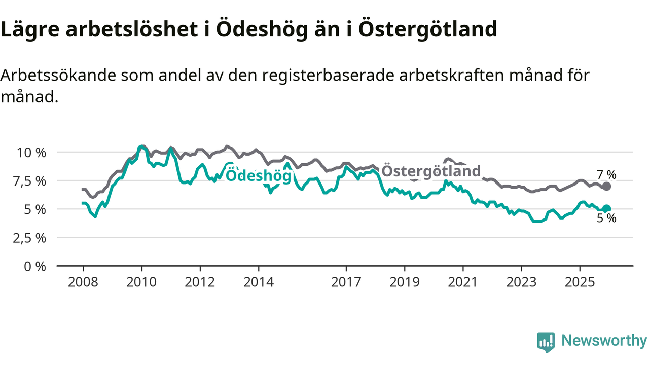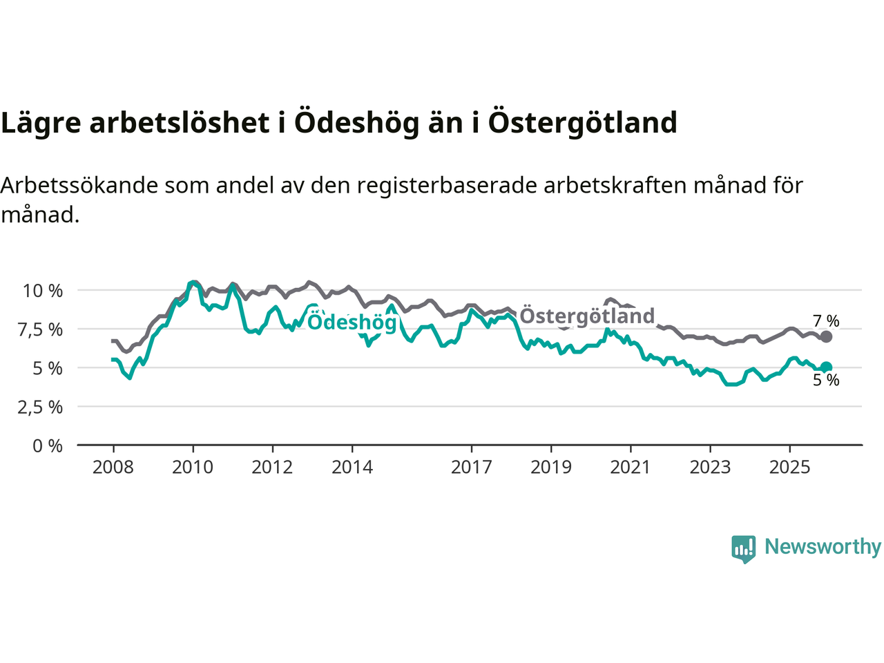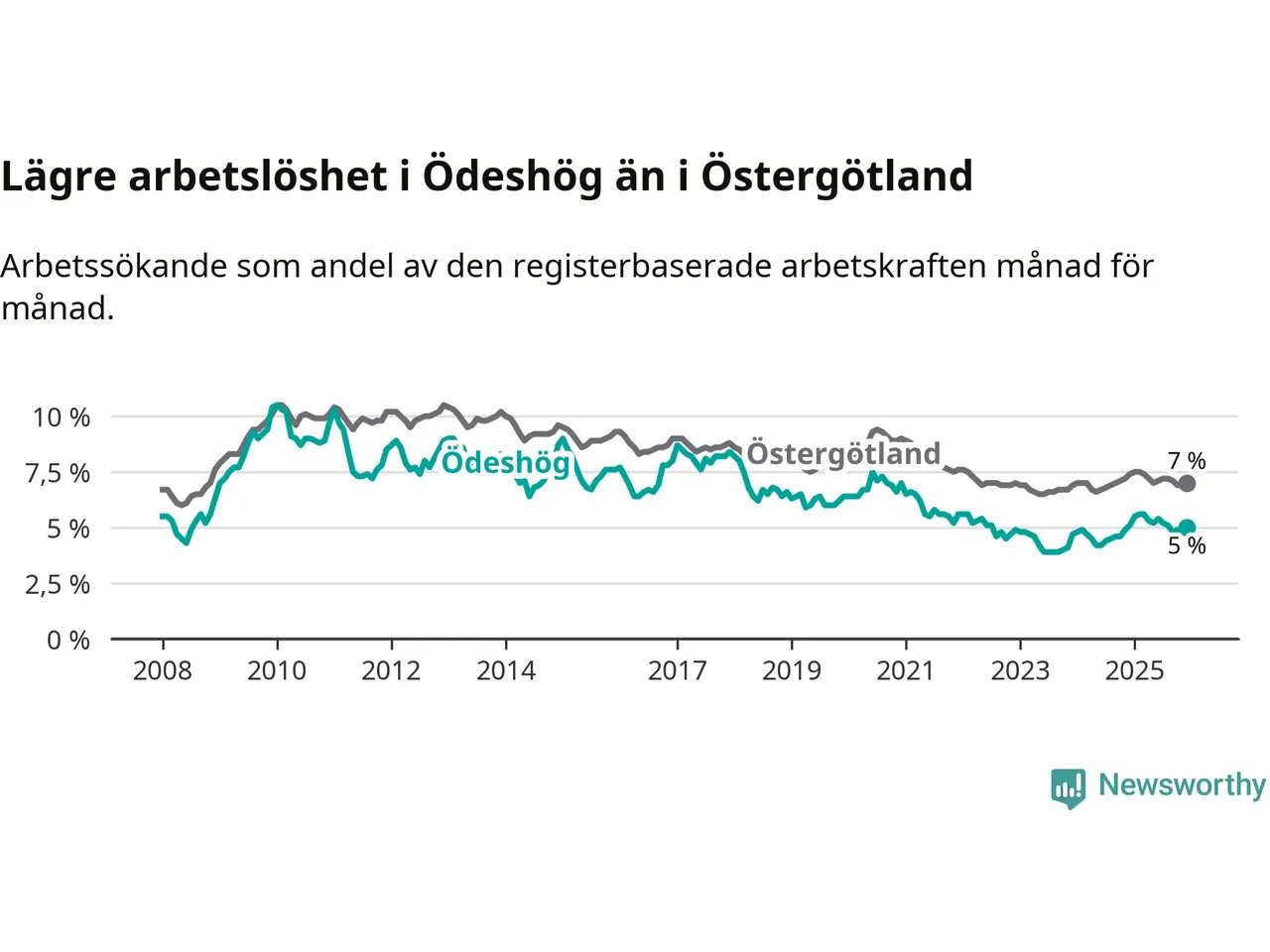 Under december månad rapporterade Ödeshögs kommun en total arbetslöshet på 5,0 procent. Det är en minskning jämfört med samma tidpunkt i fjol (−0,1 procentenheter). Även i Östergötlands län sjunker arbetslösheten .