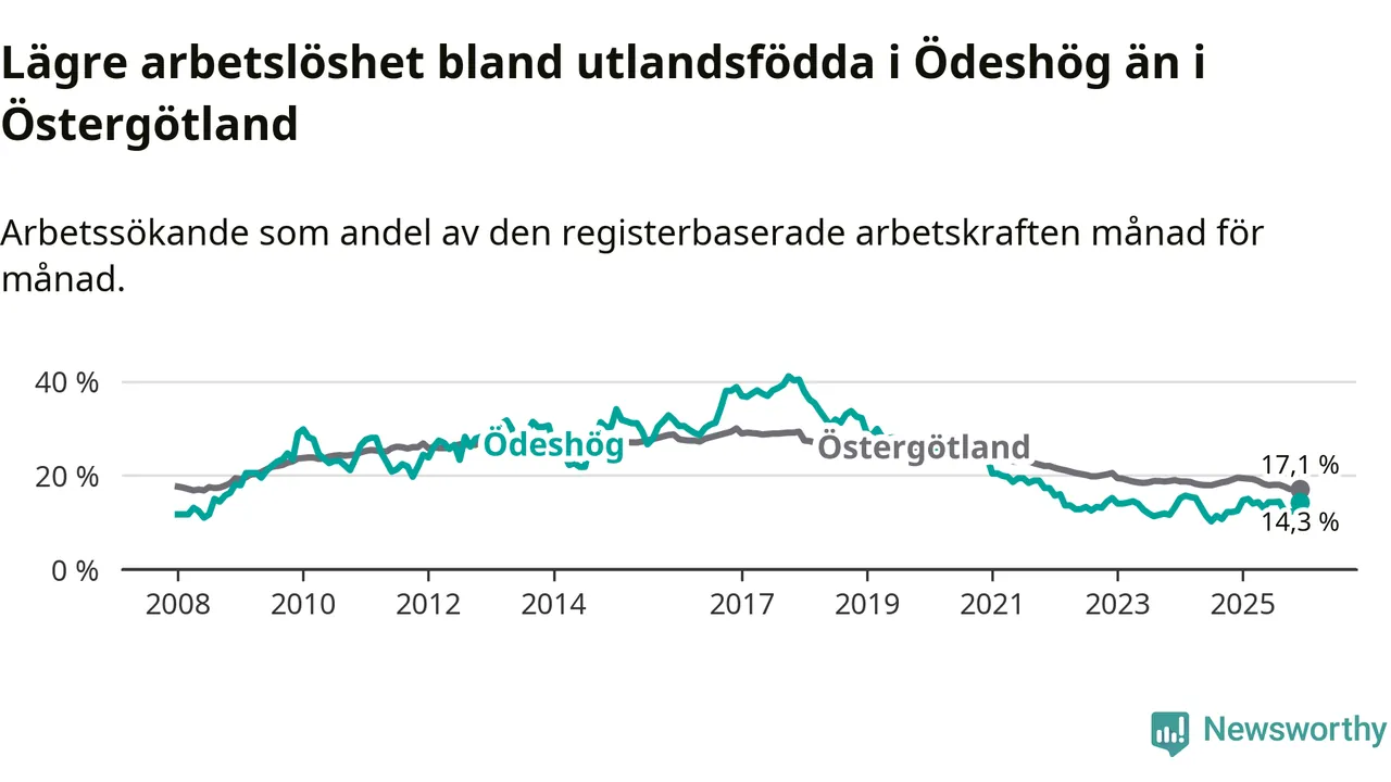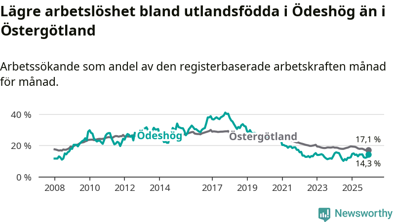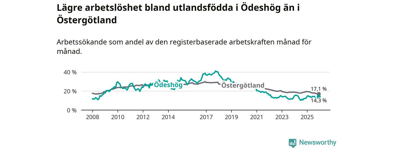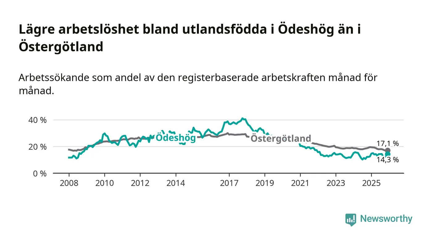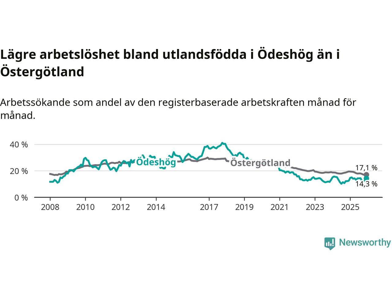 Medan arbetslösheten bland utlandsfödda alltså ökar i Ödeshög så minskar den i Östergötland. Jämfört med december förra året har andelen arbetslösa utlandsfödda i länet minskat med 2,4 procentenheter (till 17,1 procent). Trots den senaste uppgången har Ödeshög med andra ord fortfarande lägre arbetslöshet bland utlandsfödda än Östergötland.
