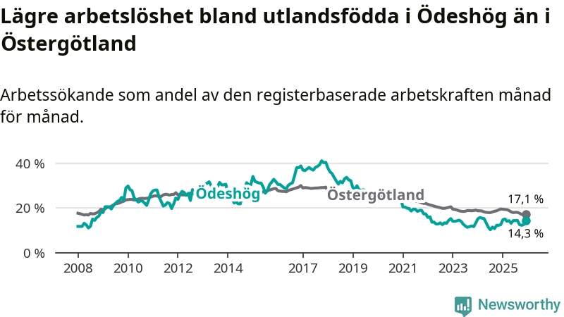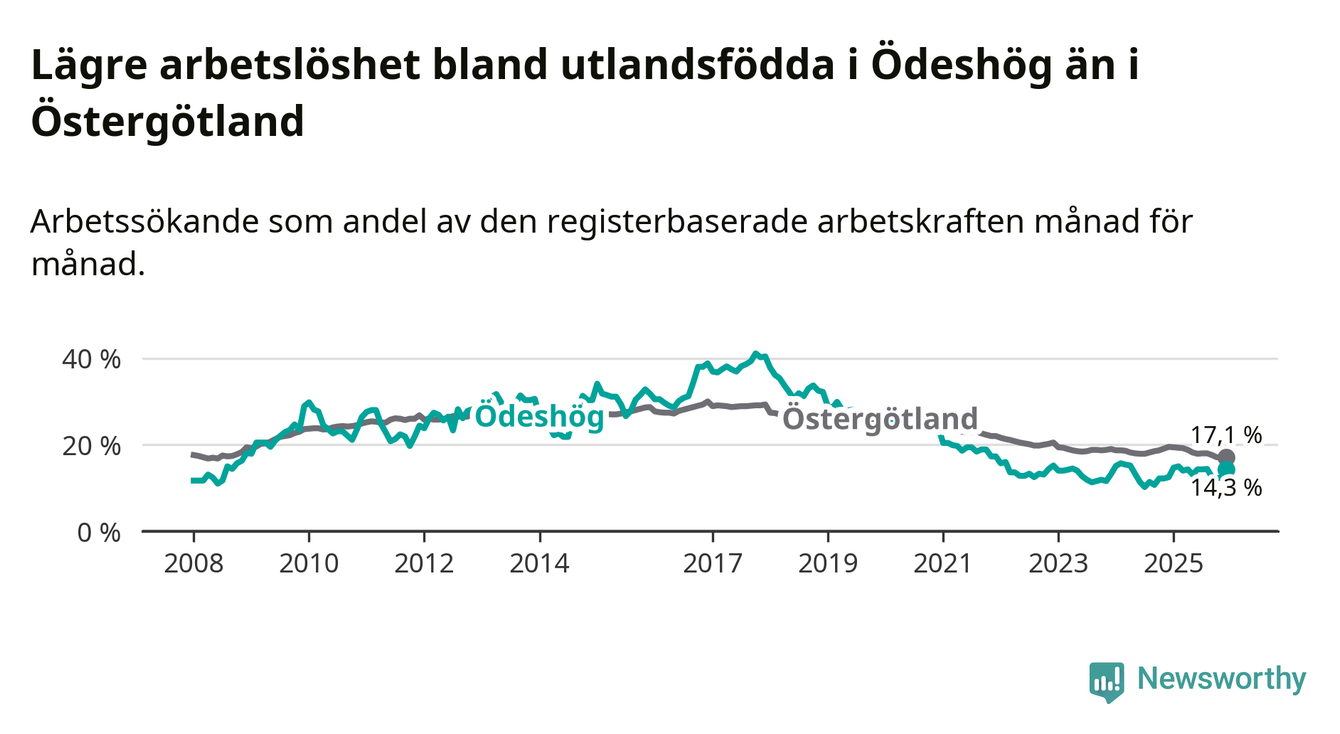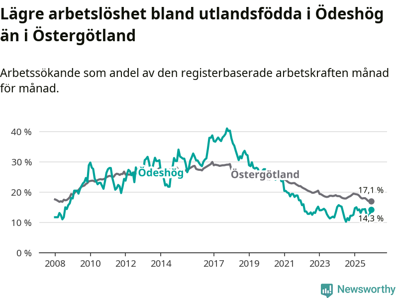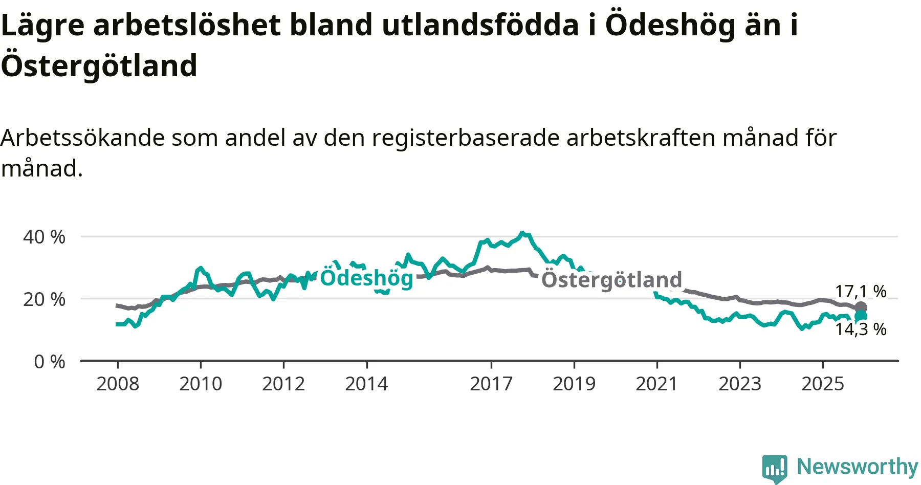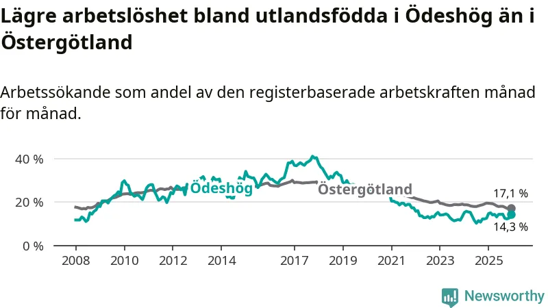 Medan arbetslösheten bland utlandsfödda alltså ökar i Ödeshög så minskar den i Östergötland. Jämfört med december förra året har andelen arbetslösa utlandsfödda i länet minskat med 2,4 procentenheter (till 17,1 procent). Trots den senaste uppgången har Ödeshög med andra ord fortfarande lägre arbetslöshet bland utlandsfödda än Östergötland.