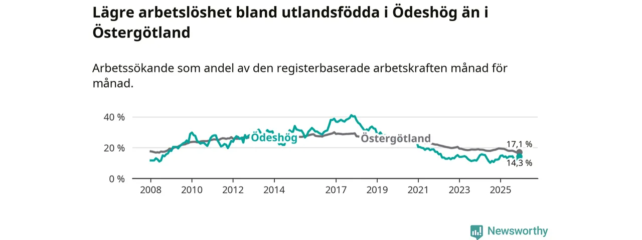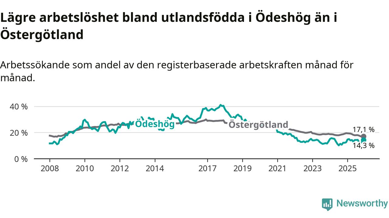 Graf: Arbetslöshet bland utrikesfödda i Ödeshögs kommun och Östergötlands län