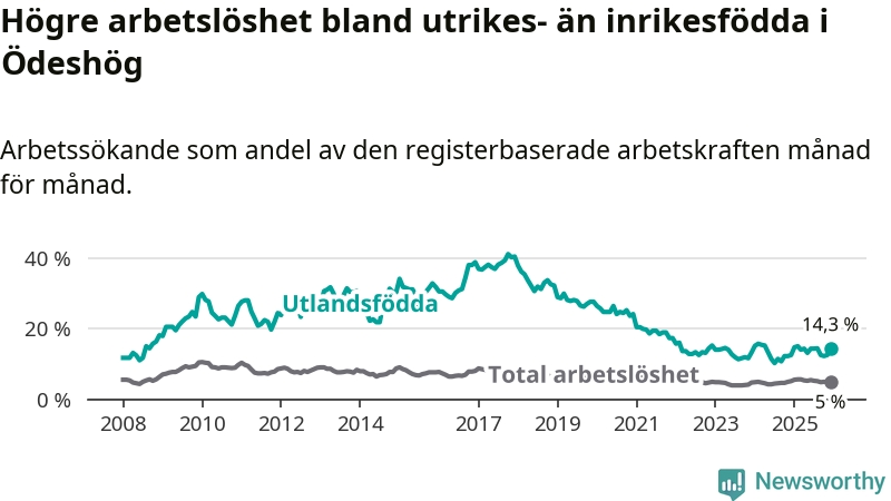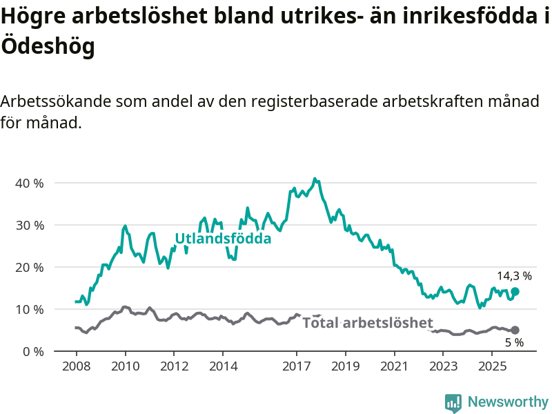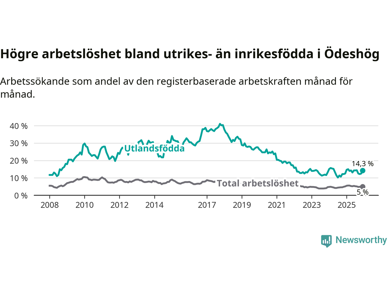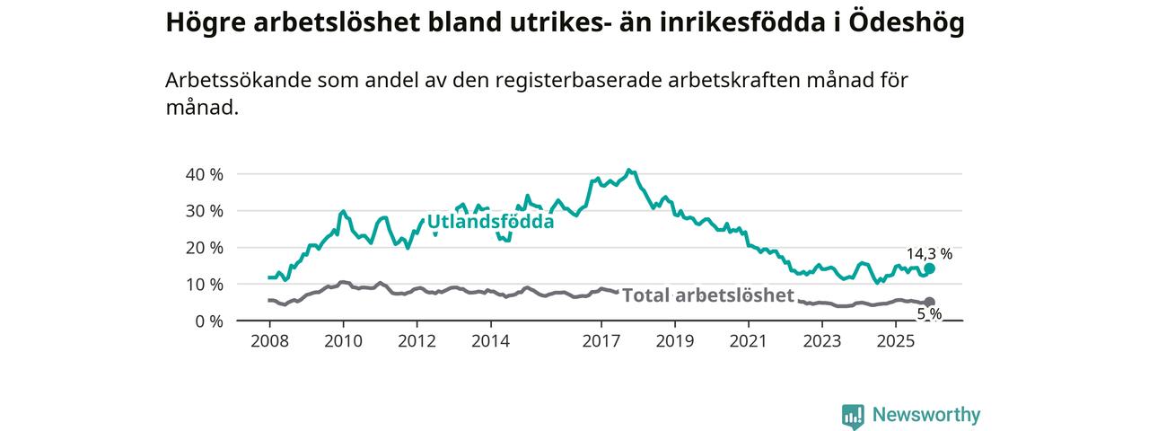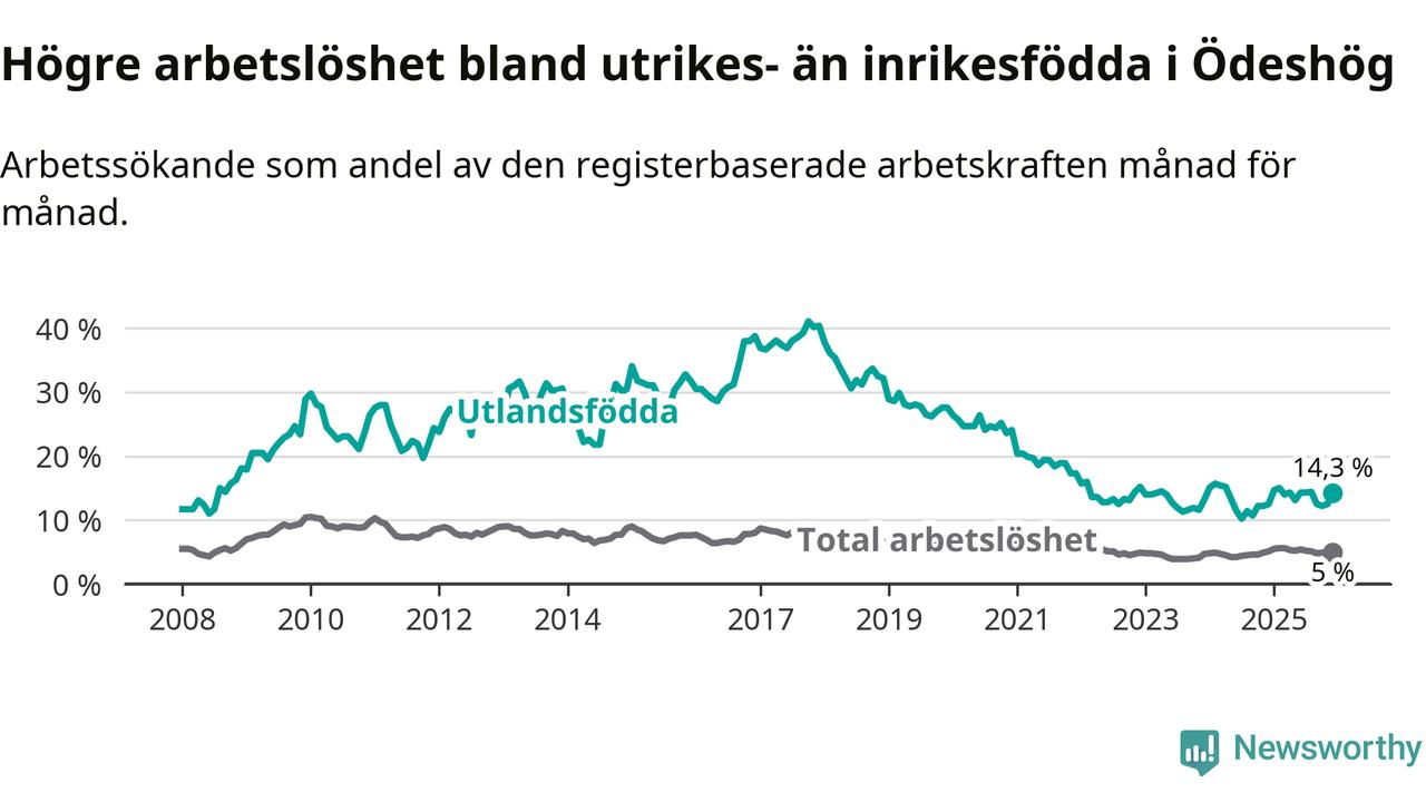 Arbetslösheten bland utlandsfödda var 14,3 procent i Ödeshög under december månad, motsvarande 47 av 329 personer. Det är 1,8 procentenheter fler än vid samma tidpunkt i fjol (+6 om man räknar personer).