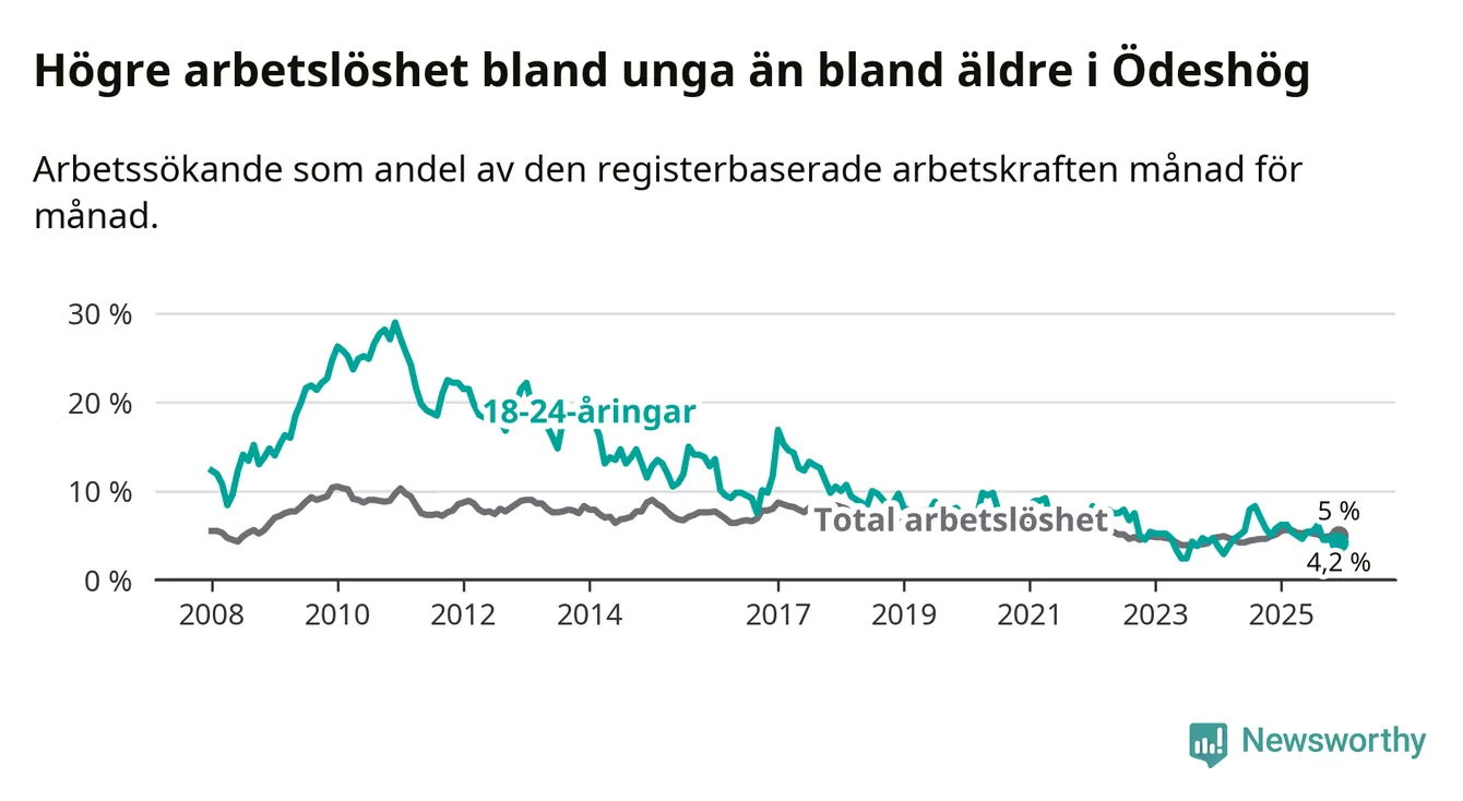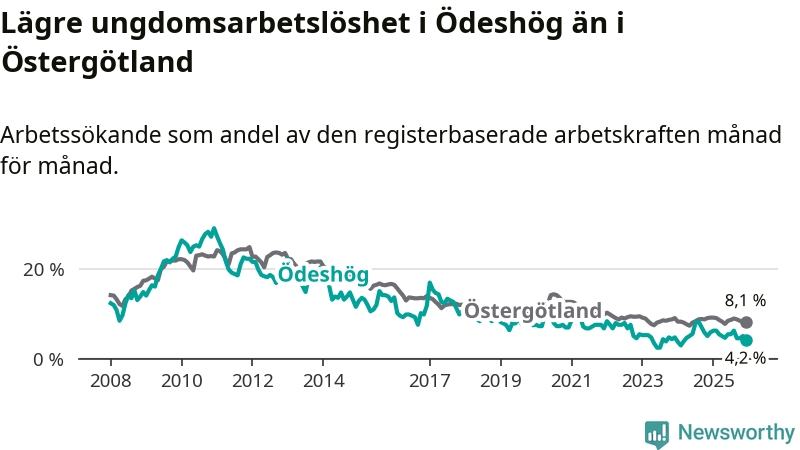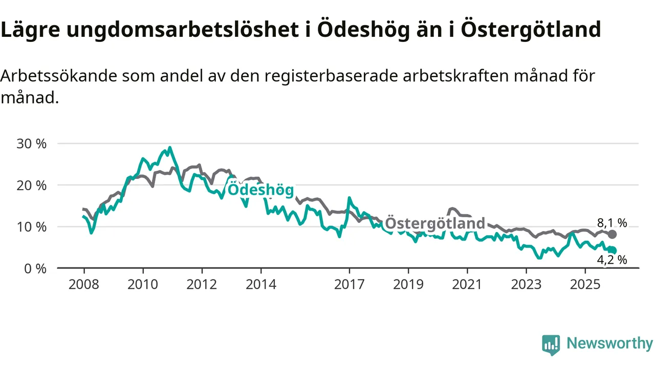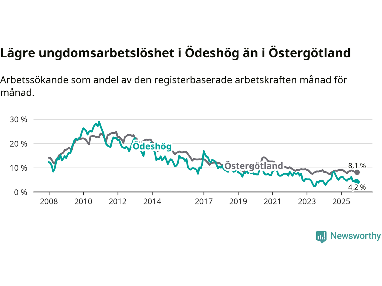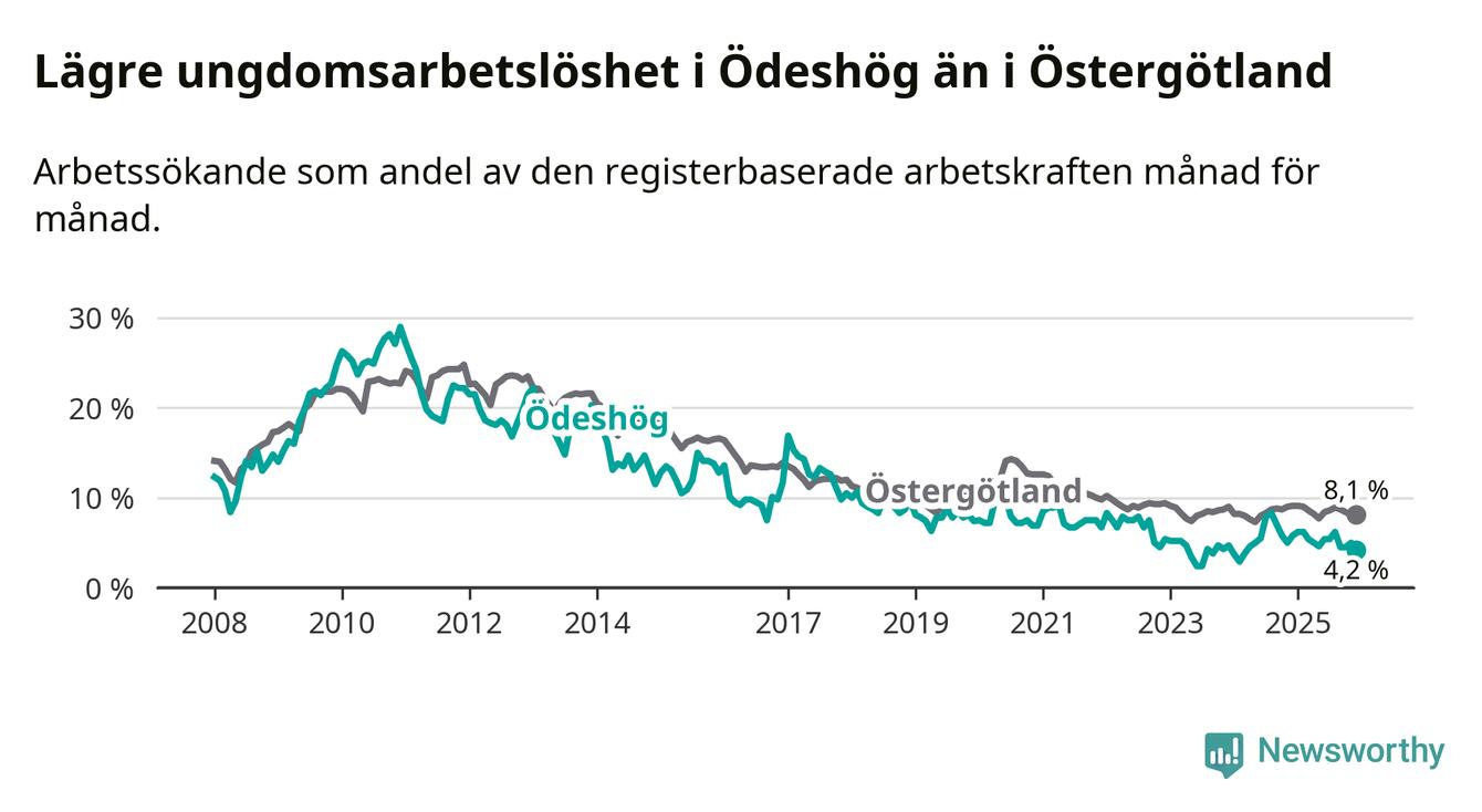 Precis som den totala arbetslösheten ligger ungdomsarbetslösheten i Ödeshög lägre än i Östergötland som helhet. Skillnaden mellan kommunen och länet är 3,9 procentenheter.