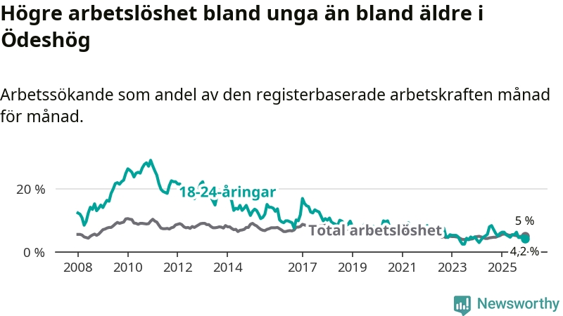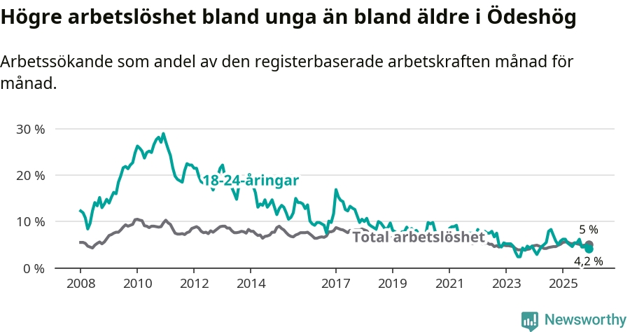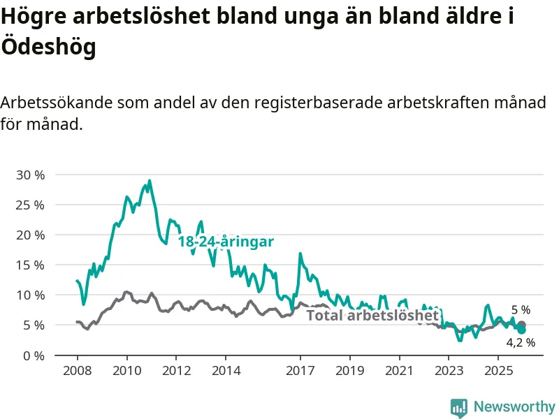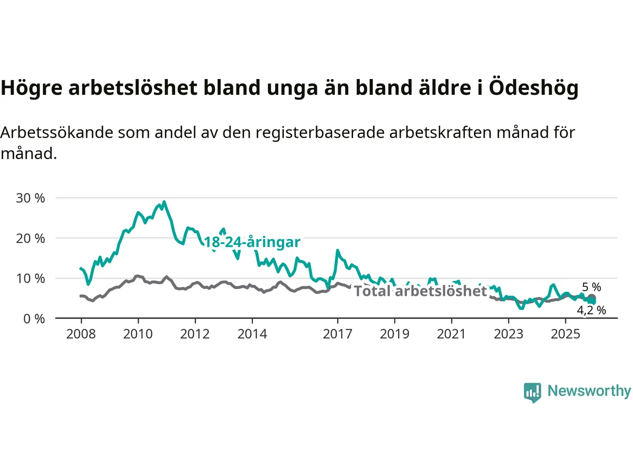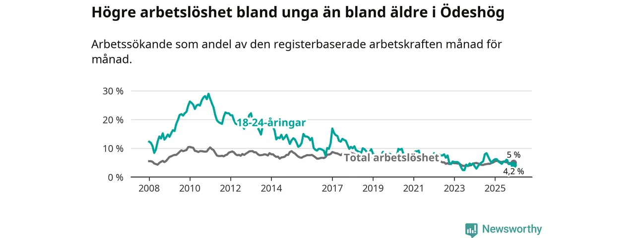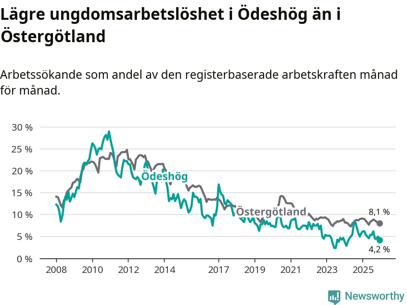 Precis som den totala arbetslösheten ligger ungdomsarbetslösheten i Ödeshög lägre än i Östergötland som helhet. Skillnaden mellan kommunen och länet är 3,9 procentenheter.