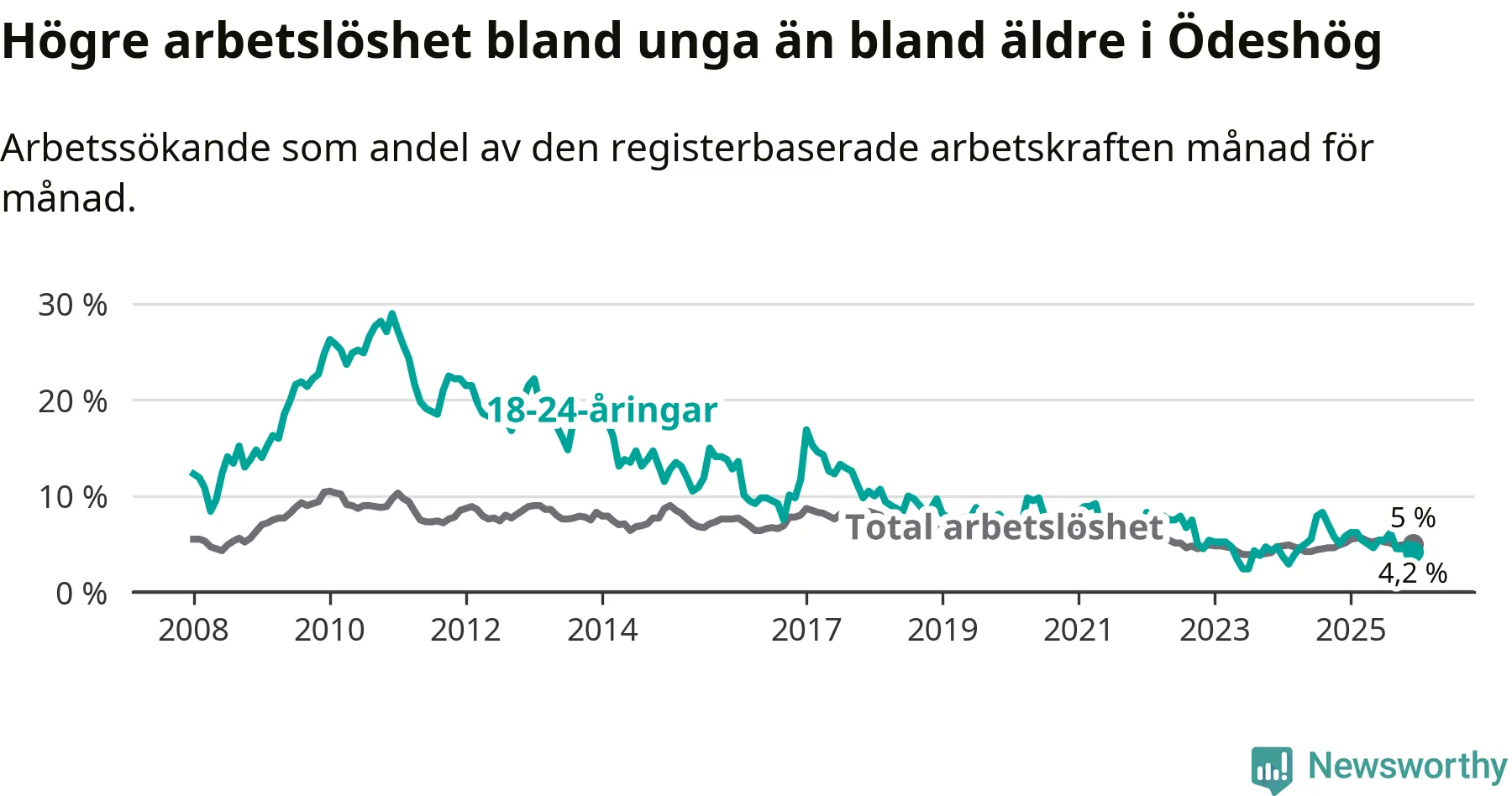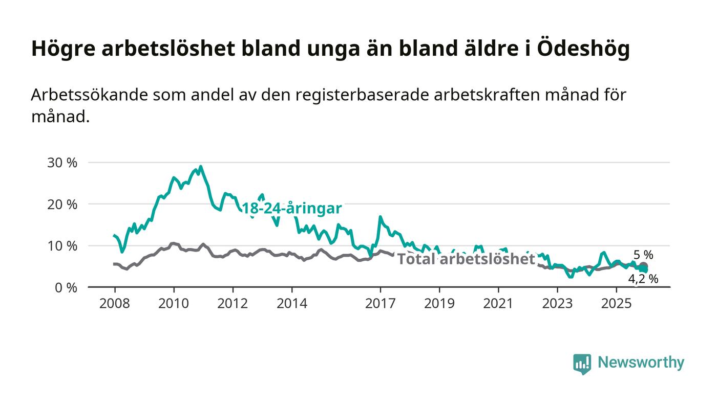 Graf: Arbetslöshet bland unga i Ödeshögs kommun och Östergötlands län