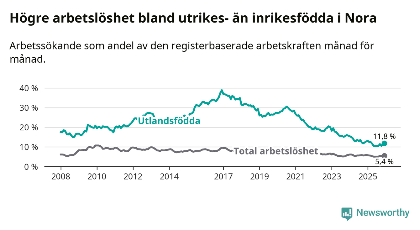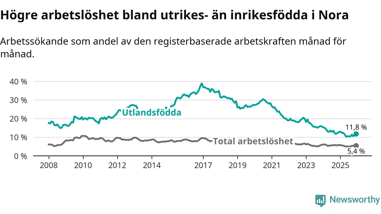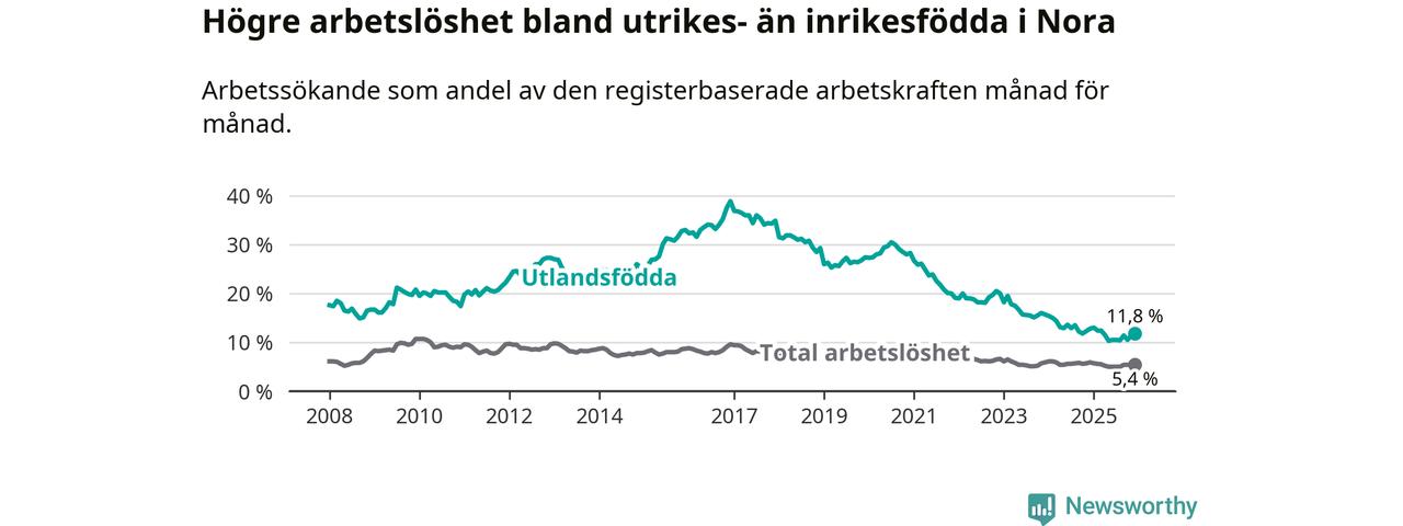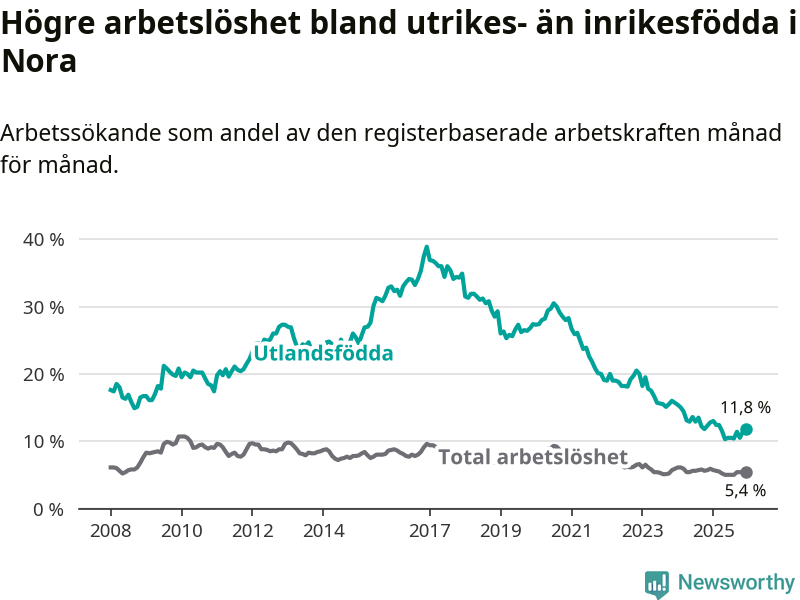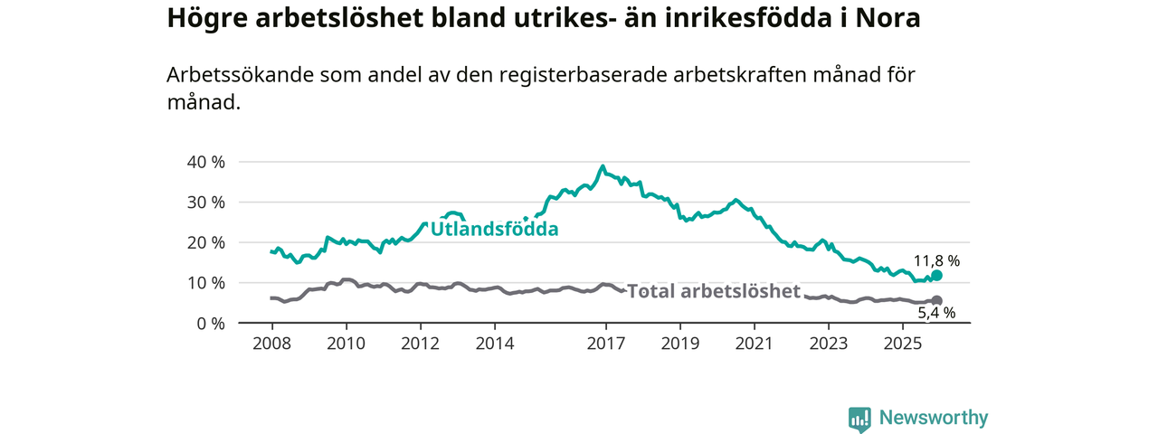 Arbetslösheten bland utlandsfödda var 11,8 procent i Nora under december månad, motsvarande 84 av 712 personer. Det är 1,0 procentenheter färre än vid samma tidpunkt i fjol (−10 om man räknar personer). Därmed har de utlandsföddas arbetslöshet varit lägre än vid samma tidpunkt i fjol i över tre år i sträck. Sedan december 2022 har arbetslösheten bland utlandsfödda minskat från 20,0 till 11,8 procent.