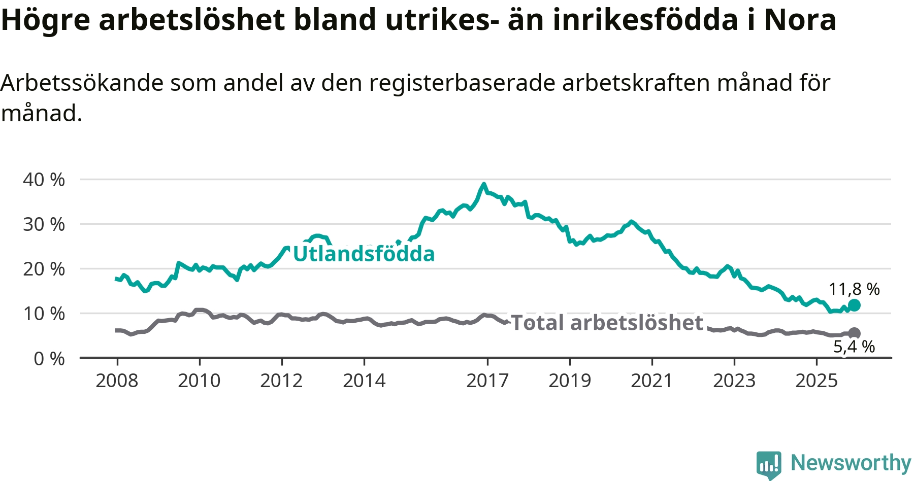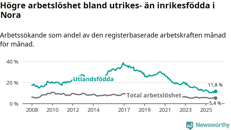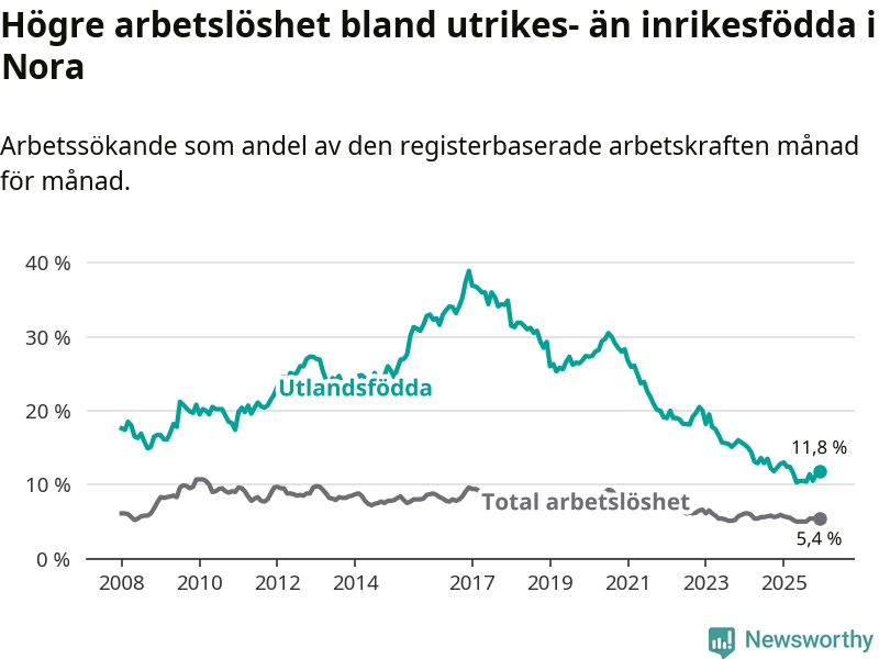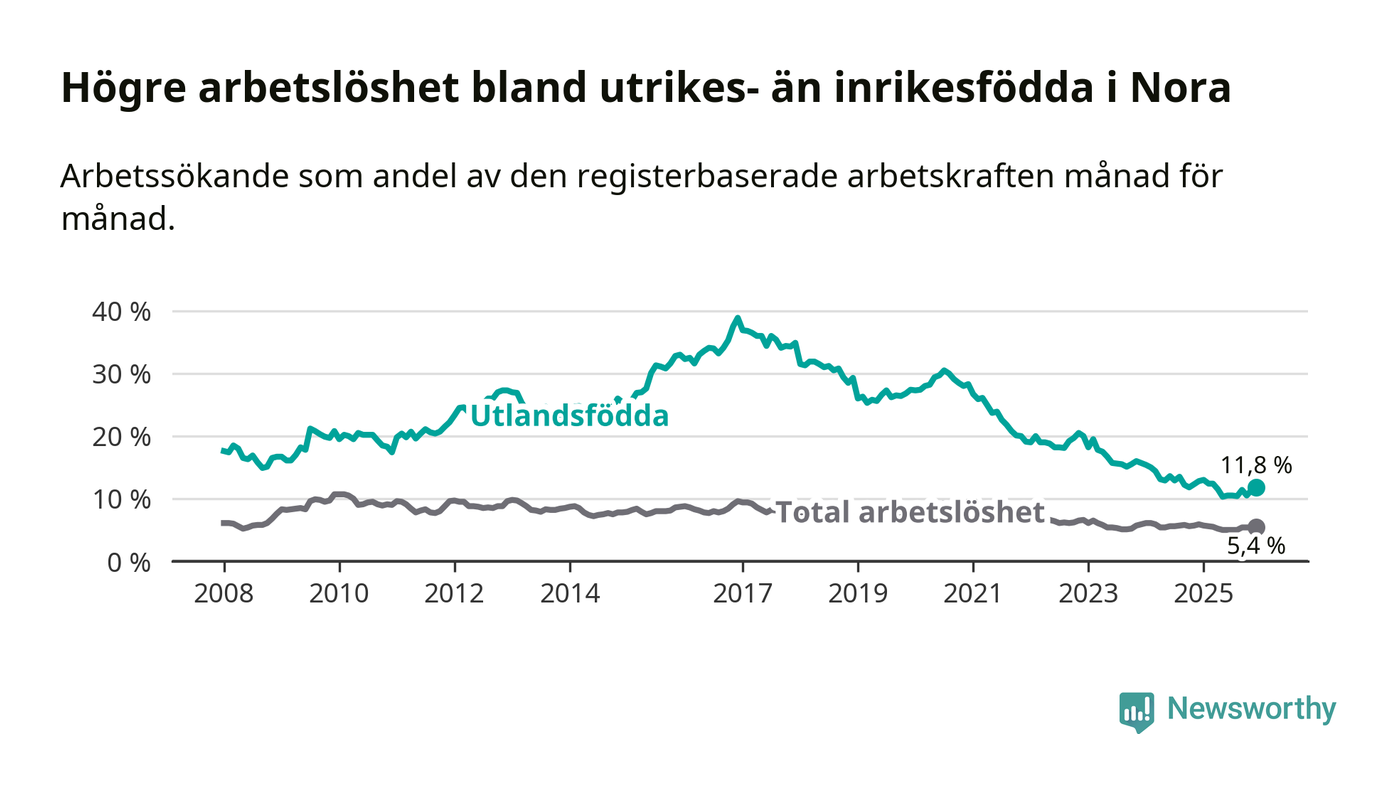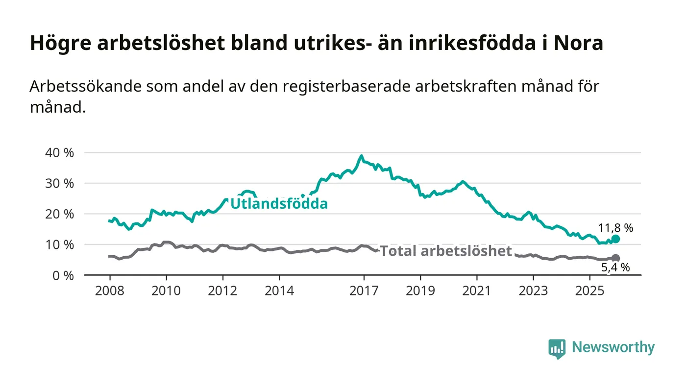 Arbetslösheten bland utlandsfödda var 11,8 procent i Nora under december månad, motsvarande 84 av 712 personer. Det är 1,0 procentenheter färre än vid samma tidpunkt i fjol (−10 om man räknar personer). Därmed har de utlandsföddas arbetslöshet varit lägre än vid samma tidpunkt i fjol i över tre år i sträck. Sedan december 2022 har arbetslösheten bland utlandsfödda minskat från 20,0 till 11,8 procent.