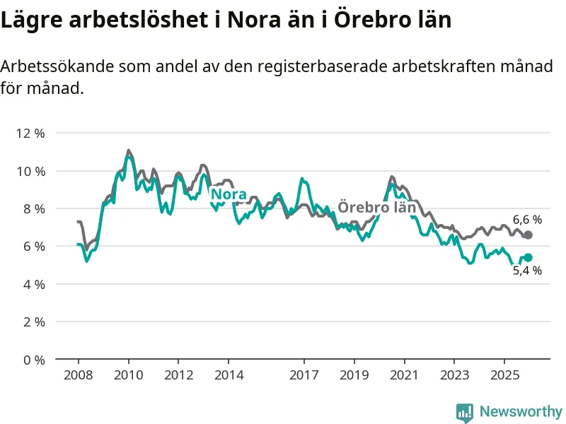 Under december månad rapporterade Nora kommun en total arbetslöshet på 5,4 procent. Det är en minskning jämfört med samma tidpunkt i fjol (−0,5 procentenheter). Även i Örebro län sjunker arbetslösheten .