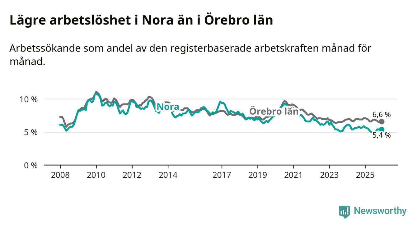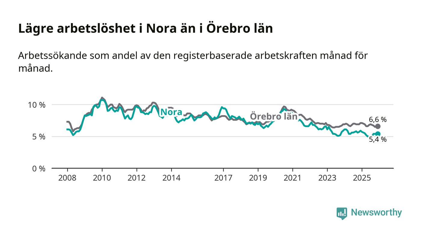 Nora hade redan tidigare lägre arbetslöshet än snittet i hela Örebro län och nu växer klyftan (5,4 procent i kommunen, jämfört med 6,6 procent i hela länet). Askersund har den lägsta arbetslösheten i länet (4,0 procent), medan Hällefors har den högsta (7,5 procent). För att Nora skulle komma ner i samma arbetslöshetsnivå som Askersund skulle 66 personer behöva sysselsättas.