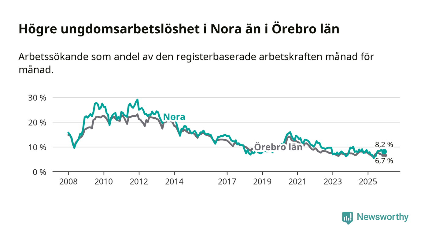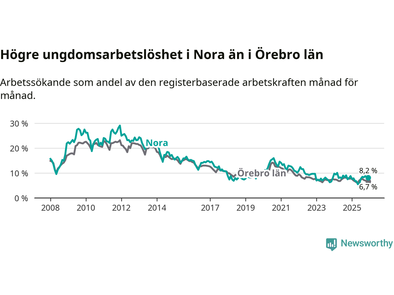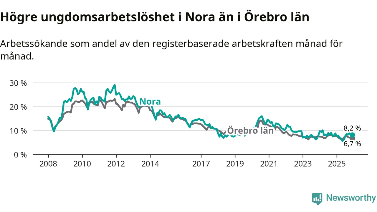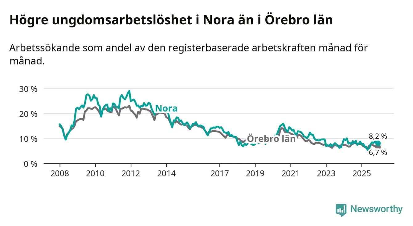 Medan Nora har lägre total arbetslöshet än Örebro, ligger ungdomsarbetslösheten 1,5 procentenheter högre i Nora.