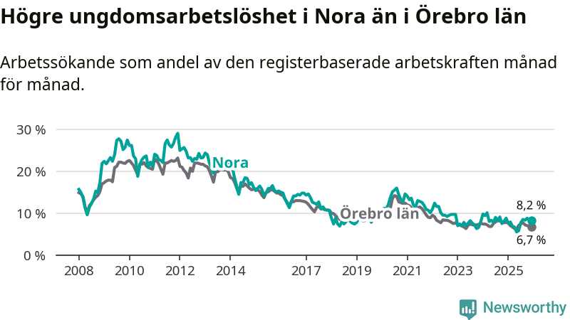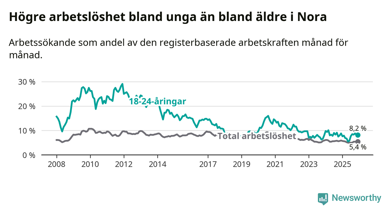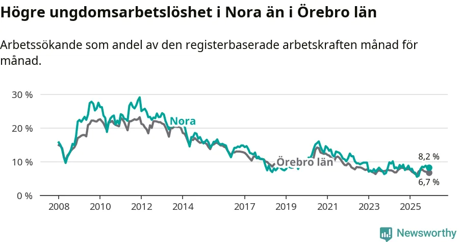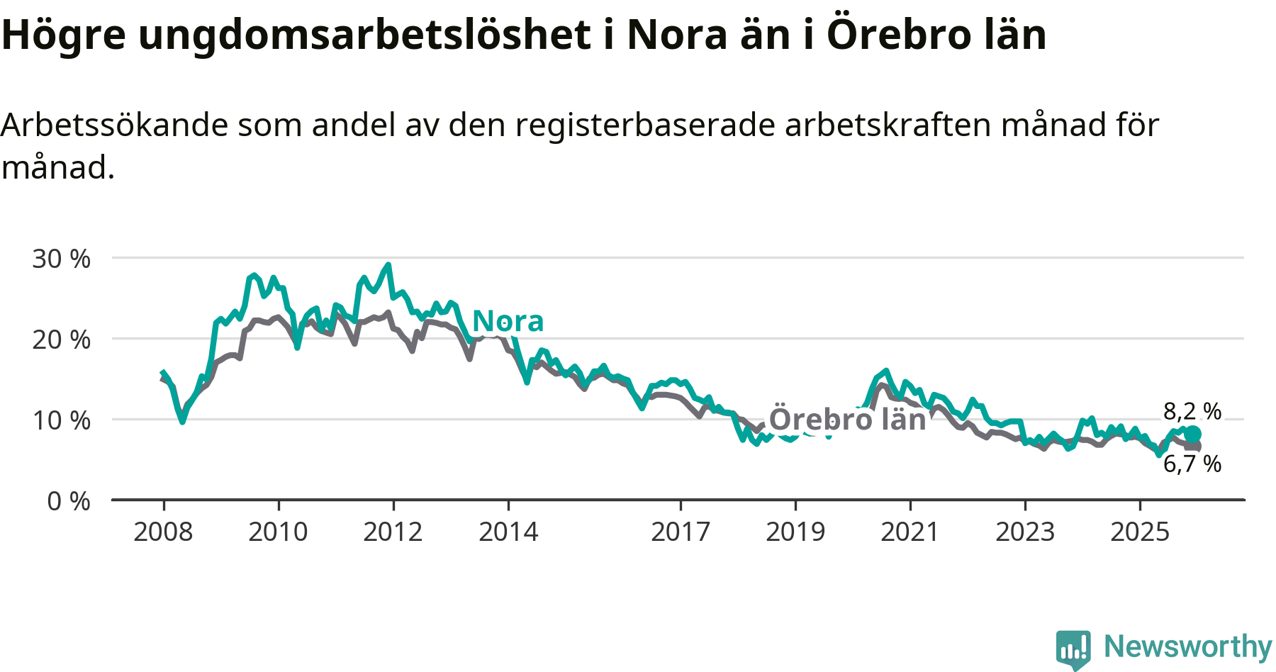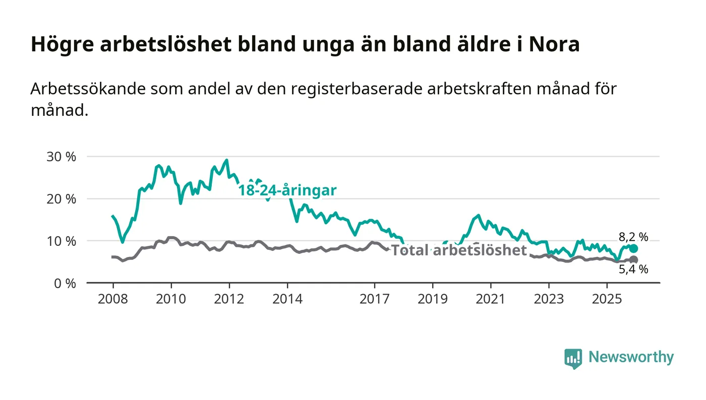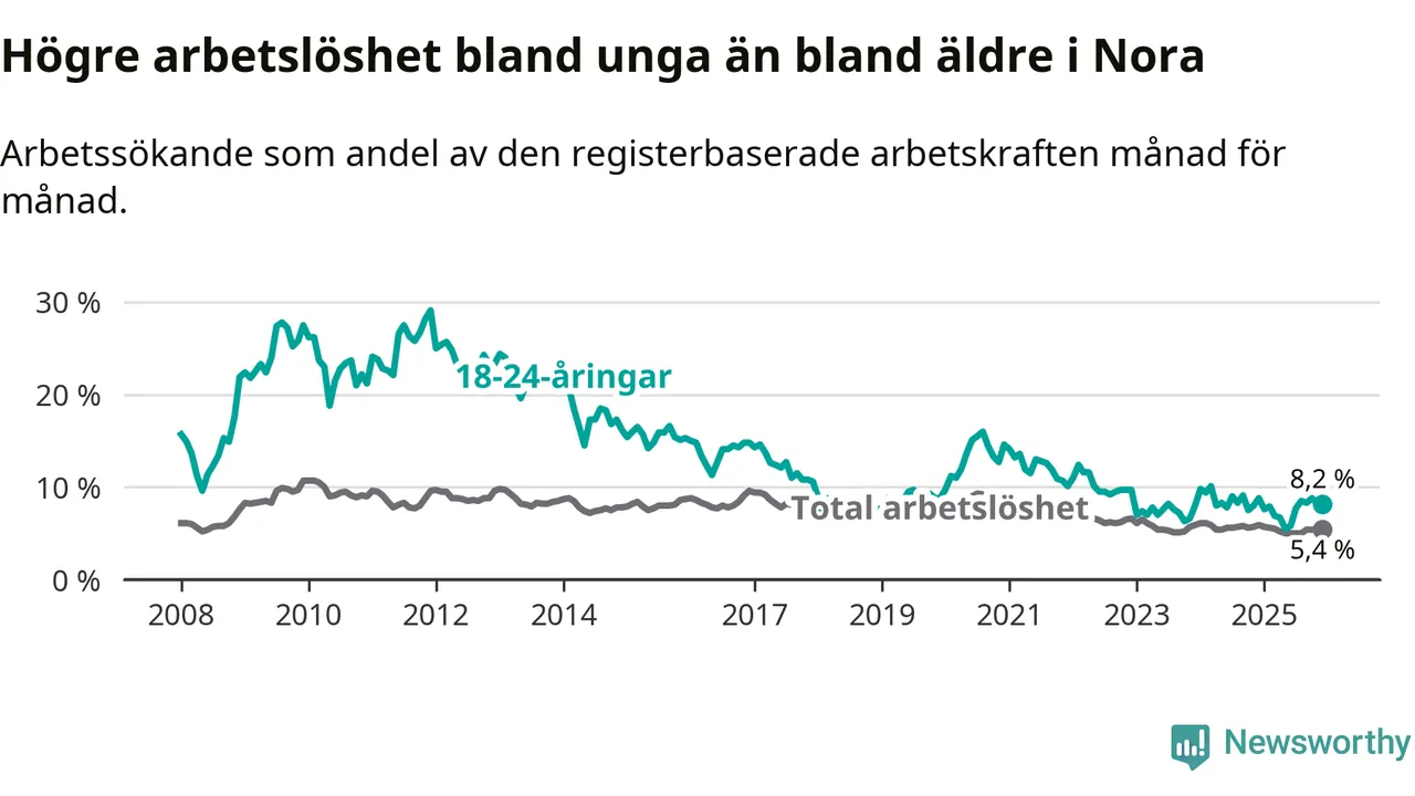 Medan Nora har lägre total arbetslöshet än Örebro, ligger ungdomsarbetslösheten 1,5 procentenheter högre i Nora.