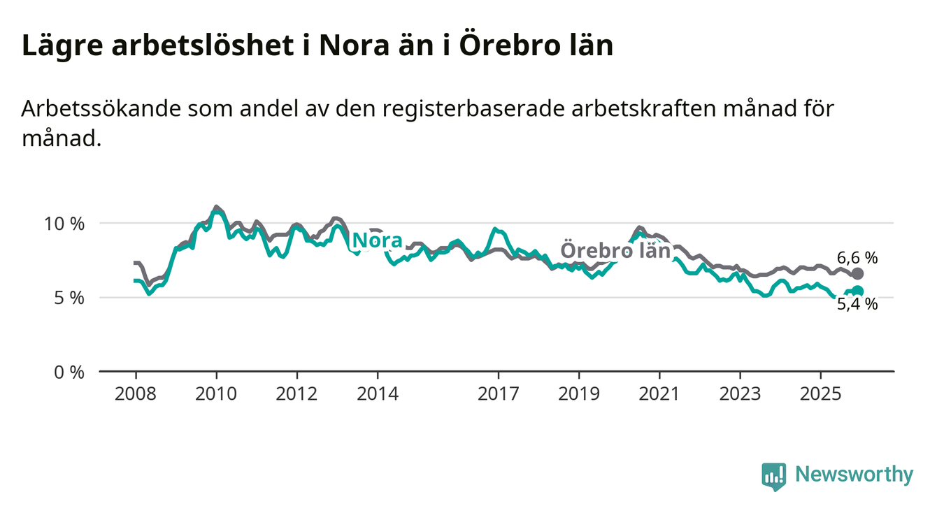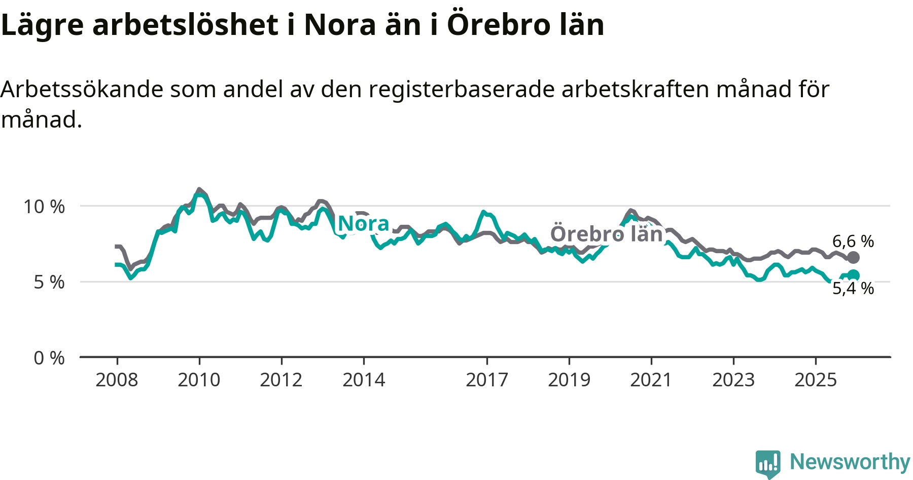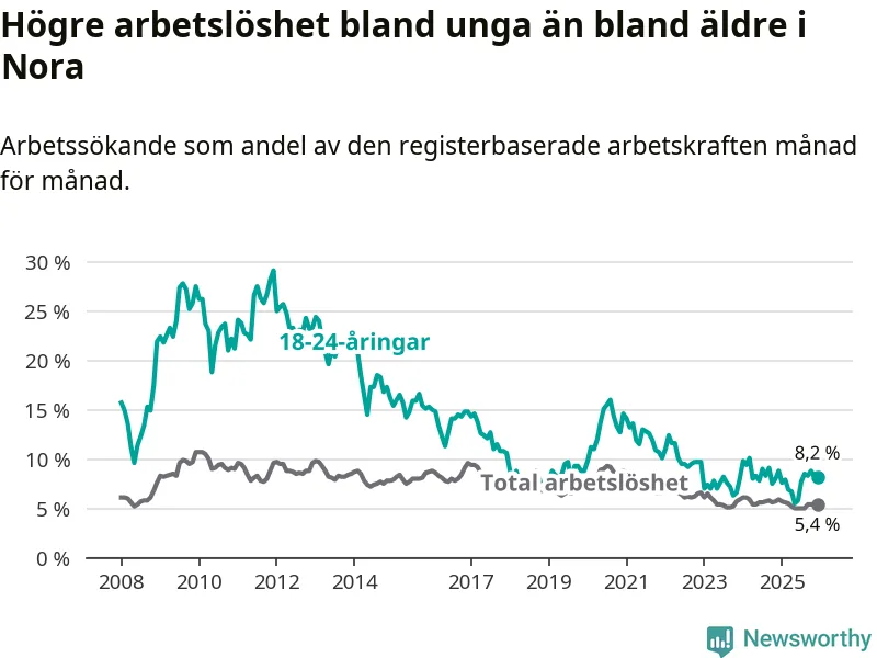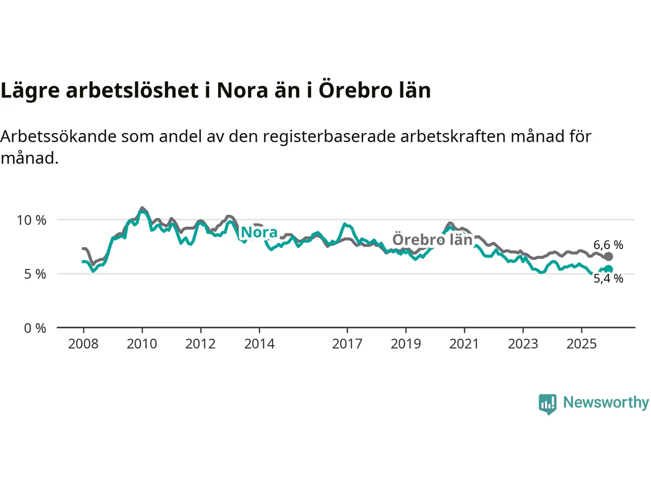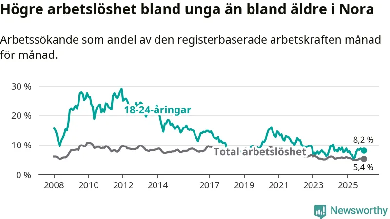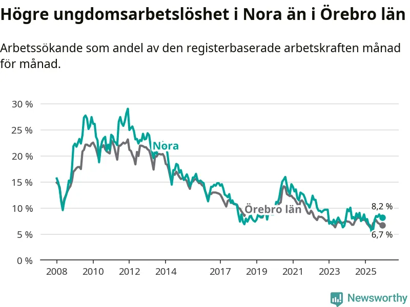 Medan Nora har lägre total arbetslöshet än Örebro, ligger ungdomsarbetslösheten 1,5 procentenheter högre i Nora.