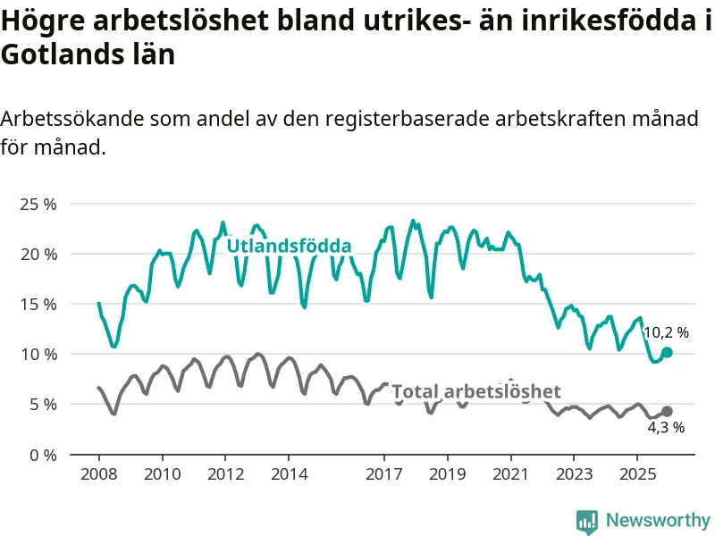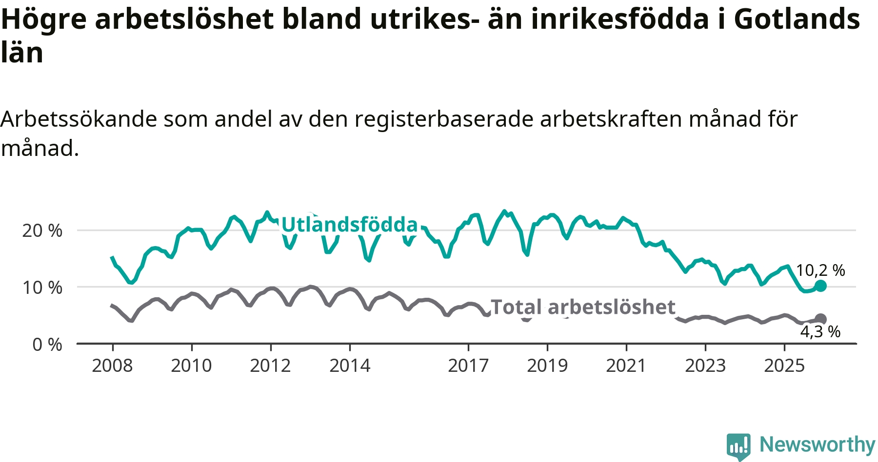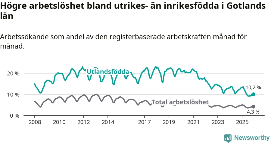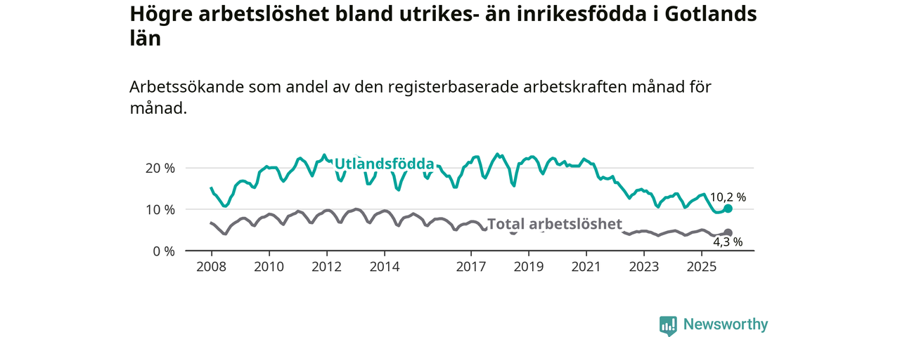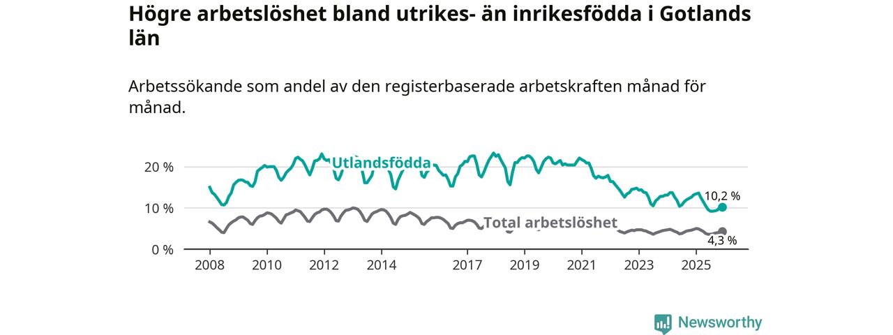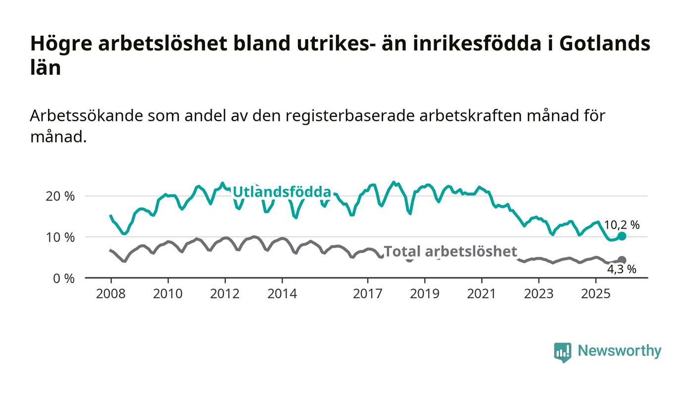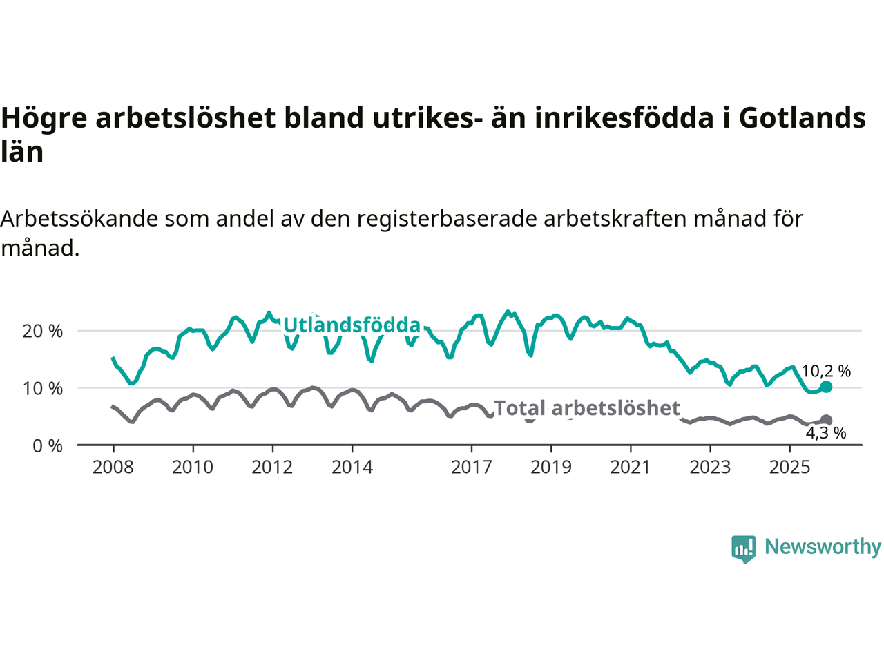 Arbetslösheten bland utlandsfödda var 10,2 procent på Gotland under december månad, motsvarande 291 av 2 853 personer. Det är 3,0 procentenheter färre än vid samma tidpunkt i fjol (−79 om man räknar personer). Därmed är de utlandsföddas arbetslöshet lägre än vid samma tidpunkt i fjol för elfte månaden i följd. Sedan januari 2025 har arbetslösheten bland utlandsfödda minskat från 13,4 till 10,2 procent.