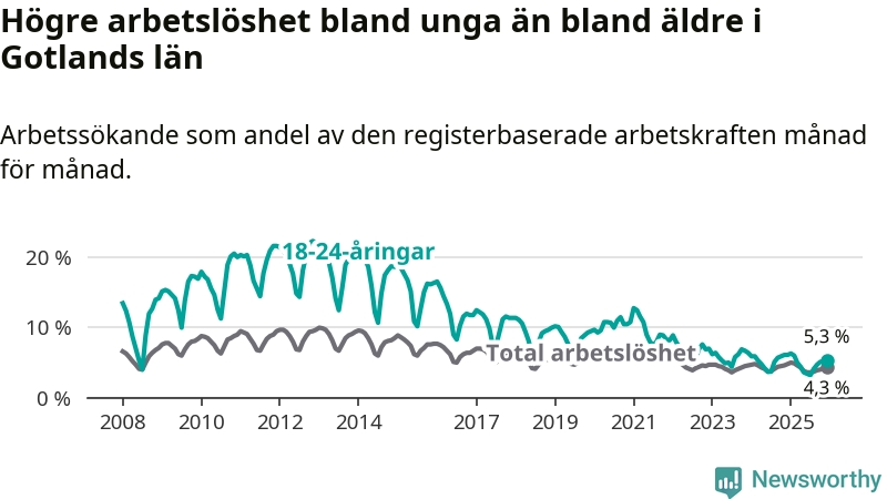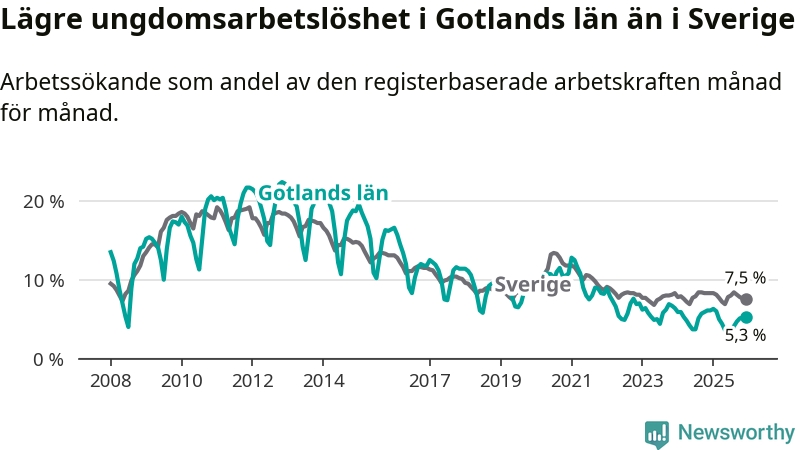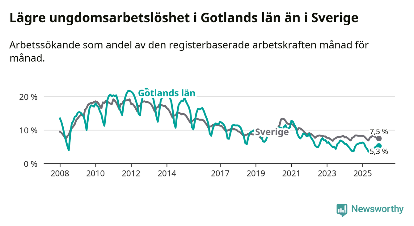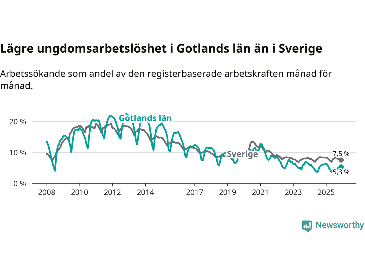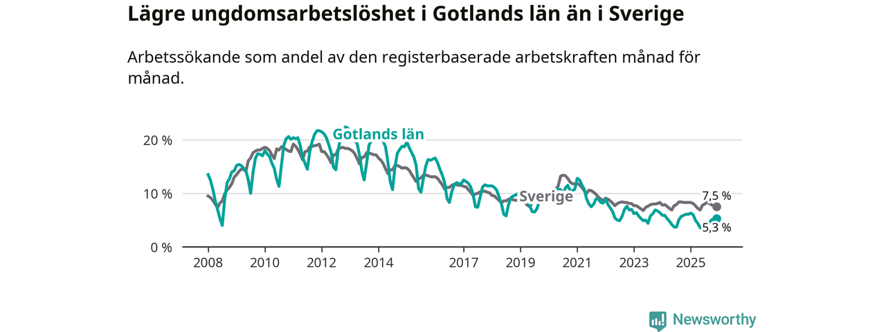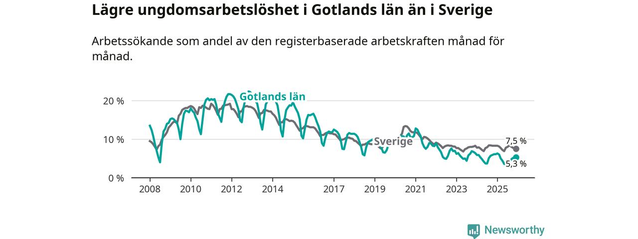 I och med den senaste månadens nedgång har de ungas arbetslöshet på Gotland sjunkit tio månader i följd (ner från 6,0 procent i februari 2025 till 5,3 procent nu).