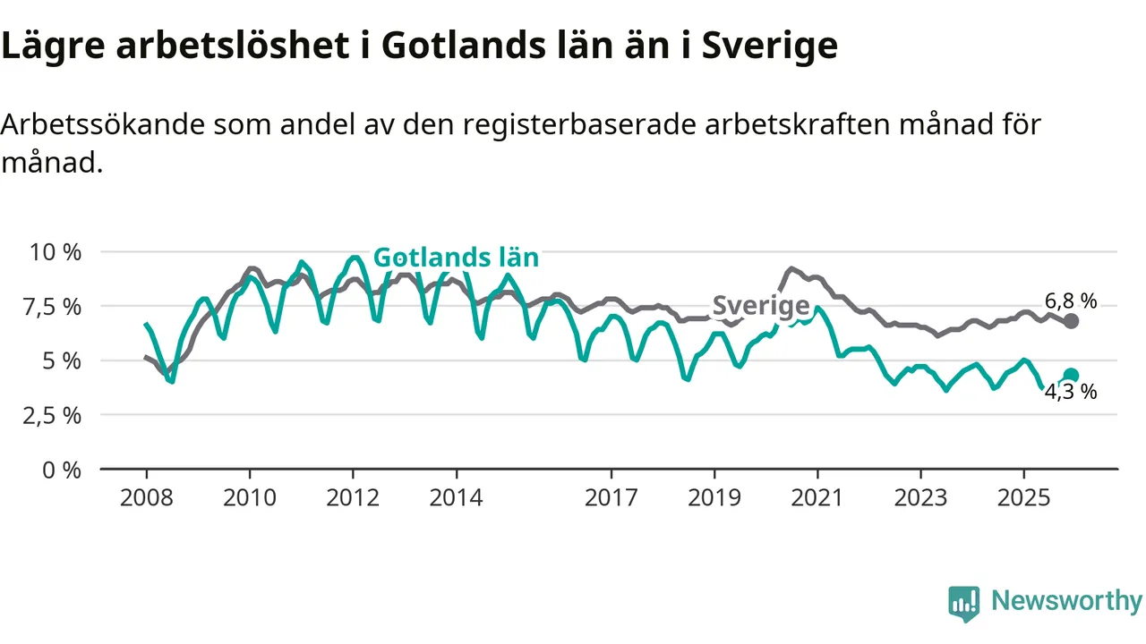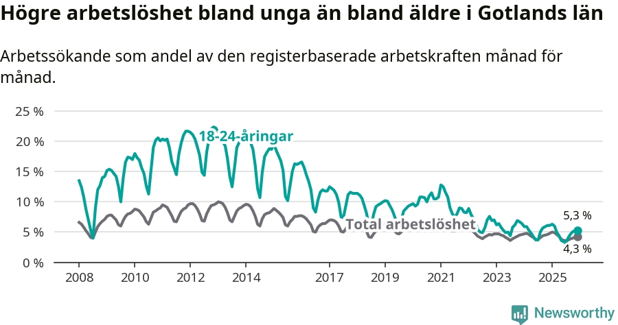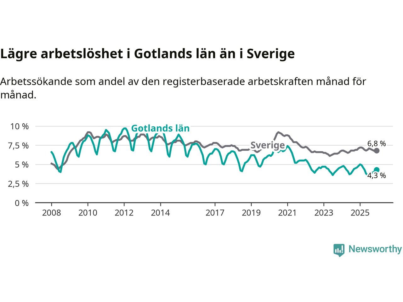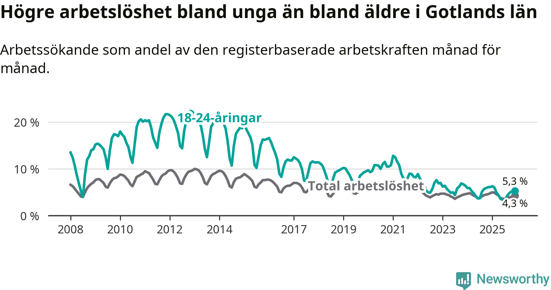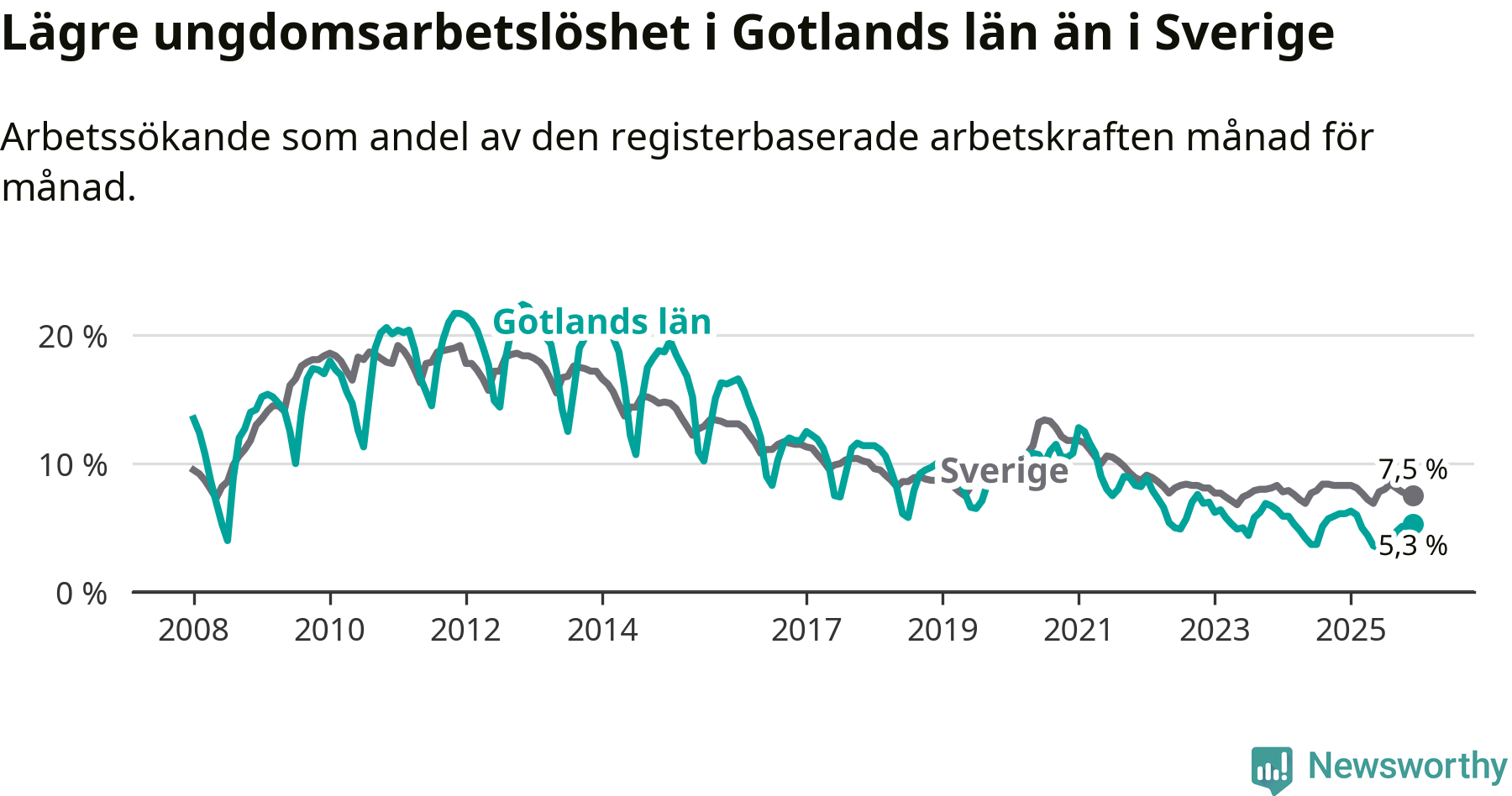 I och med den senaste månadens nedgång har de ungas arbetslöshet på Gotland sjunkit tio månader i följd (ner från 6,0 procent i februari 2025 till 5,3 procent nu).