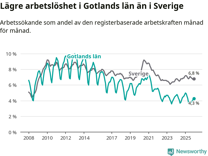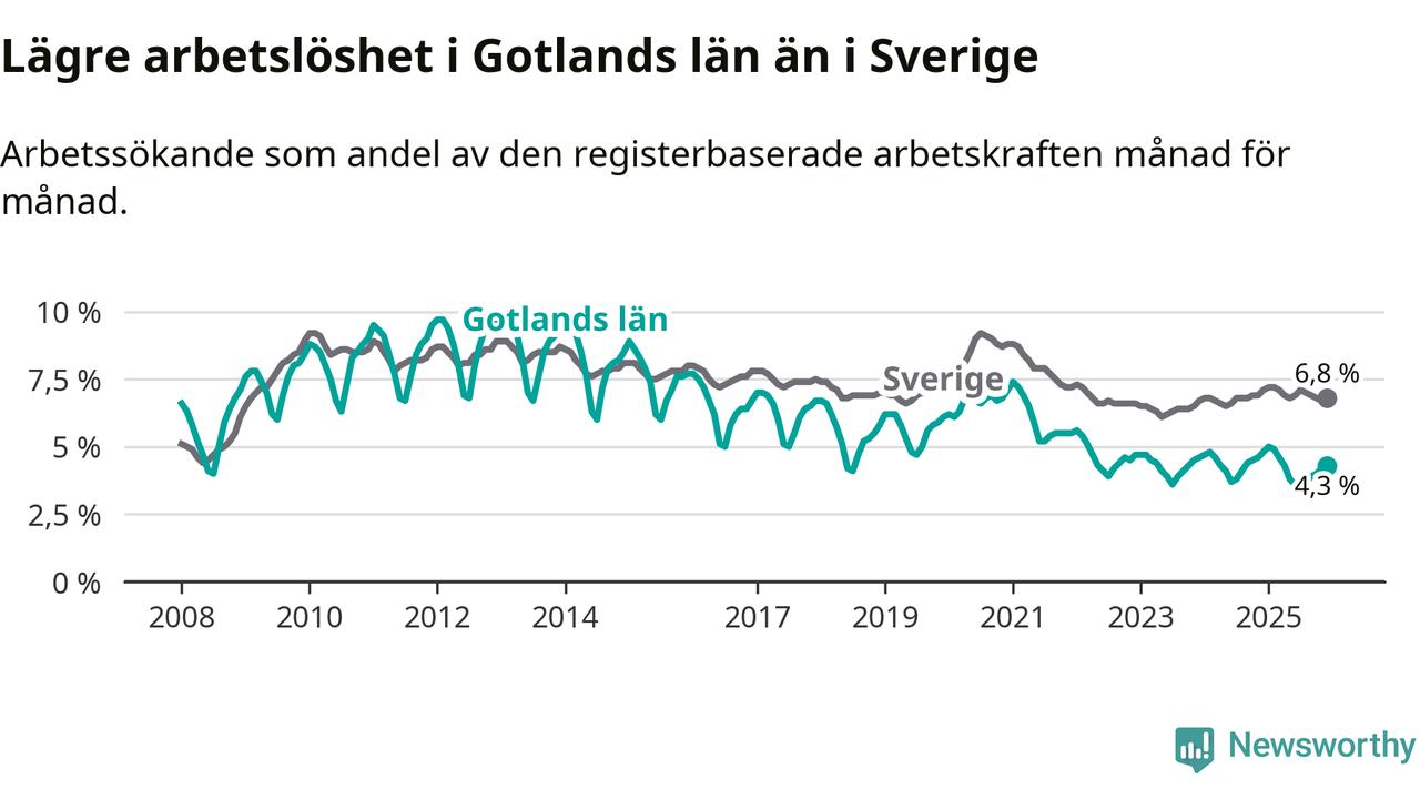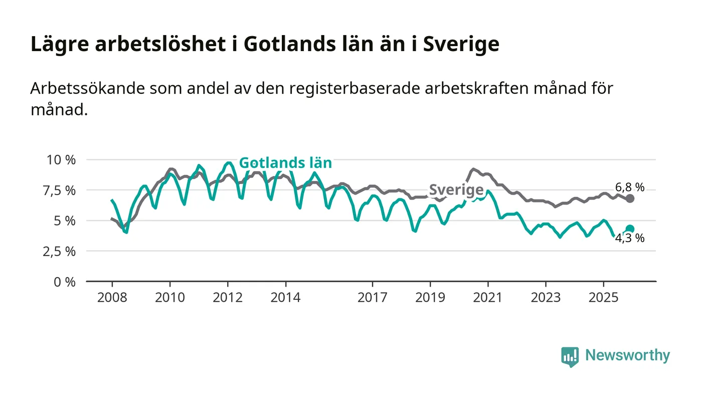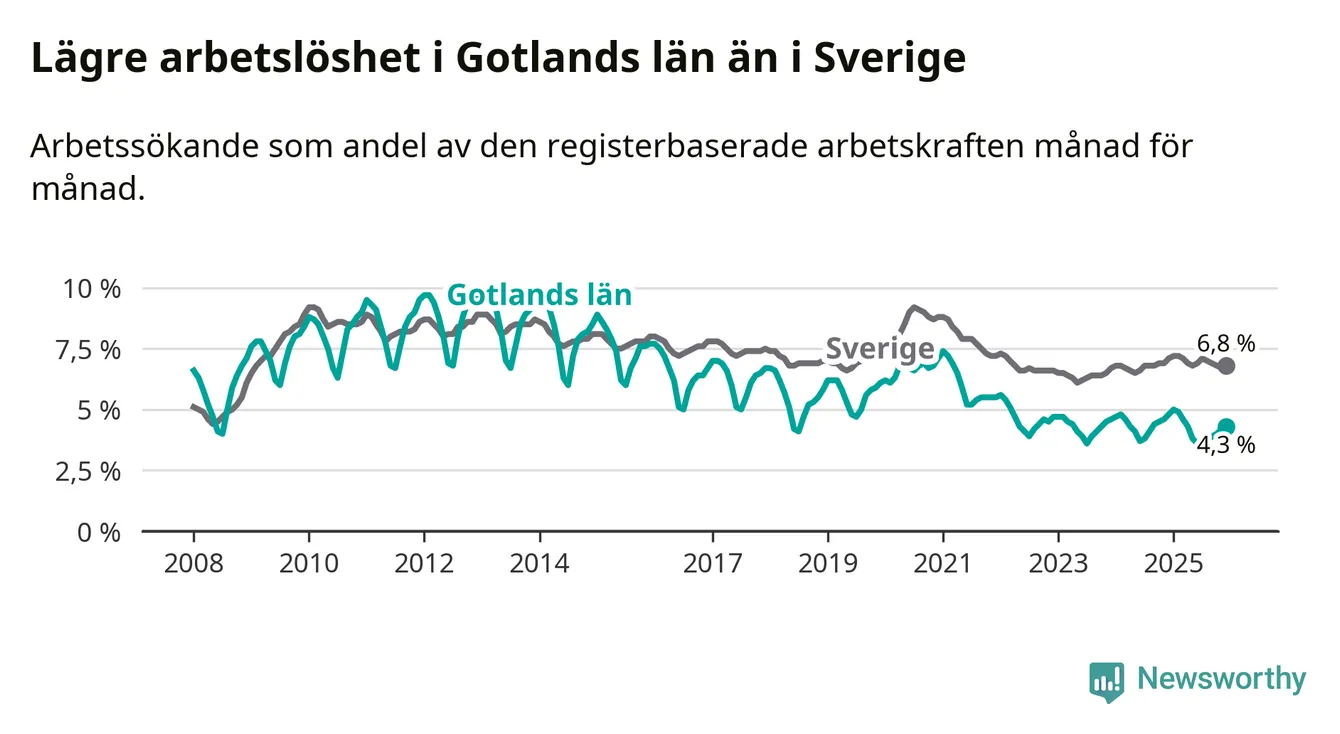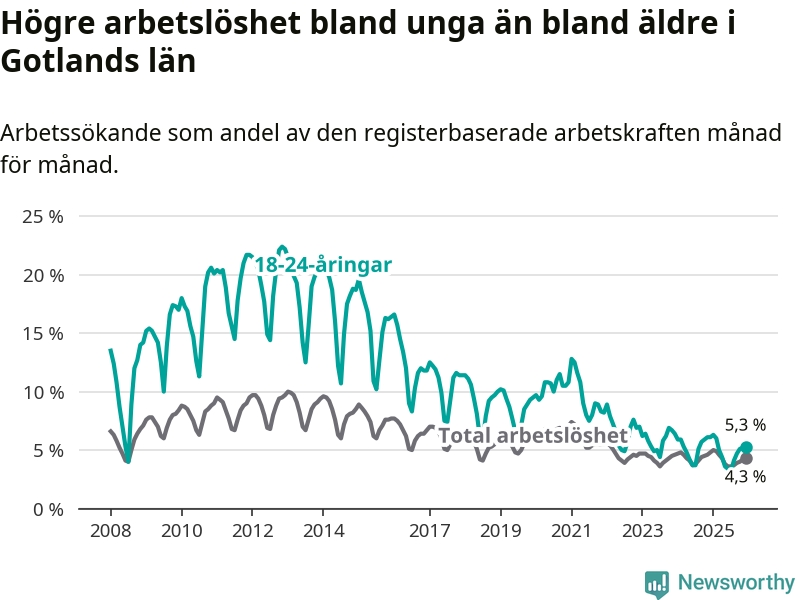 I och med den senaste månadens nedgång har de ungas arbetslöshet på Gotland sjunkit tio månader i följd (ner från 6,0 procent i februari 2025 till 5,3 procent nu).