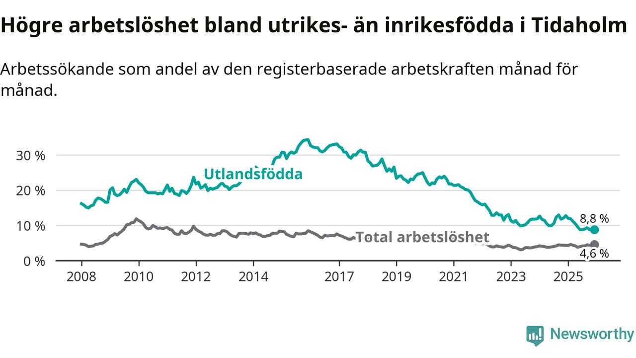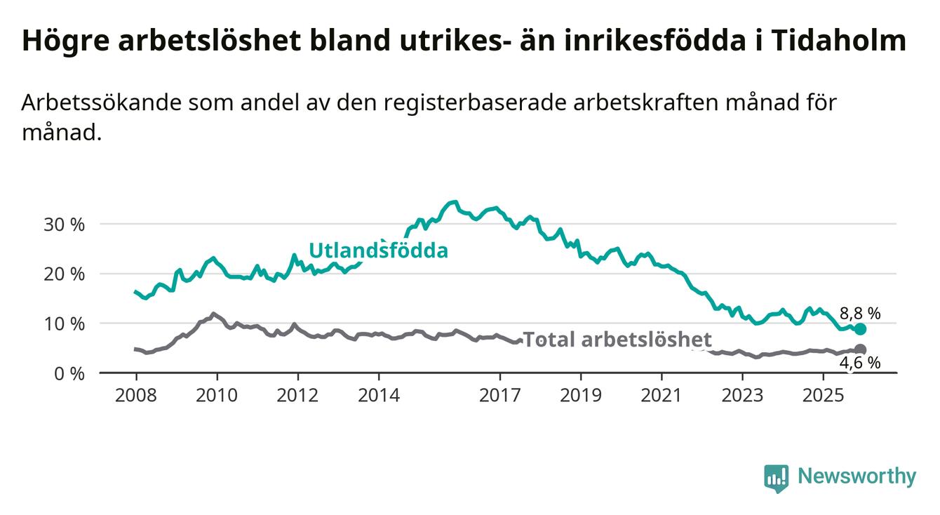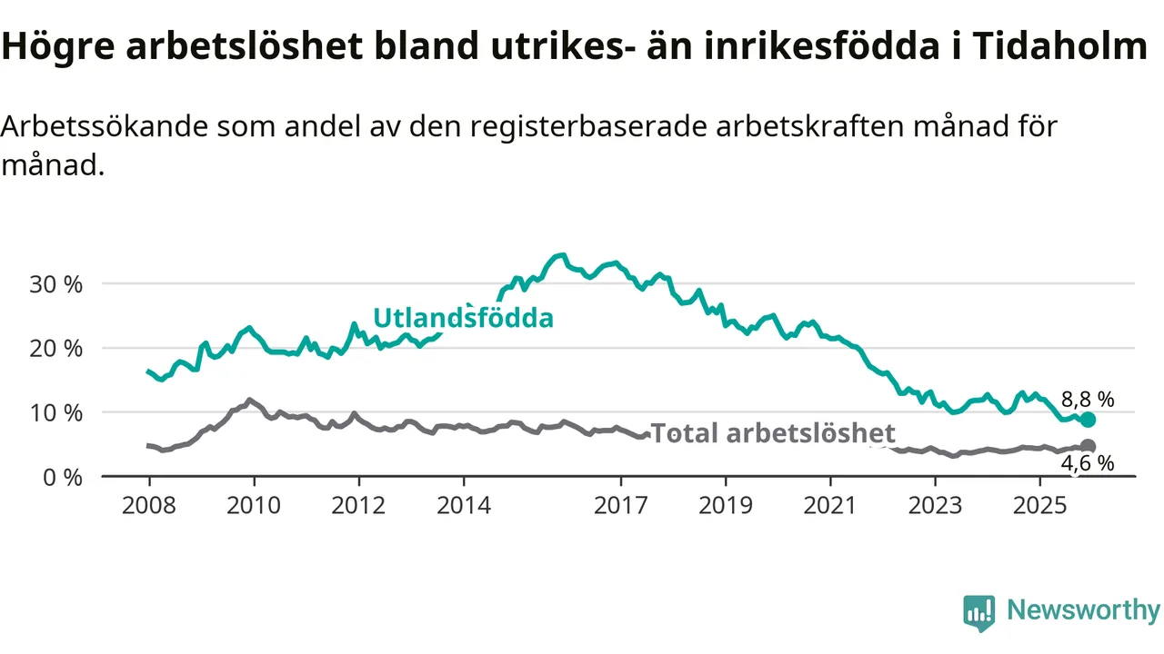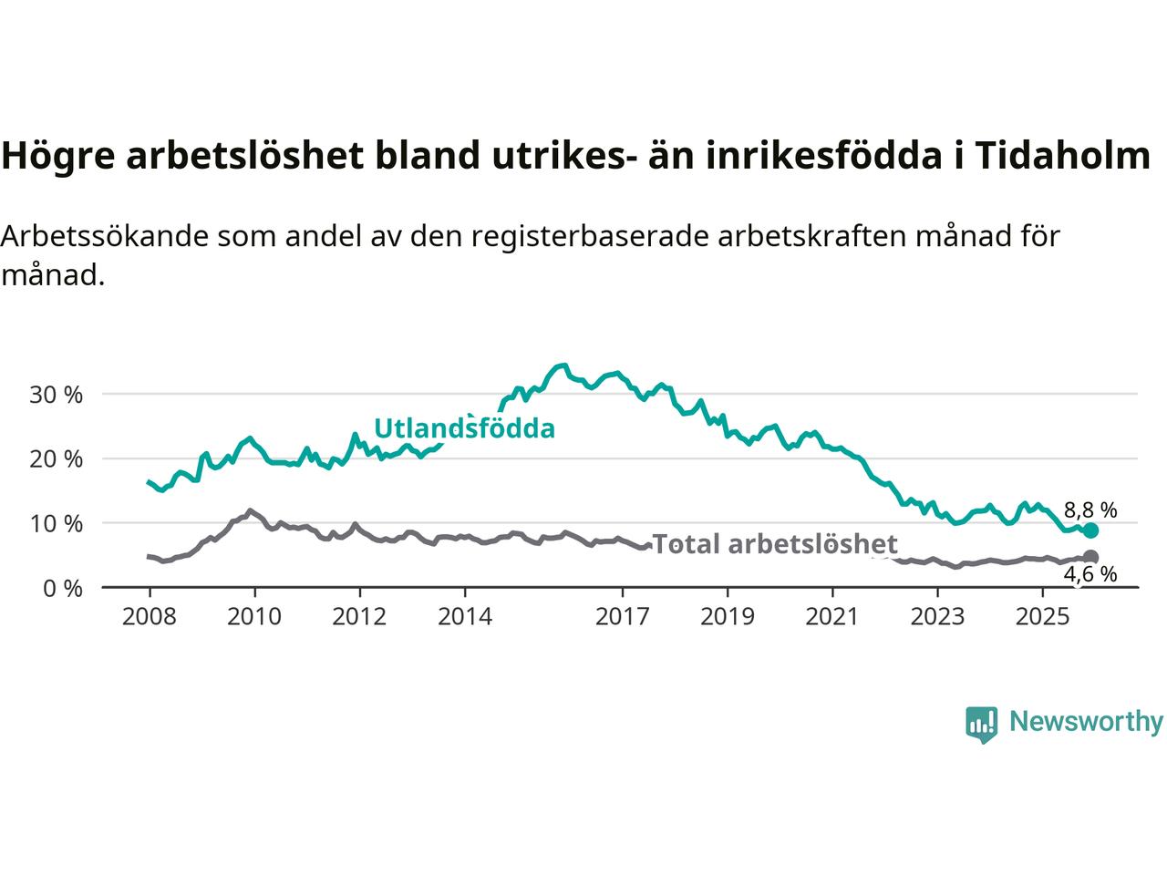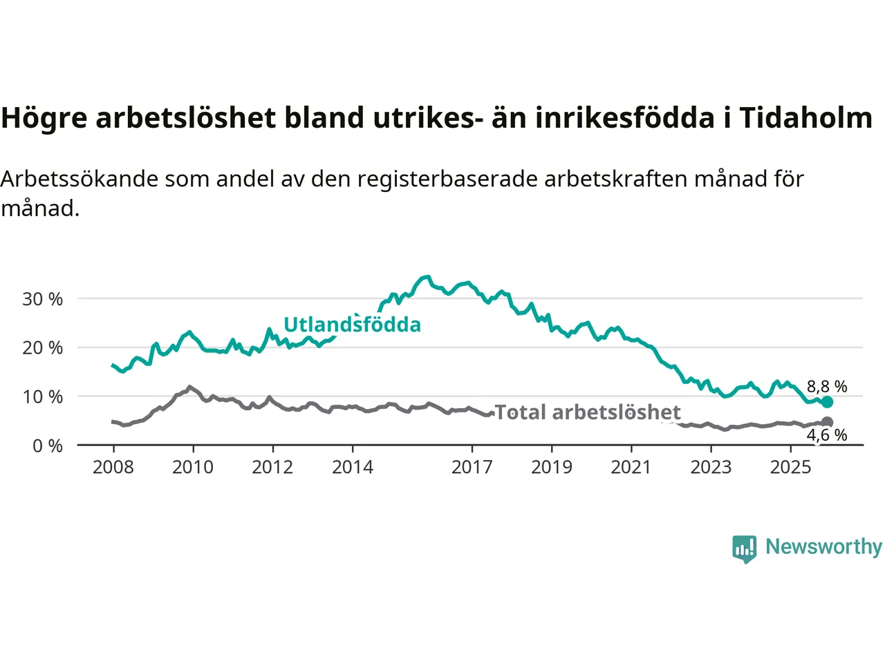 Arbetslösheten bland utlandsfödda var 8,8 procent i Tidaholm under december månad, motsvarande 66 av 750 personer. Det är 4,0 procentenheter färre än vid samma tidpunkt i fjol (−32 om man räknar personer). Därmed är de utlandsföddas arbetslöshet lägre än vid samma tidpunkt i fjol för åttonde månaden i följd. Sedan april 2025 har arbetslösheten bland utlandsfödda minskat från 10,5 till 8,8 procent.