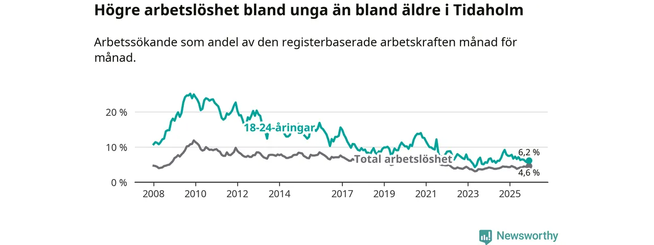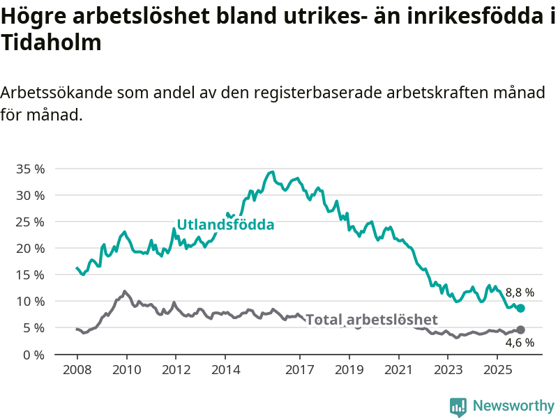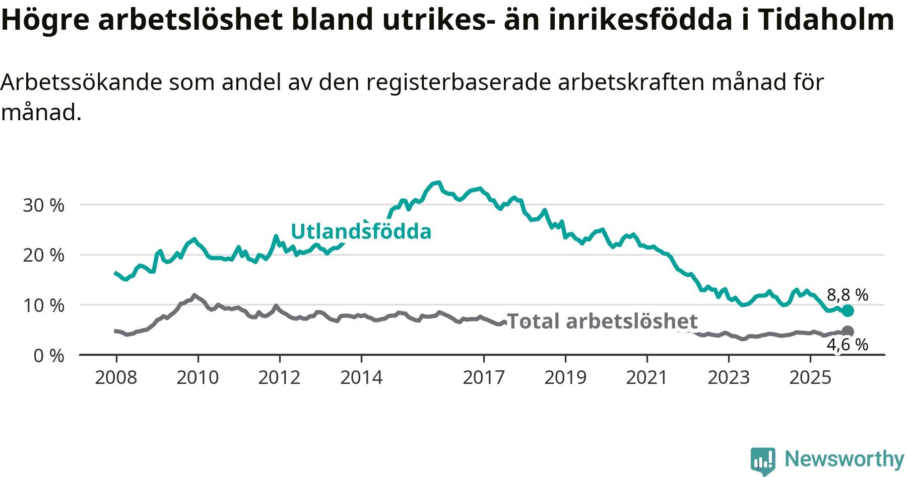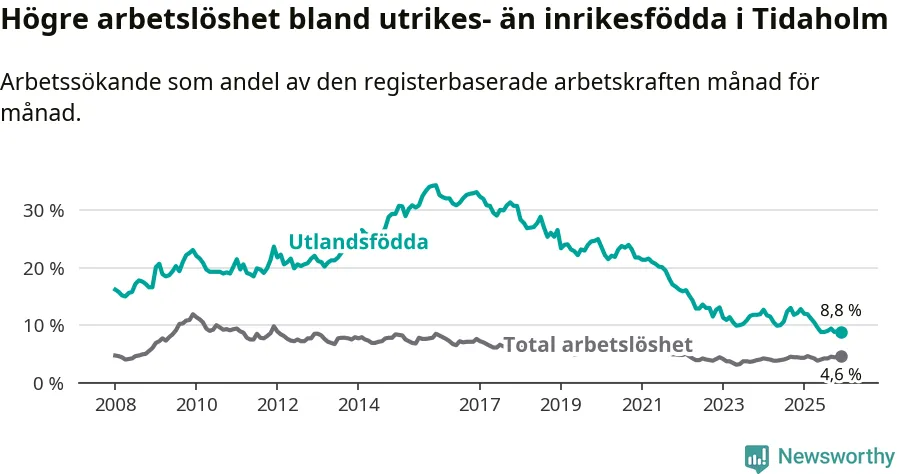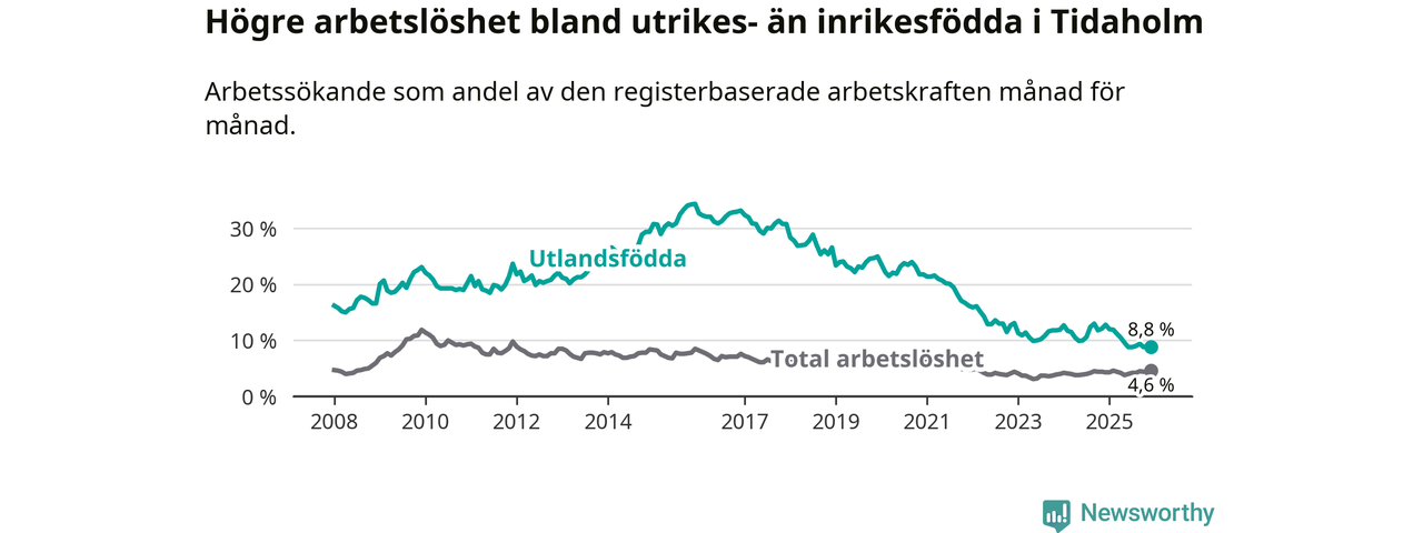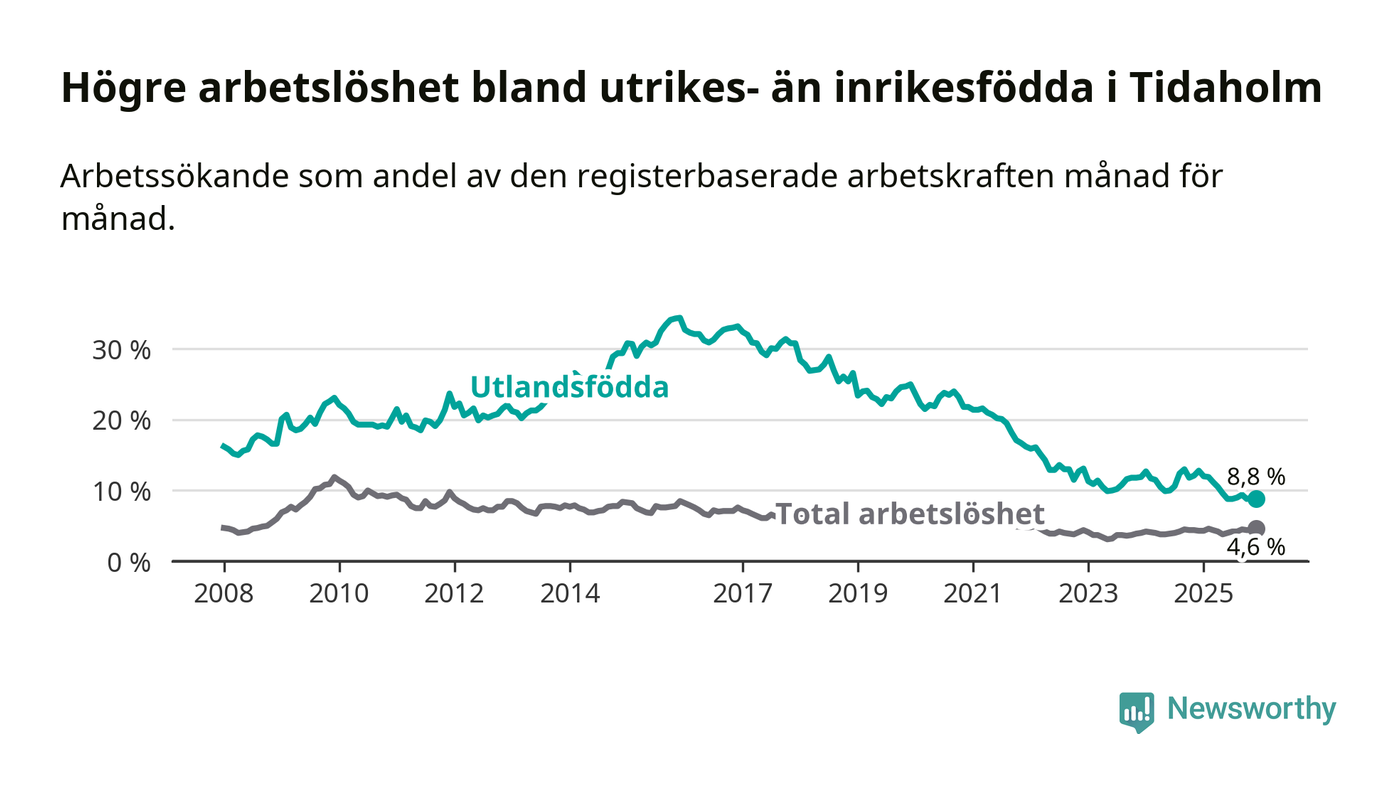 Arbetslösheten bland utlandsfödda var 8,8 procent i Tidaholm under december månad, motsvarande 66 av 750 personer. Det är 4,0 procentenheter färre än vid samma tidpunkt i fjol (−32 om man räknar personer). Därmed är de utlandsföddas arbetslöshet lägre än vid samma tidpunkt i fjol för åttonde månaden i följd. Sedan april 2025 har arbetslösheten bland utlandsfödda minskat från 10,5 till 8,8 procent.
